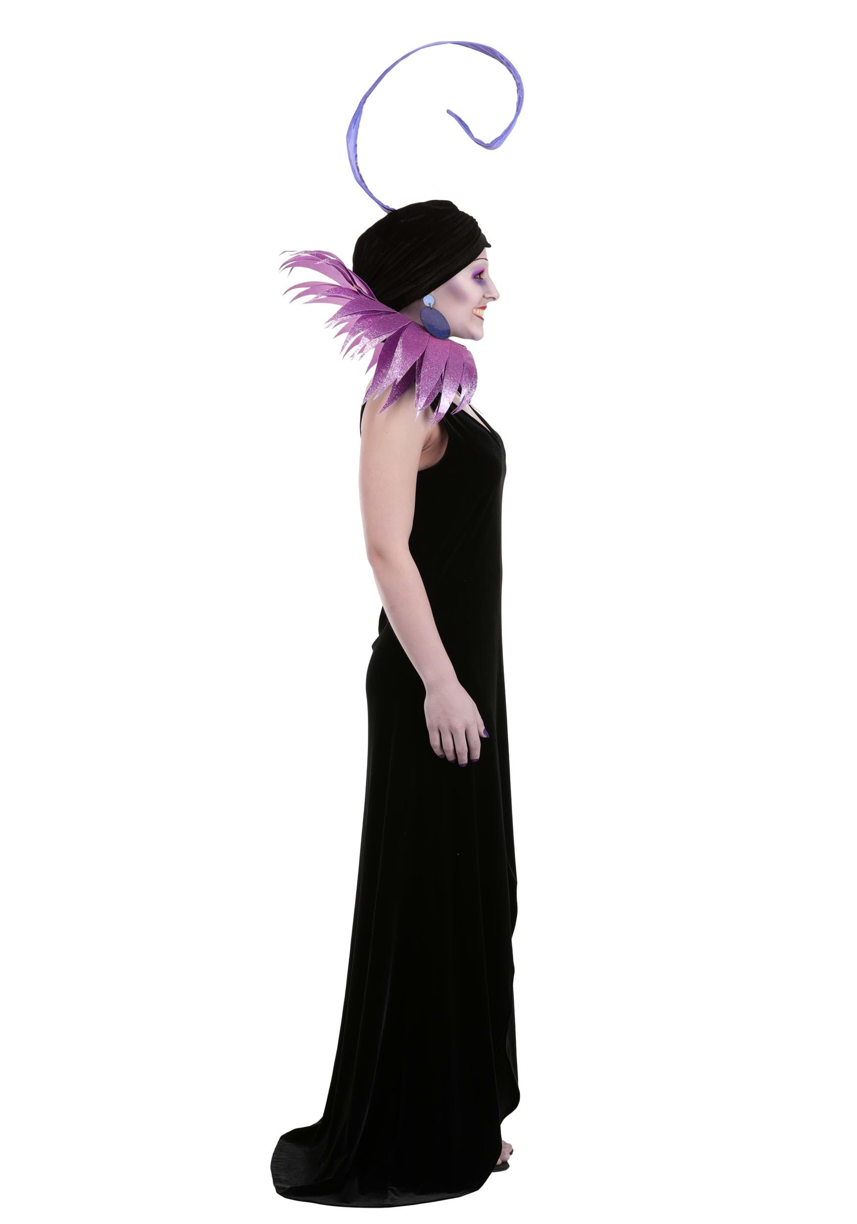 Dressing like Yzma is easy with the licensed dress and accessories in this costume. A long pullover dress made from black stretch velvet starts the dramatic look with a V-neckline, deep-scoop back, and knee-high opening in the front. The headpiece has wired-satin on top, giving fans a curl like Yzma's. Meanwhile, a hook-and-loop fastened collar featuring layers of glittery felt feather ruffles. Earrings with large medallions complete the look.