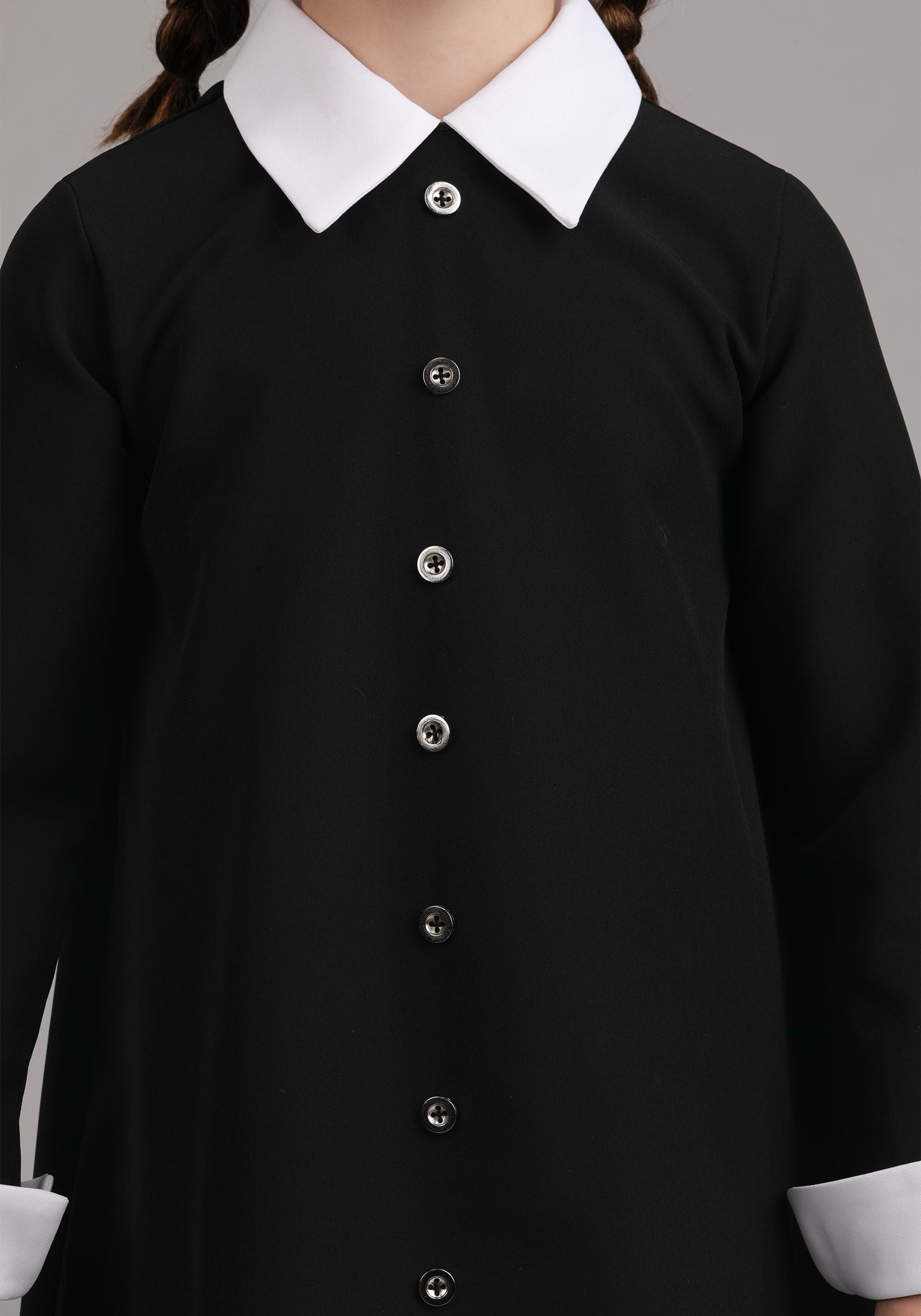 The crisp white collar and sleeve cuffs are made from poly woven fabric, providing the iconic black-and-white contrast that defines Wednesday’s signature style. The collar secures at the back with a small button and elastic loop, making it easy to fasten without compromising on fit or comfort.