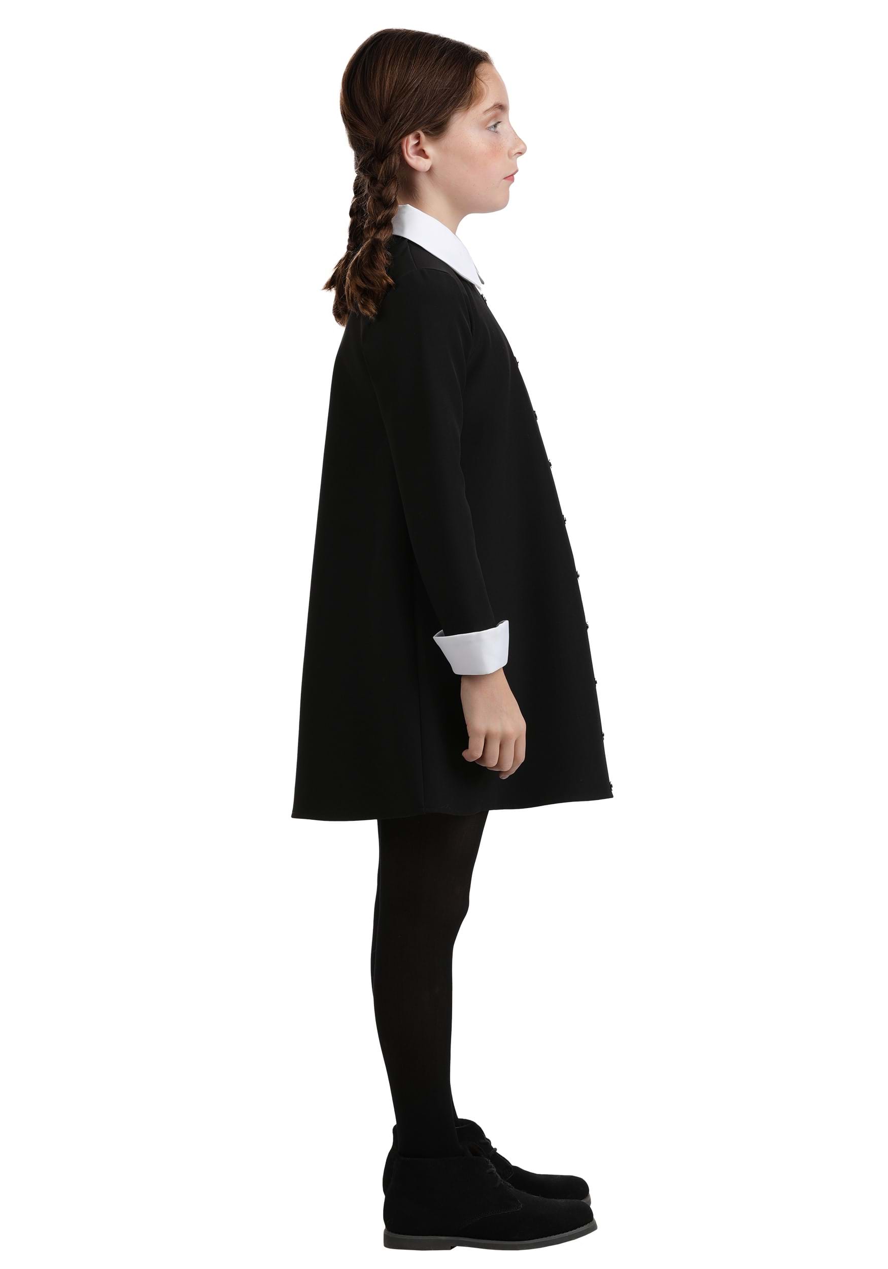 Made from a blend of 90% polyester and 10% spandex, the dress is crafted from stretchy jersey knit that offers a comfortable fit with a structured look. The pullover design is easy to wear, while the center front is detailed with faux buttons for that buttoned-up, no-nonsense aesthetic Wednesday is known for. It’s a balance of old-school charm and child-friendly comfort that’s ideal for little Addams in training.