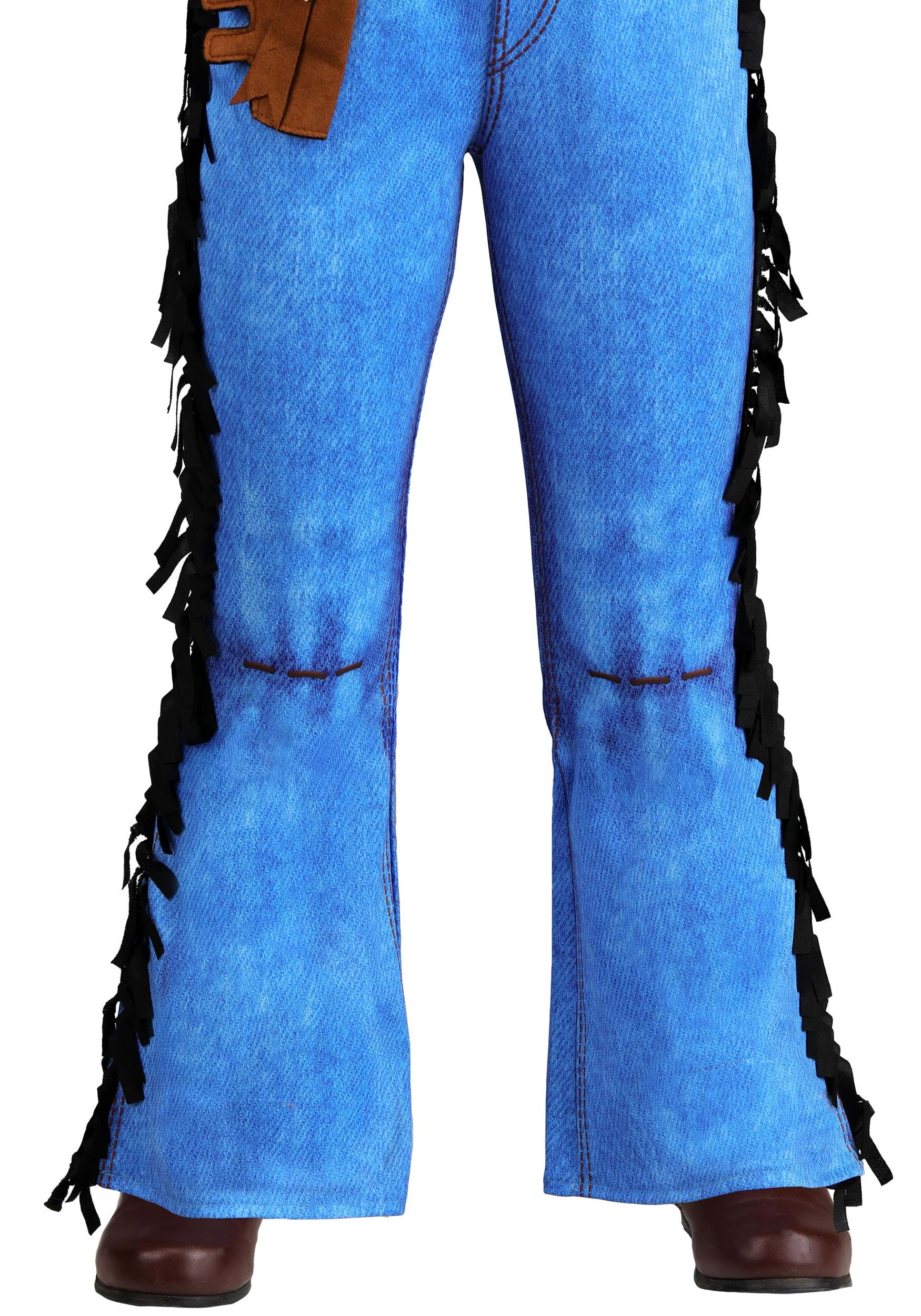 The costume includes a bright pullover shirt with button accents, stretchy puffed sleeves, and a back closure. A faux cowhide vest adds flair, while fringe-trimmed pants and a soft belt with gold buckle complete the frontier-ready look. The slide-on holster, red scarf, and stitched cowboy hat all combine to make an amazing Halloween adventure under the stars.