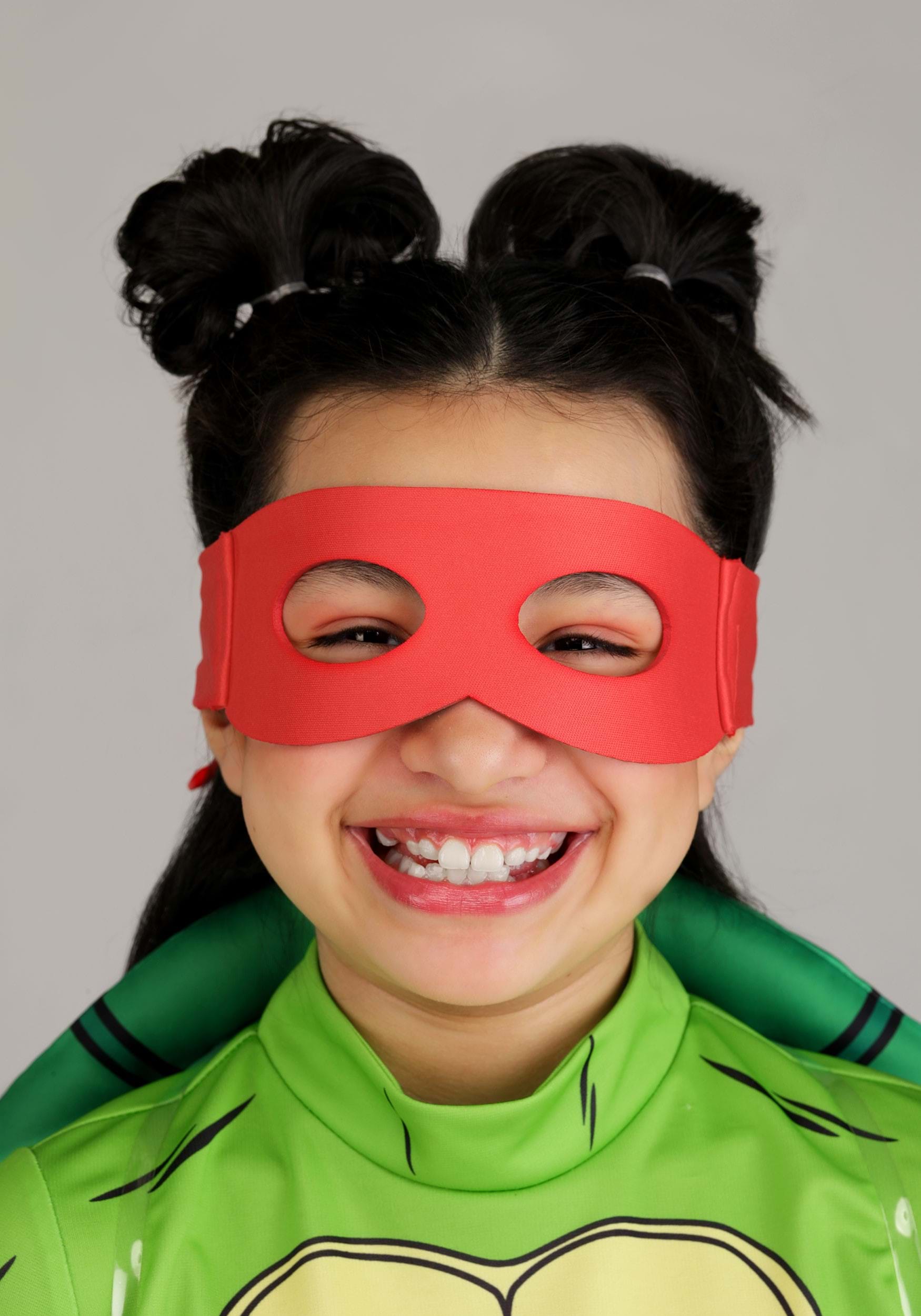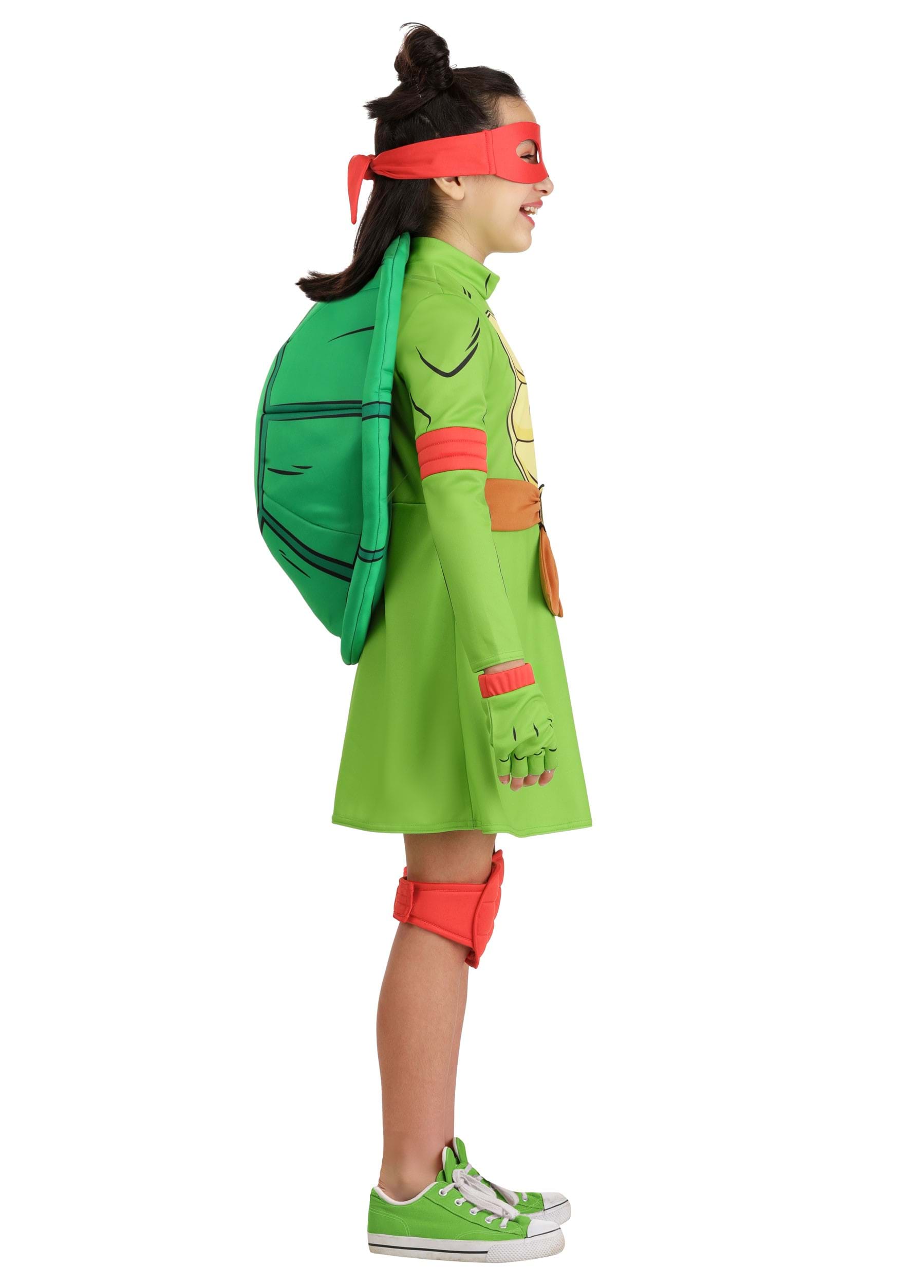 This officially licensed costume includes everything a young Raphael needs to complete the look: a red eye mask for that trademark scowl-ready expression, padded red knee guards, and green gloves with red wrist wraps for a punch of classic TMNT style. The foam turtle shell attaches to the back of the dress, giving her a heroic silhouette worthy of a sewer-dwelling super-team.