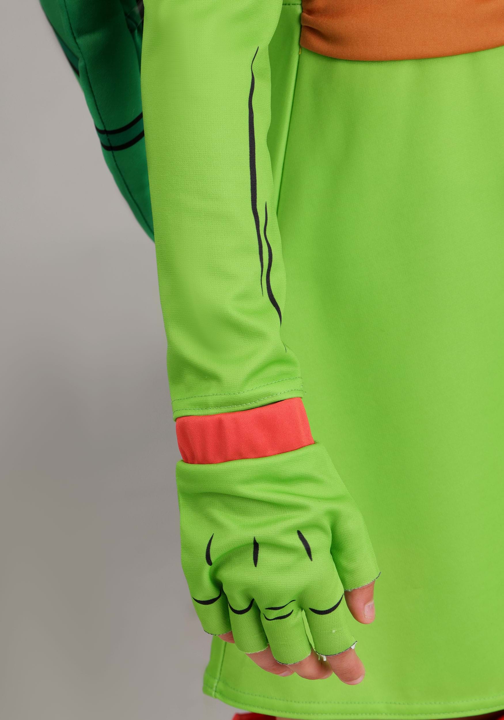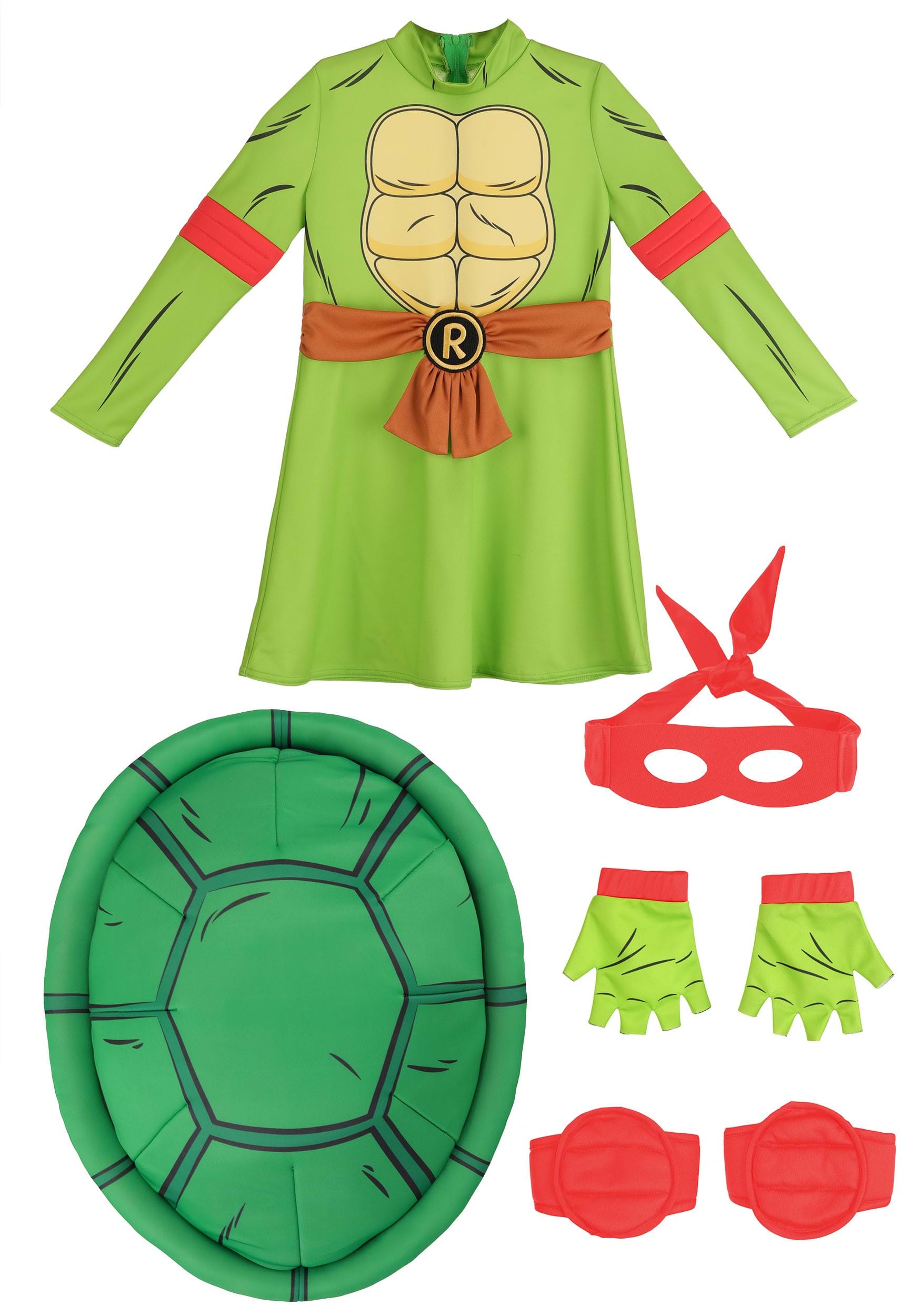 The costume dress is crafted from soft, stretchy ponte and jersey knit fabrics, combining cozy comfort with kid-tough durability. The printed turtle shell design on the chest pairs perfectly with the “R” belt graphic at the waist, giving her a stylized nod to Raphael’s muscle-bound might. A full zipper in the back makes it easy to suit up quickly—because real ninja heroes don’t waste time!