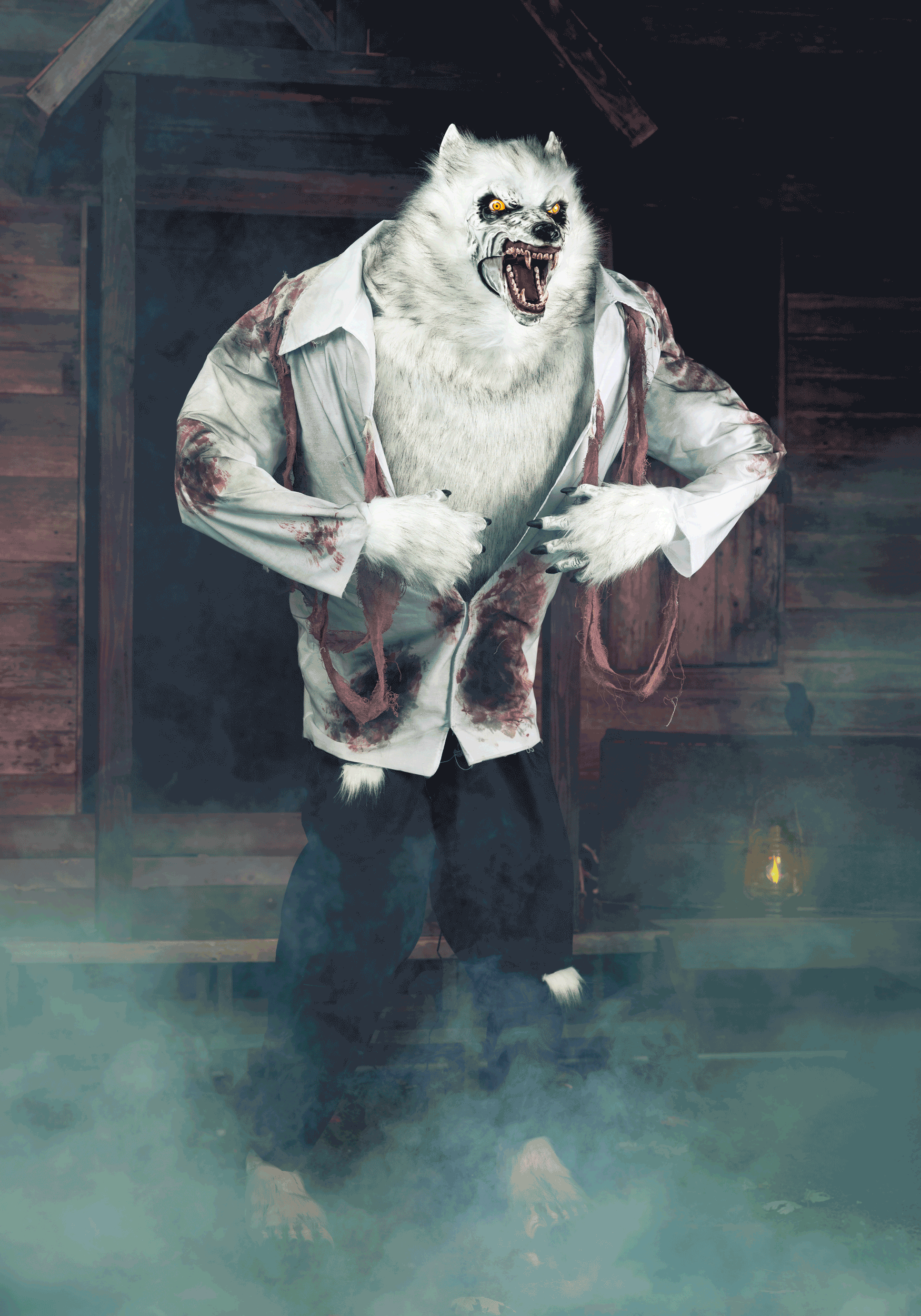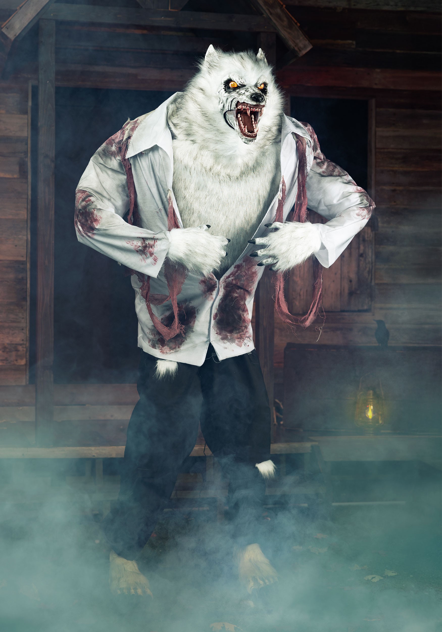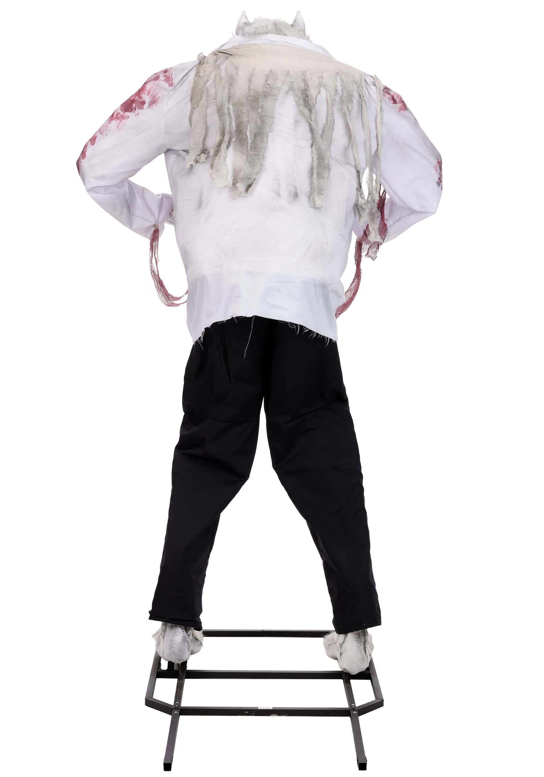 Constructed from a durable metal stand, plastic framework, polyester fabric, and realistic faux fur, this werewolf withstands seasonal decorating demands. Display it indoors for intimate scares or position it in covered outdoor areas like porches and patios. When using outdoors, ensure connection to a GFCI outlet for safe operation and protect from direct water exposure to maintain its frightening features throughout the Halloween season.