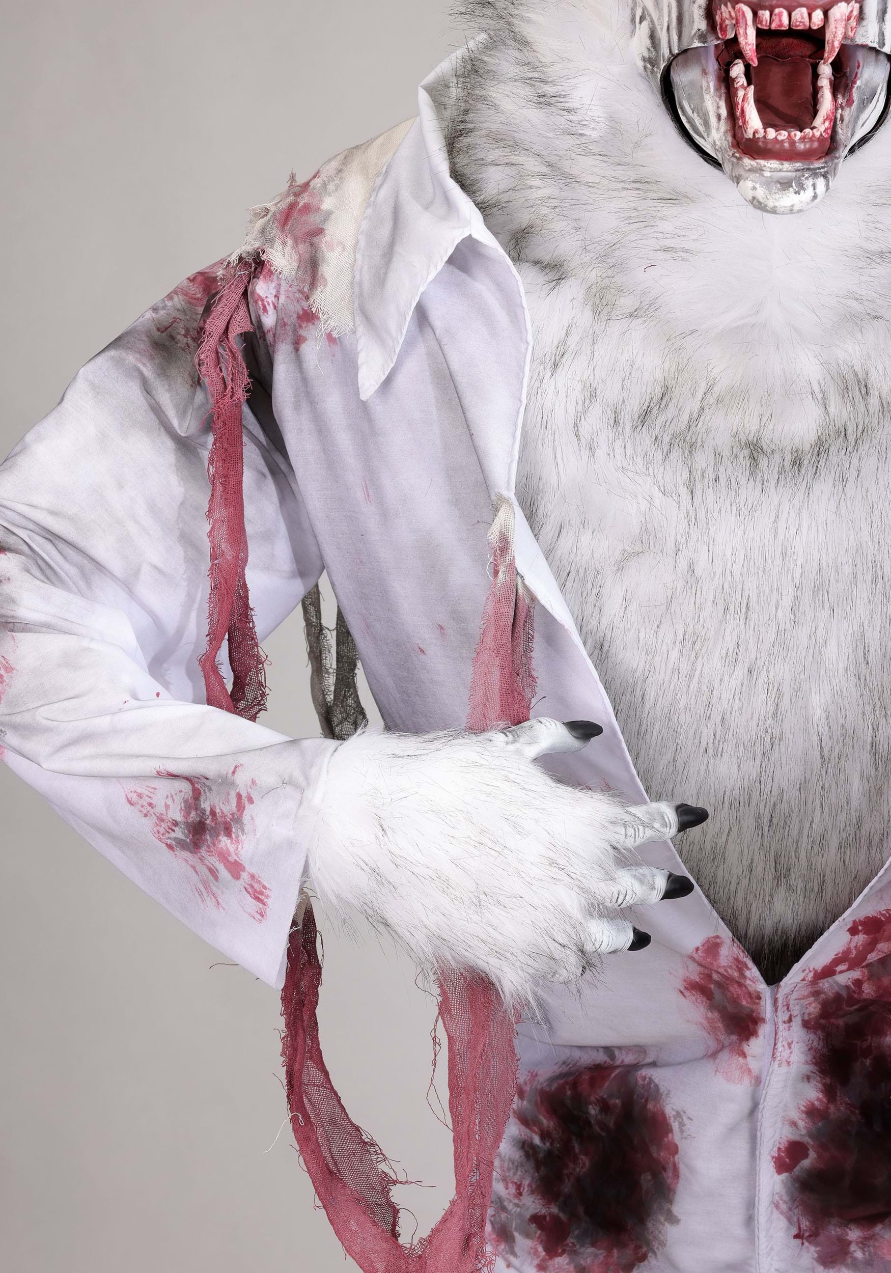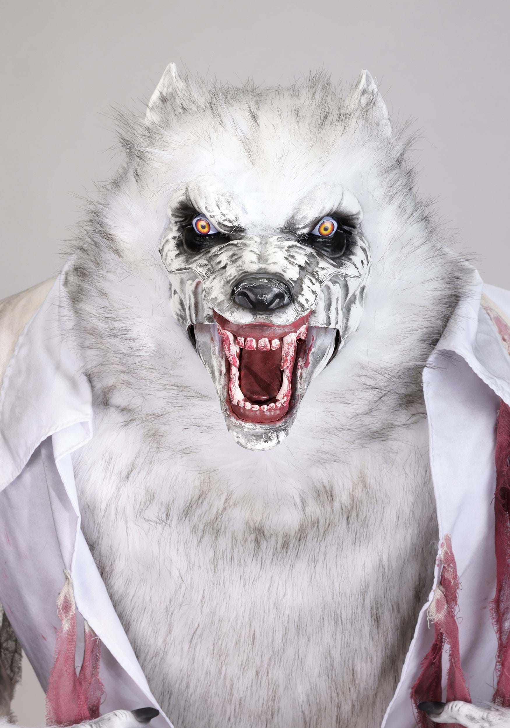 When the moon rises and shadows grow long, something sinister prowls your Halloween domain. This Howling White Werewolf Animatronic Decoration stands an imposing 7 feet tall, bringing legendary lycanthrope terror to life with spine-chilling realism. Dressed in a tattered burgundy shirt stained with ominous dark patches, this savage creature combines classic monster movie atmosphere with modern animatronic technology. Whether greeting trick-or-treaters or anchoring your haunted house experience, this werewolf commands attention with its menacing presence and bone-rattling performance.