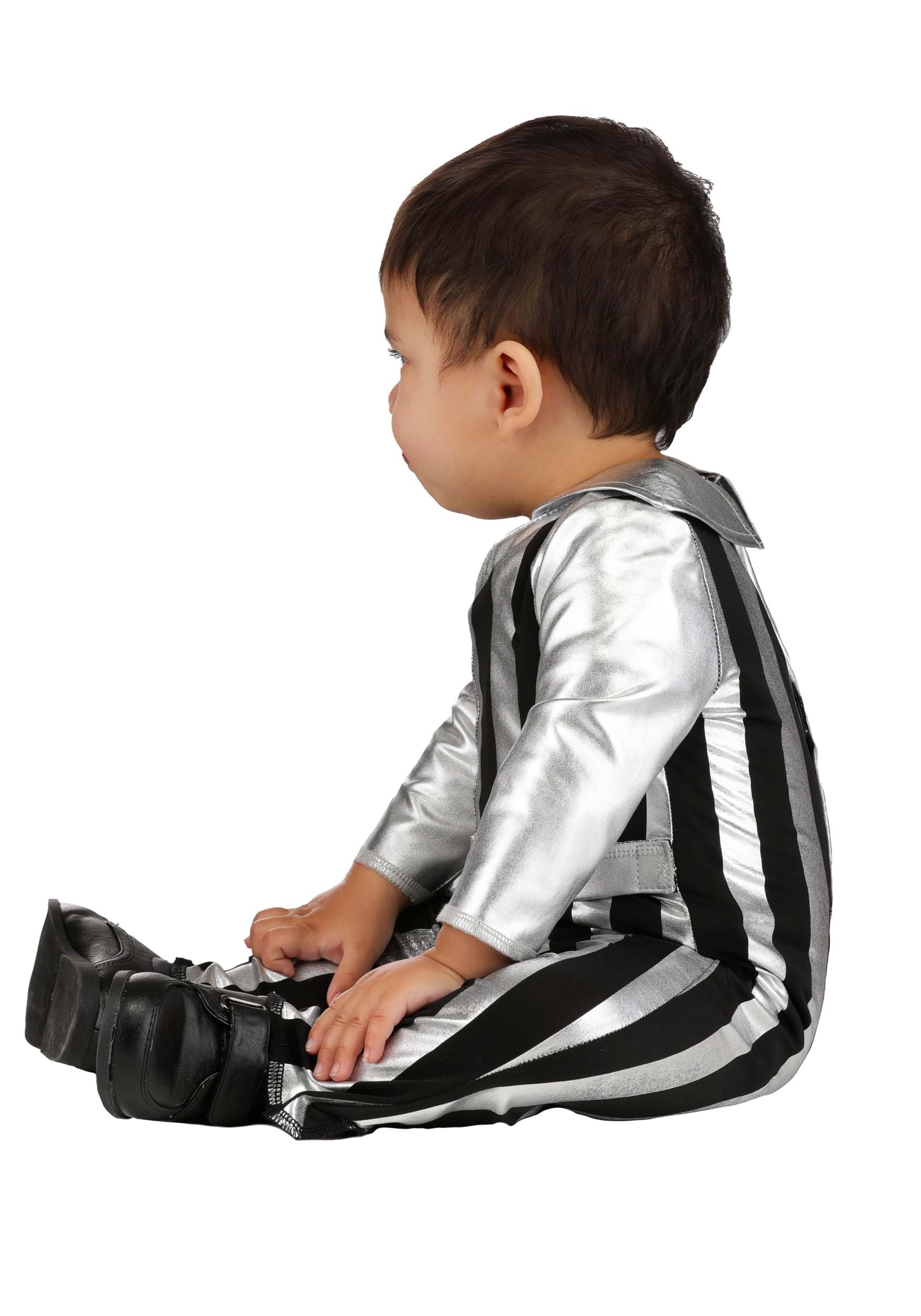 The one-piece jumpsuit is made from a stretchy blend of 94% polyester and 6% spandex, so it moves with your baby while keeping that iconic disco look. Vertical black and silver metallic stripes give it eye-catching style, and flared pant legs add that unmistakable ‘70s vibe.