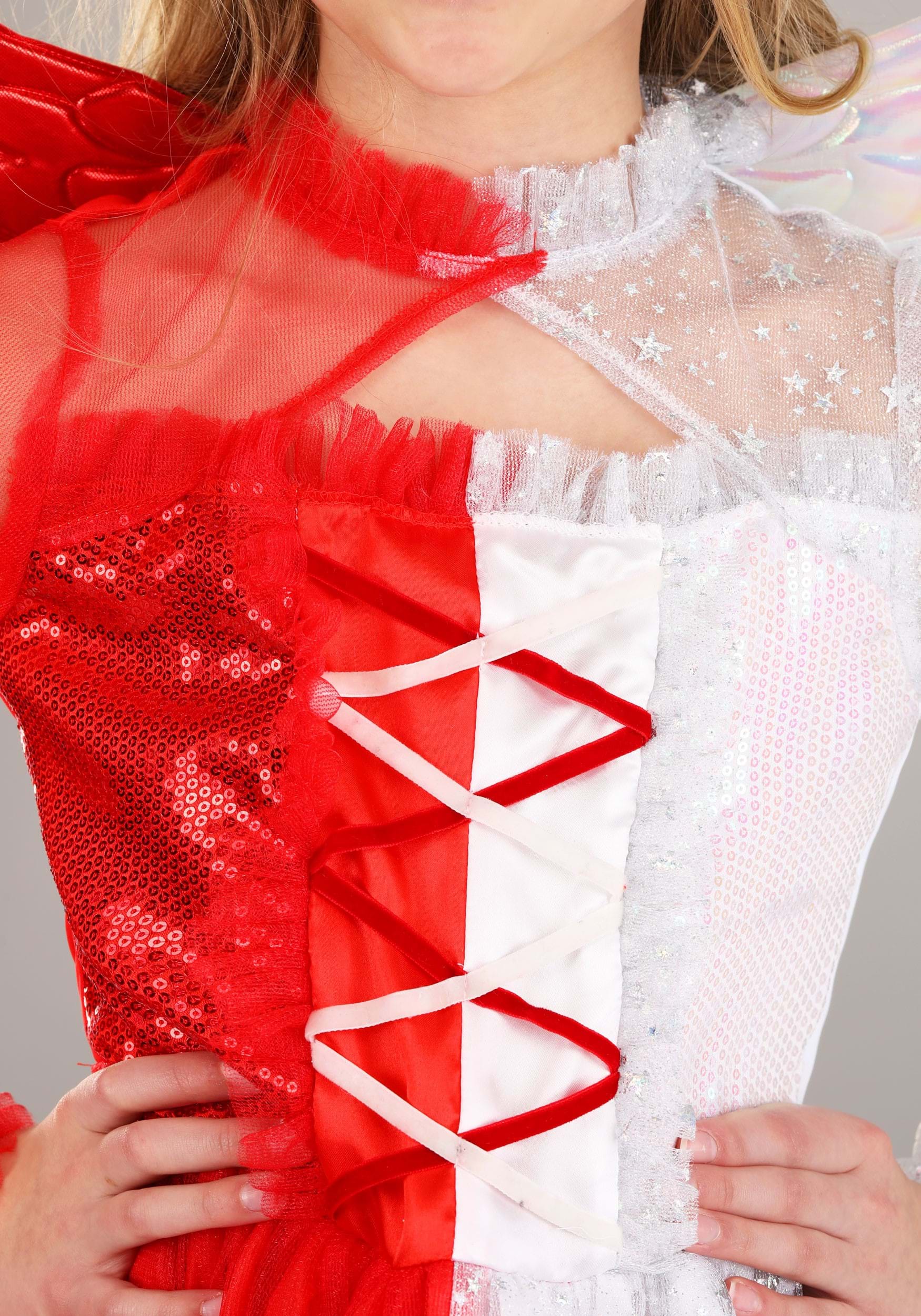 This exclusively designed costume starts with a 100% polyester dress that's white on one side and red on the other. Its satin bodice has a jersey-knit back panel with hook-and-loop fasteners for easy and comfortable dressing. The front of the bodice is covered in sequins and features velvet ribbon, a keyhole collar, and ruffled trim. Long tulle bell sleeves add sheer coverage to arms, while a layered, high-low skirt completes the charming style.