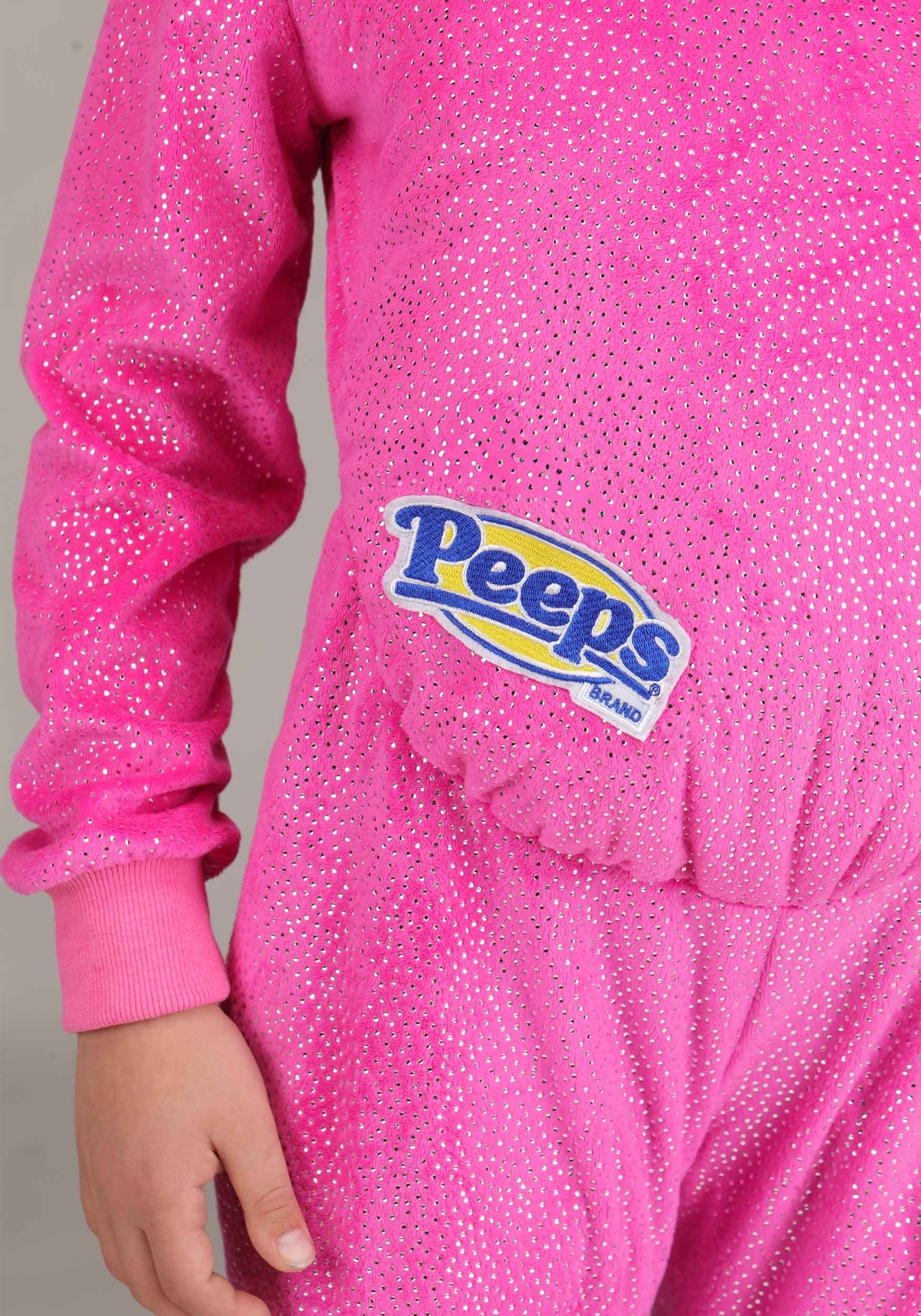 The bright pink jumpsuit is made of soft polyester and sprinkled with a sparkly design that mimics the sugary coating of a real Peeps bunny. The rib knit cuffs at the wrists and ankles keep the fit snug and comfortable, while the Peeps logo on the front adds an authentic finishing touch straight from the candy box.