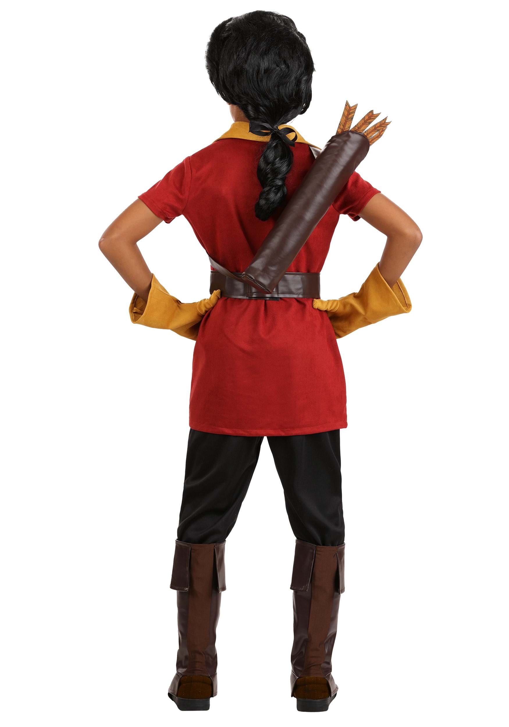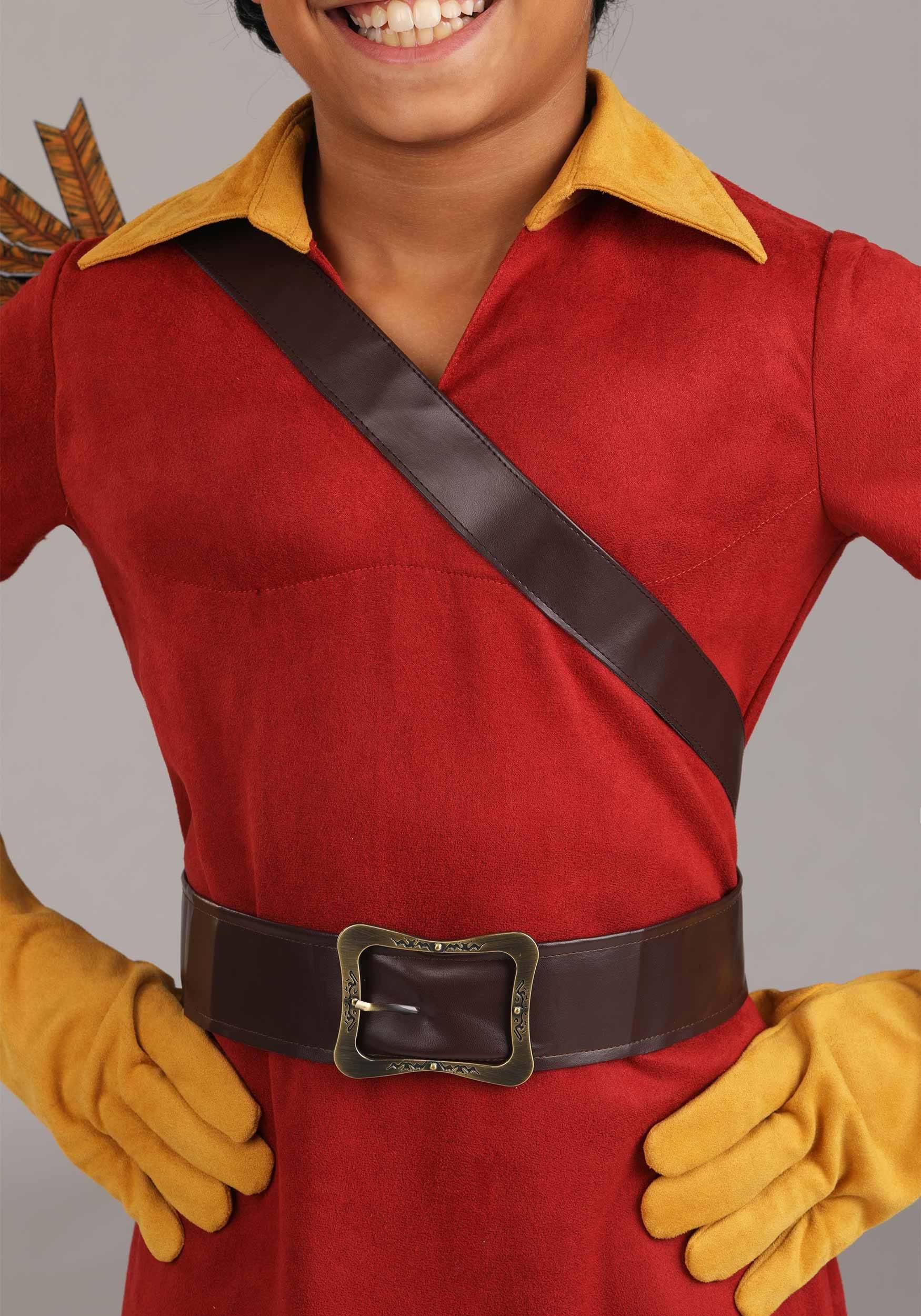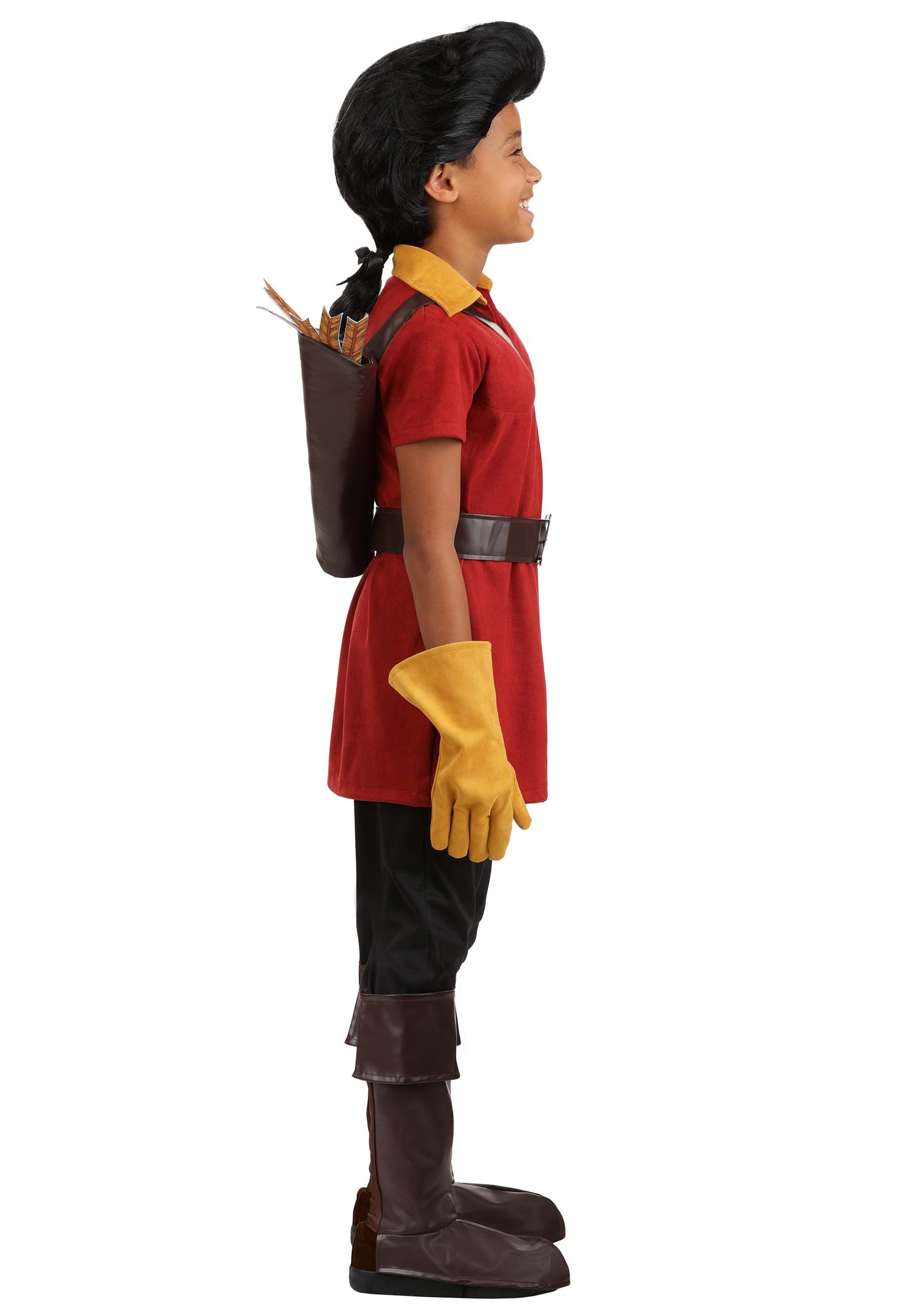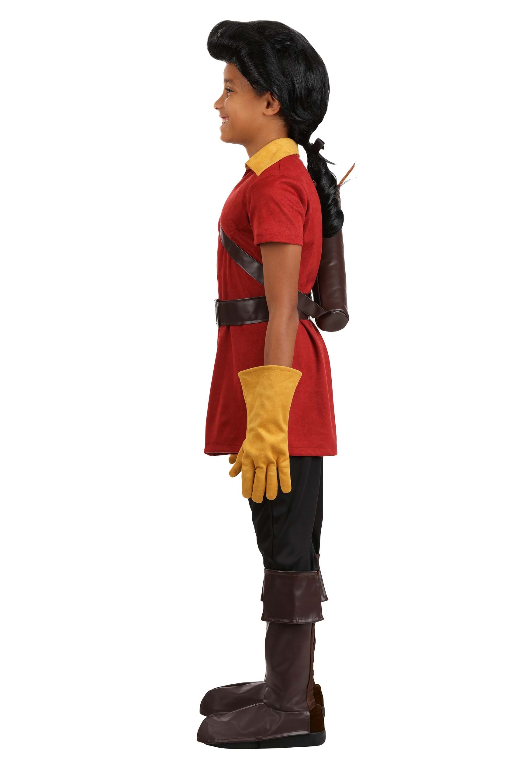 This Disney Gaston costume sets the scene with a stretch brushed suede tunic, shaped by fiberfill padding to highlight a heroic chest, while a gold-tone collar adds contrast. The dark jersey pants feature an elastic waist for a flexible fit. Matching gloves with flared cuffs add flair, while faux leather boot covers provide a rugged finish. A quiver with a shoulder harness and printed felt arrows adds adventure, and the signature wig completes the look.