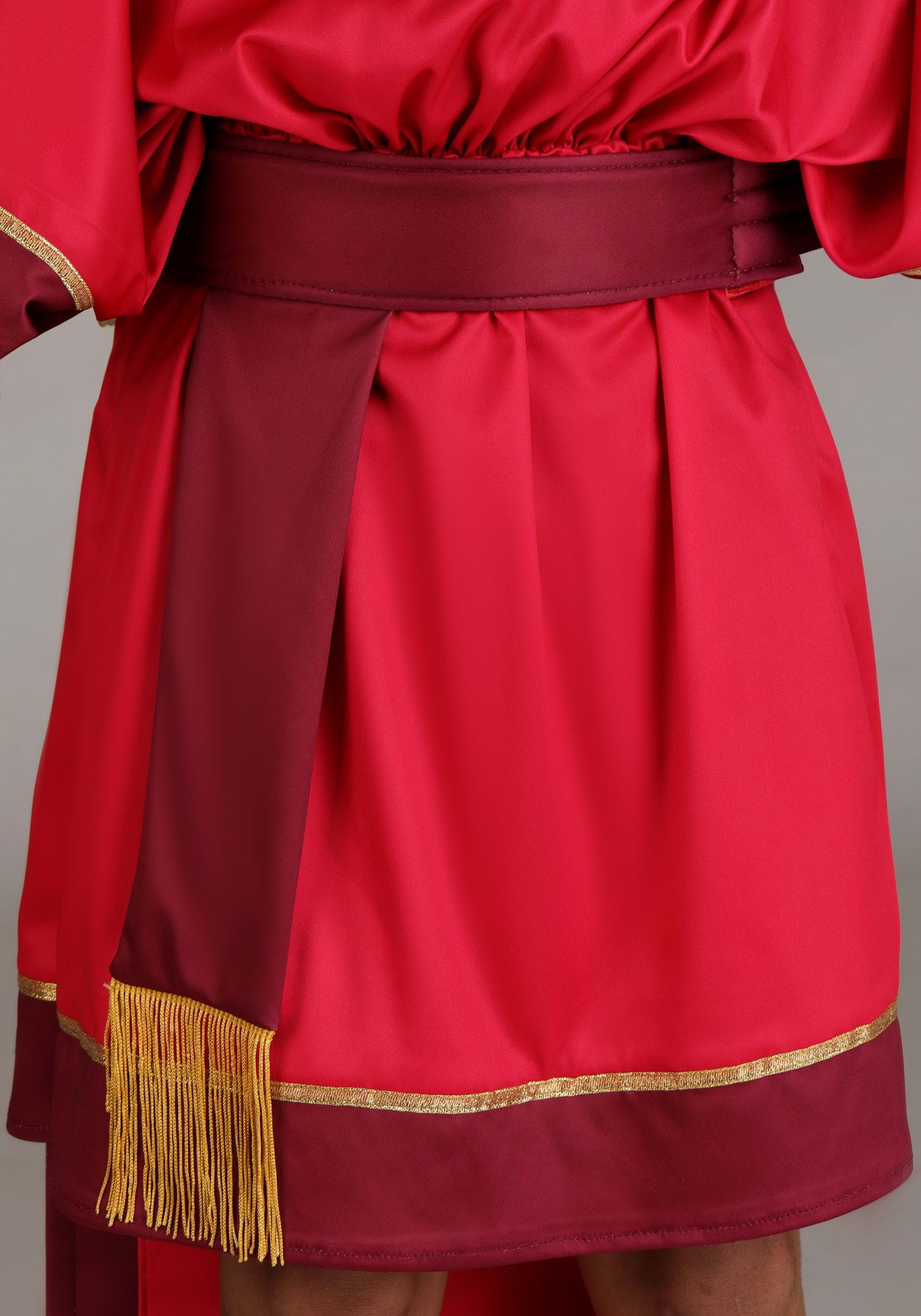 This Kuzco costume features a red tunic that pops with metallic gold details and dark rose accents, while a hanging back panel adds show-stopping flair. It also comes with clip-on earrings, gold fringe ankle cuffs, and a foam-backed headpiece with a fan-shaped crest. It's a fun, detailed look that's perfect for any fan of Disney's sassiest royal.
