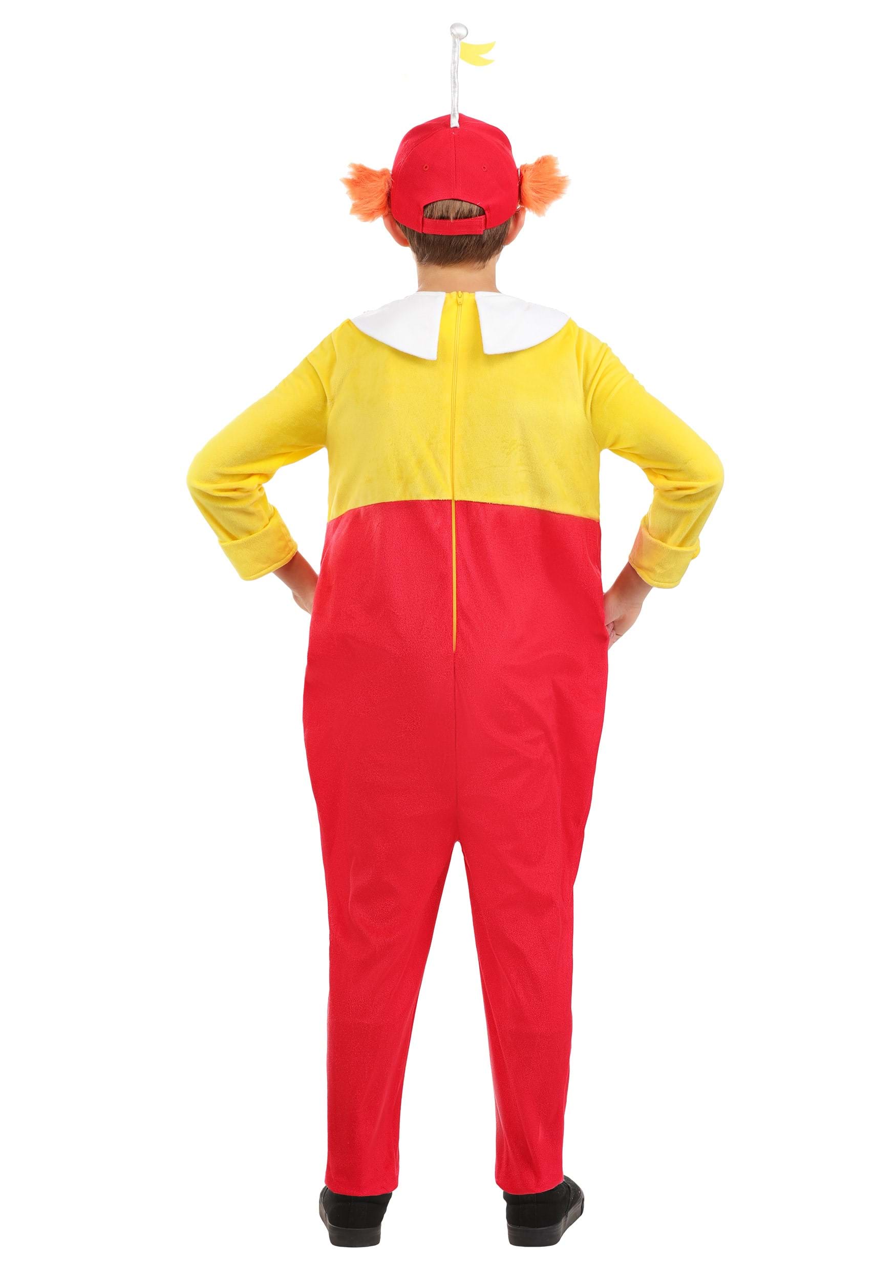 This Disney Tweedle Dee and Tweedle Dum Costume for kids starts with a one-piece jumpsuit made for easy wear. The top is bright yellow, while the bottom half is red, creating the signature color-blocked style. A large white collar is sewn around the neckline, and a light blue oversized bow is attached to the front. The costume also includes a red hat with faux red hair and a small yellow flag.
