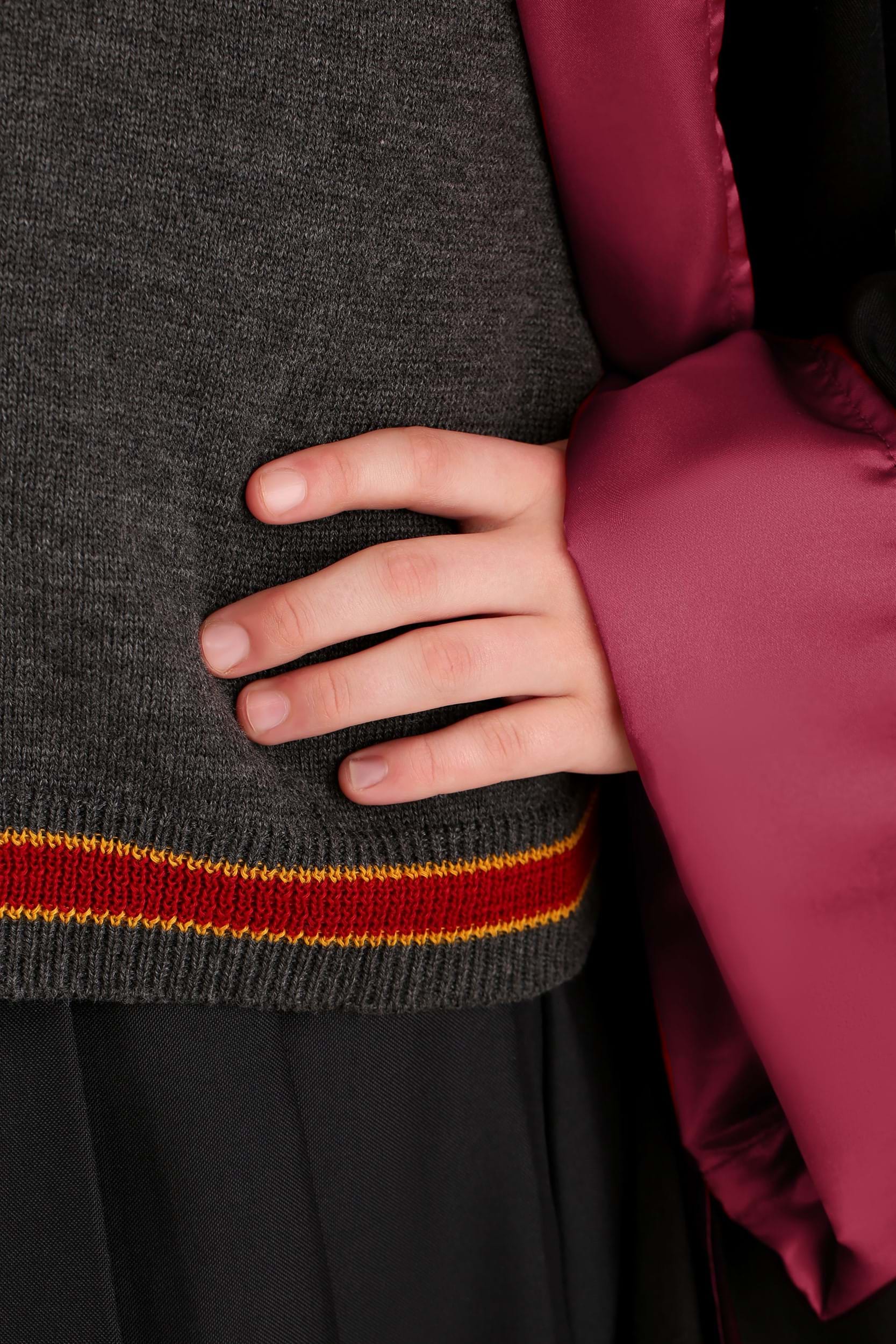 The V-neck soft knit sweater is not only cozy, but it also features the embroidered Gryffindor crest on the chest, ensuring that you'll look like a true Gryffindor student. The button-down center front allows for easy dressing, so you can quickly transform into Hermione and be ready for any magical adventure. The dickey, with its convenient hook and loop fastener, adds an extra layer of authenticity to your costume.