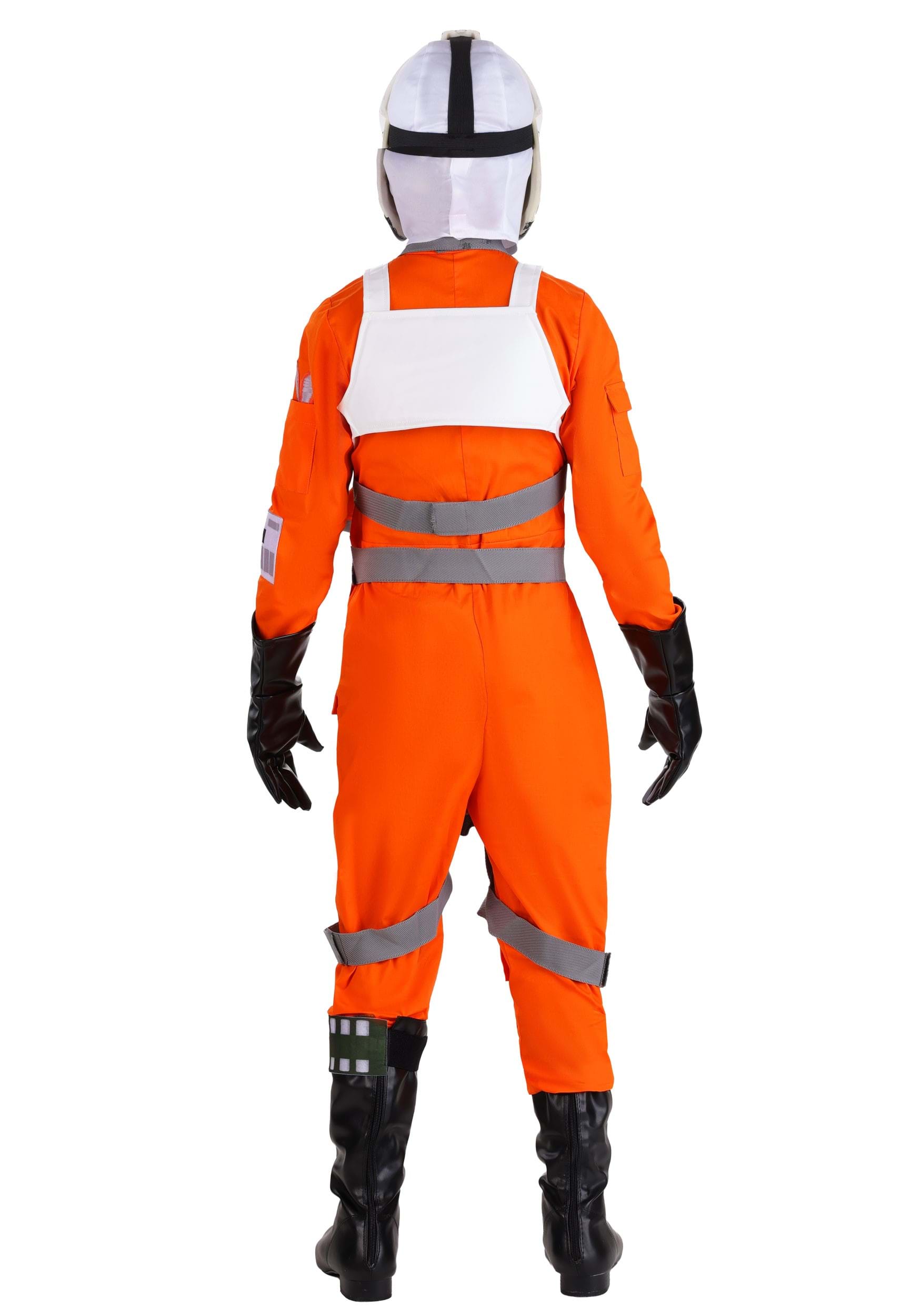 This suit is built for action: the orange stretch jumpsuit zips up the front, which is great because, let's face it, kids are not known for their patience with costume complexity. It's made of polyester poplin, and comes loaded with all the right stuff, like a felt leg wrap and patches that say, "Yes, I have absolutely flown an X-Wing, thanks for asking."