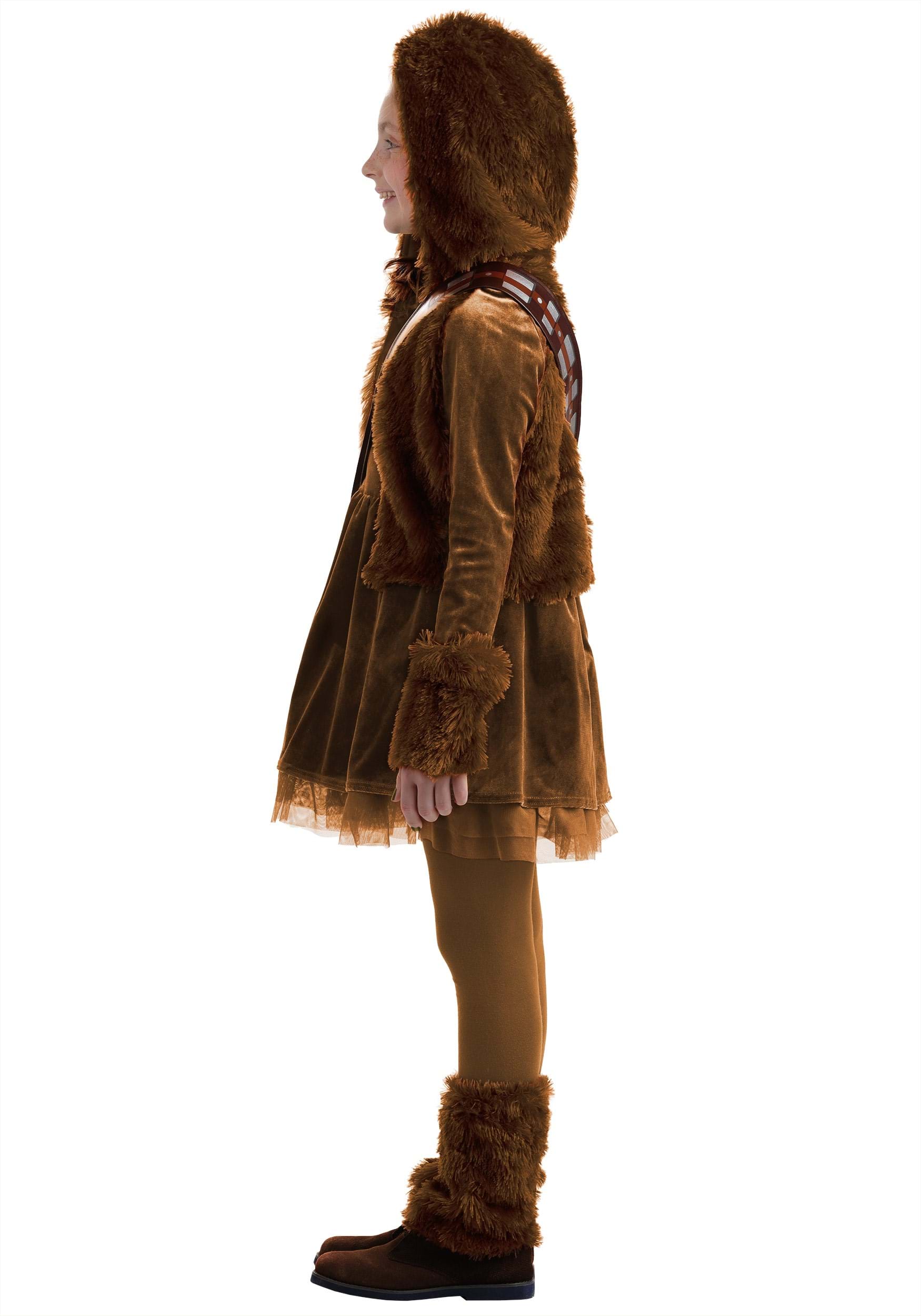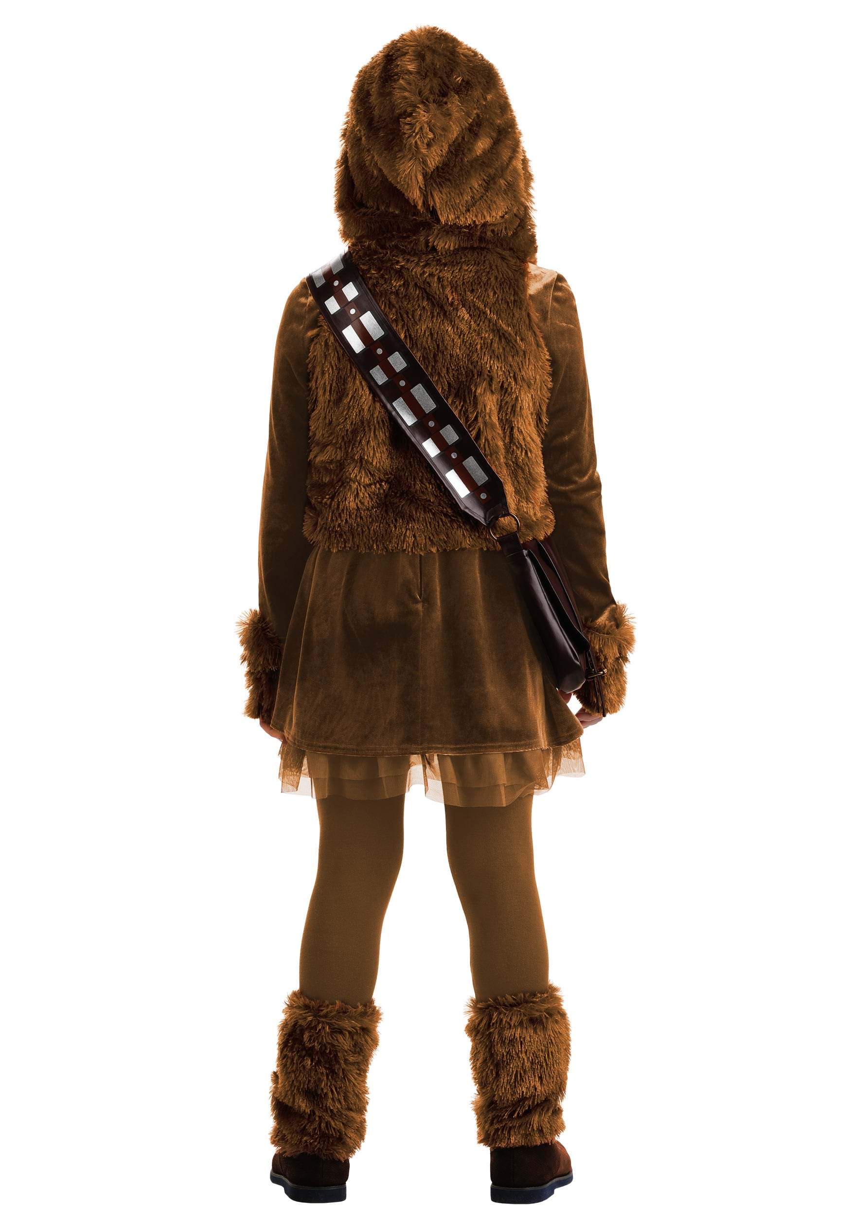 Layered over the dress is a shaggy plush faux fur vest with an attached hood, Chewbacca's signature look, reimagined for maximum coziness. Matching faux fur cuffs and leg warmers with elastic bands help complete the transformation, giving your little warrior the full Wookiee look without any itchy or bulky pieces. It's comfy, cute, and ready for action.