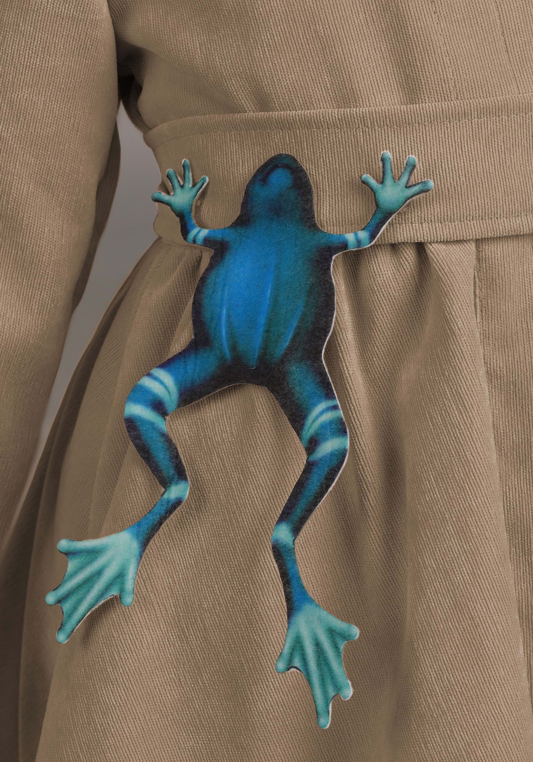 A matching corduroy belt secures at the back with hook-and-loop tape and includes an adorable felt frog fastened by clear snaps. The coordinating green Minky gloves feature three fingers and soft felt nails for the perfect finishing touch.