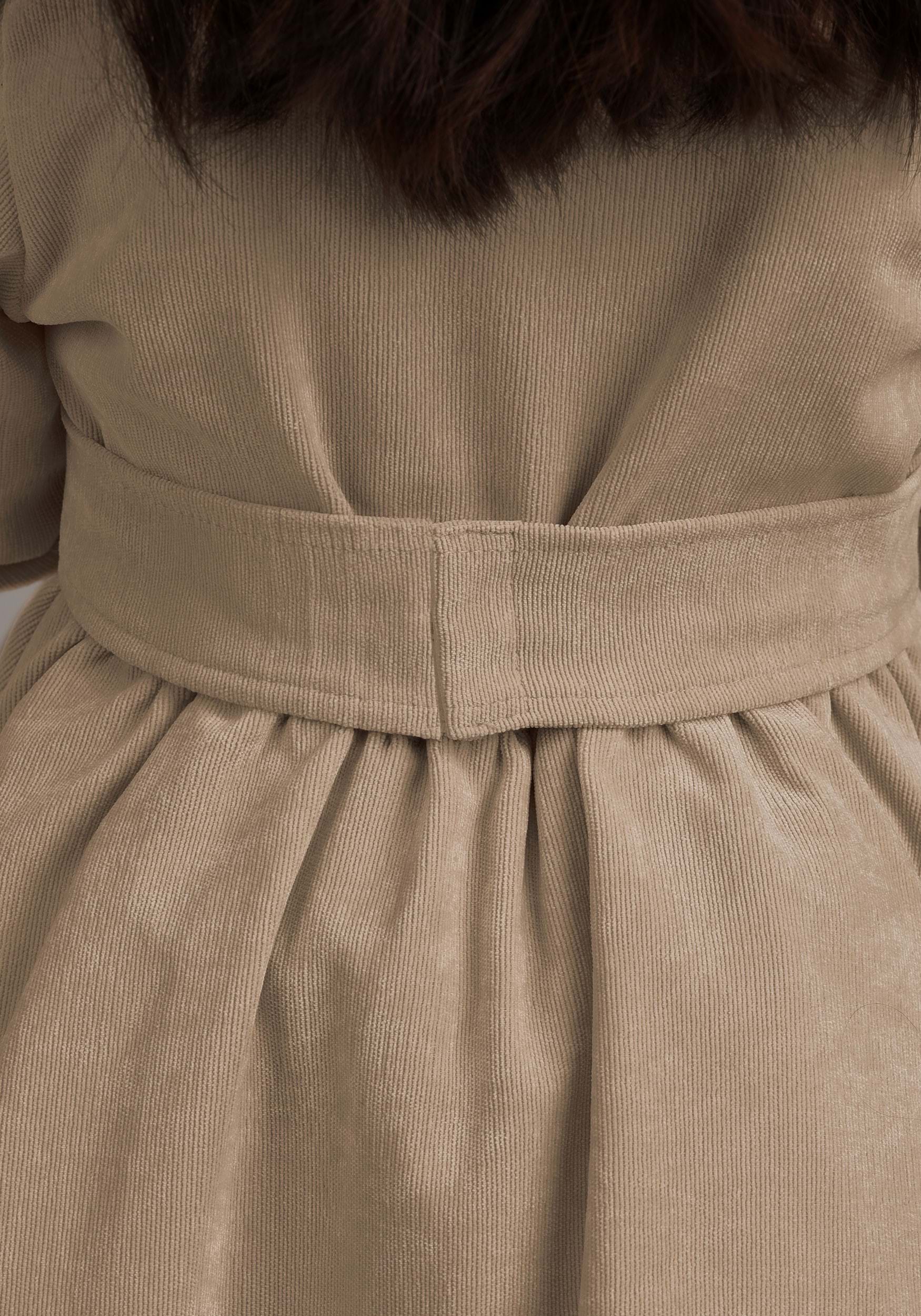 - Corduroy dress has sherpa fleece collar, sleeve cuffs and hemline, nylon and stiff tulle skirt lining, elastic waistband, hook and loop fastener down center front, sewn on minky hand covers have elastic bands to secure on hands