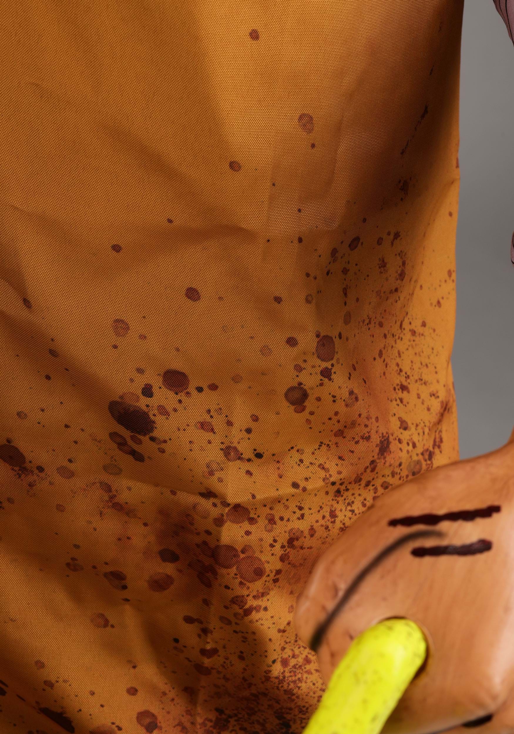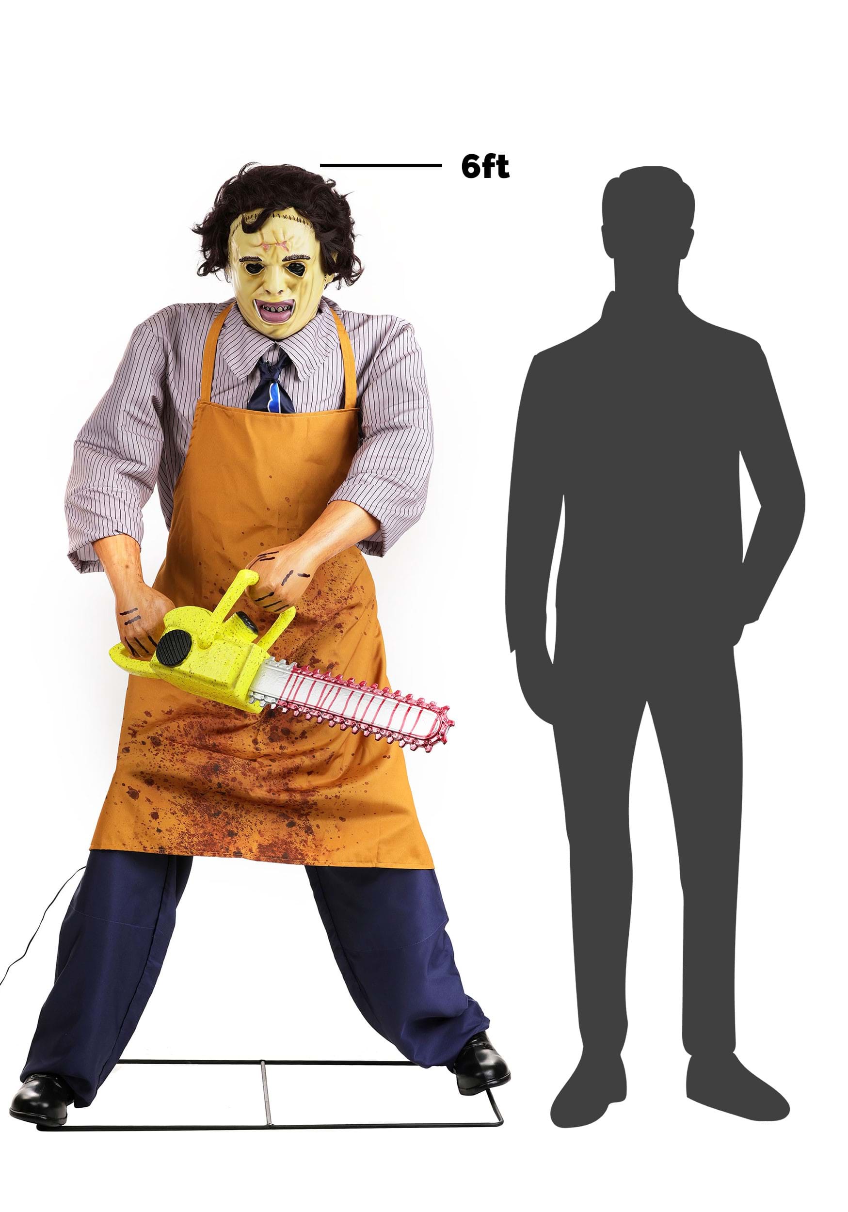 Constructed with a sturdy metal frame, molded plastic components, and polyester clothing styled after the iconic butcher’s look, this figure is designed for display and durability. The apron is splattered with grime and gore, while the mask recreates his grotesque stitched visage in all its skin-wearing glory. He stands on a solid base to prevent toppling while he spins through his grim routine.