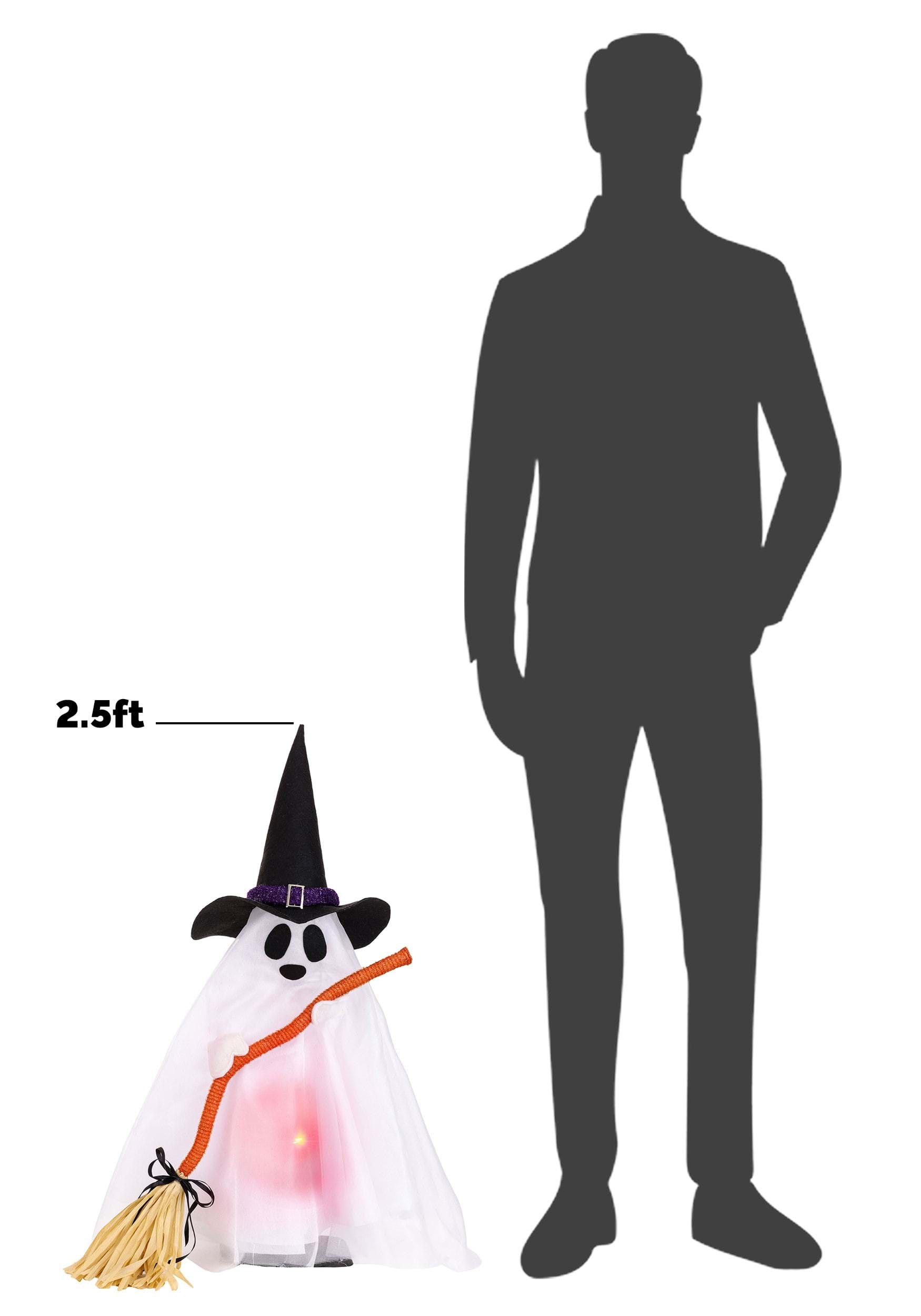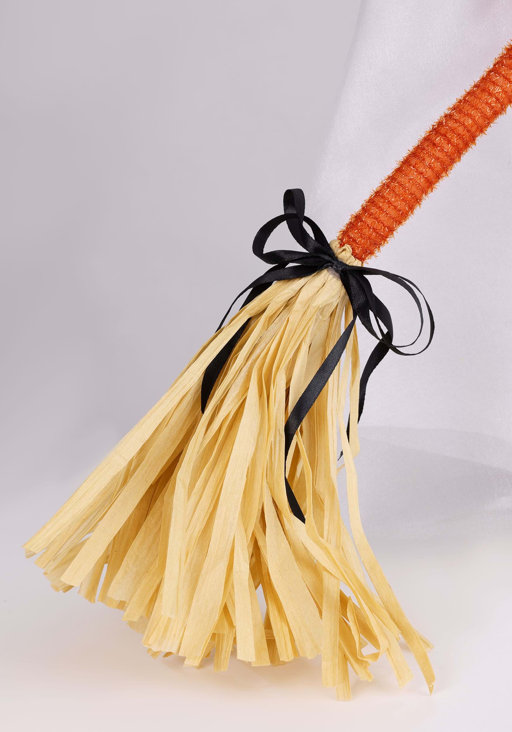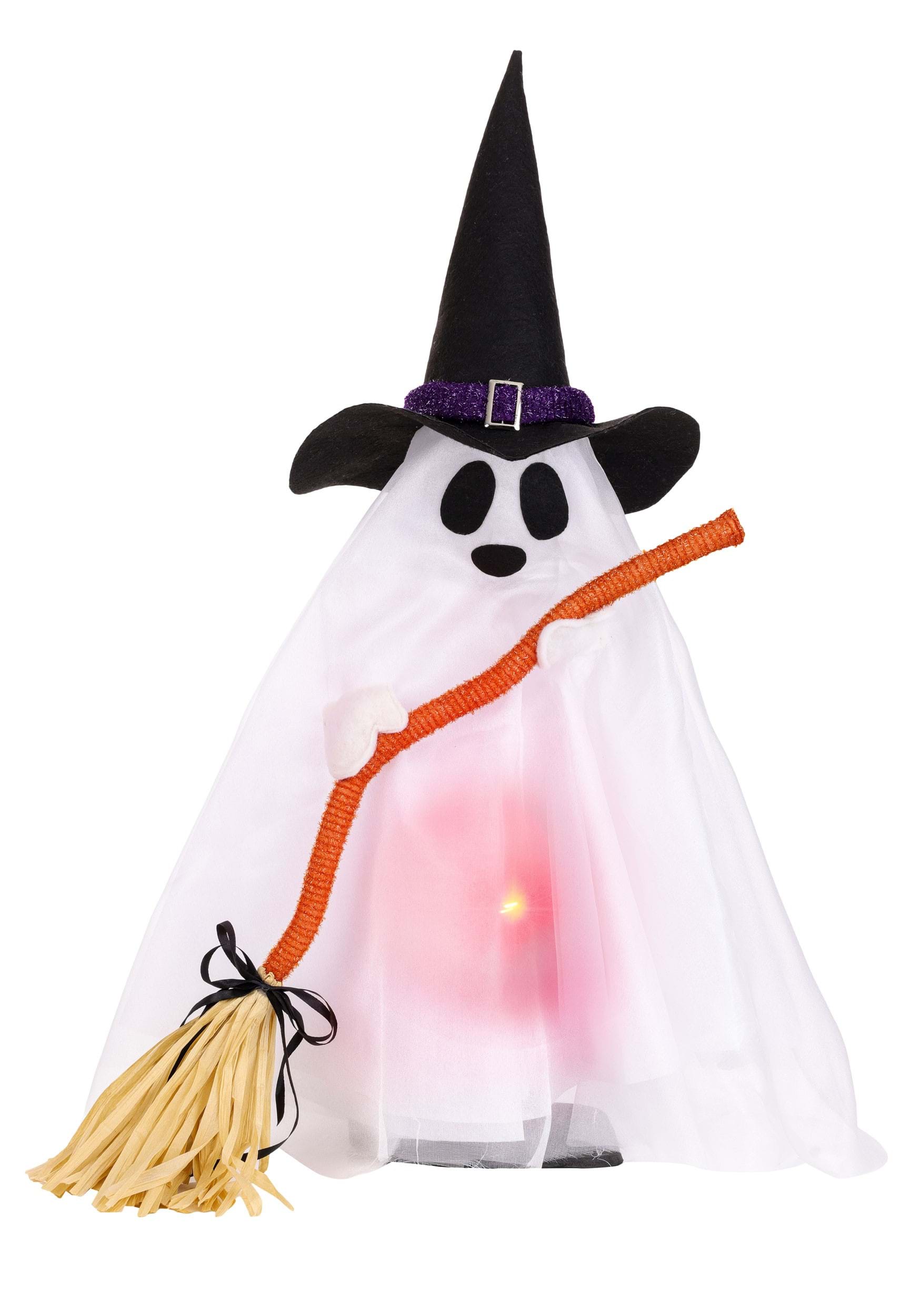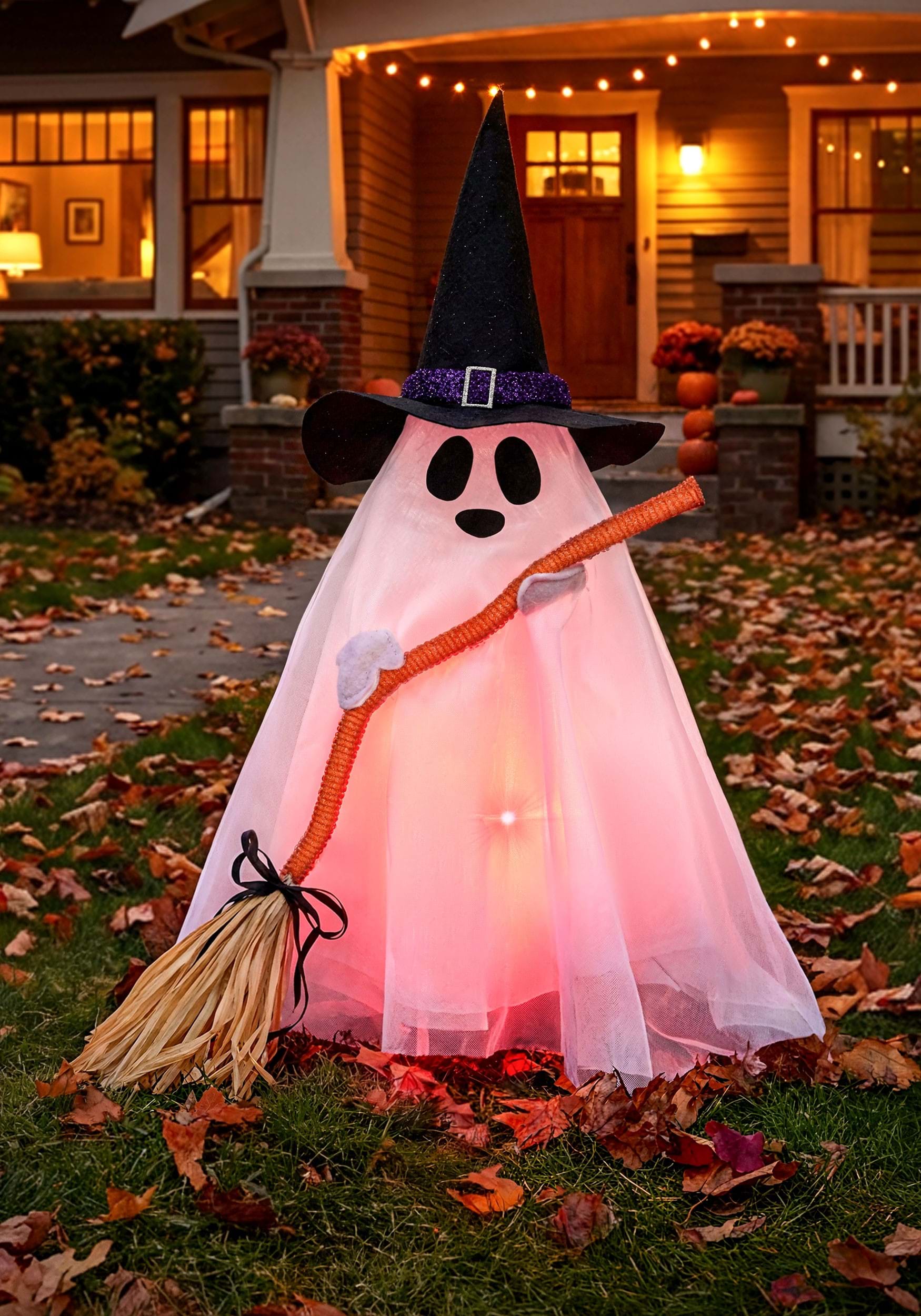 Leroy's look is carefully considered. A dapper felt hat sits atop his draped form, which is constructed from mesh and foam to create that classic billowing ghost silhouette. He carries a broom fashioned from tinsel and paper ribbon, giving him the appearance of a tiny spirit who takes his sweeping responsibilities very seriously. The effect is equal parts Halloween atmosphere and undeniable adorableness.