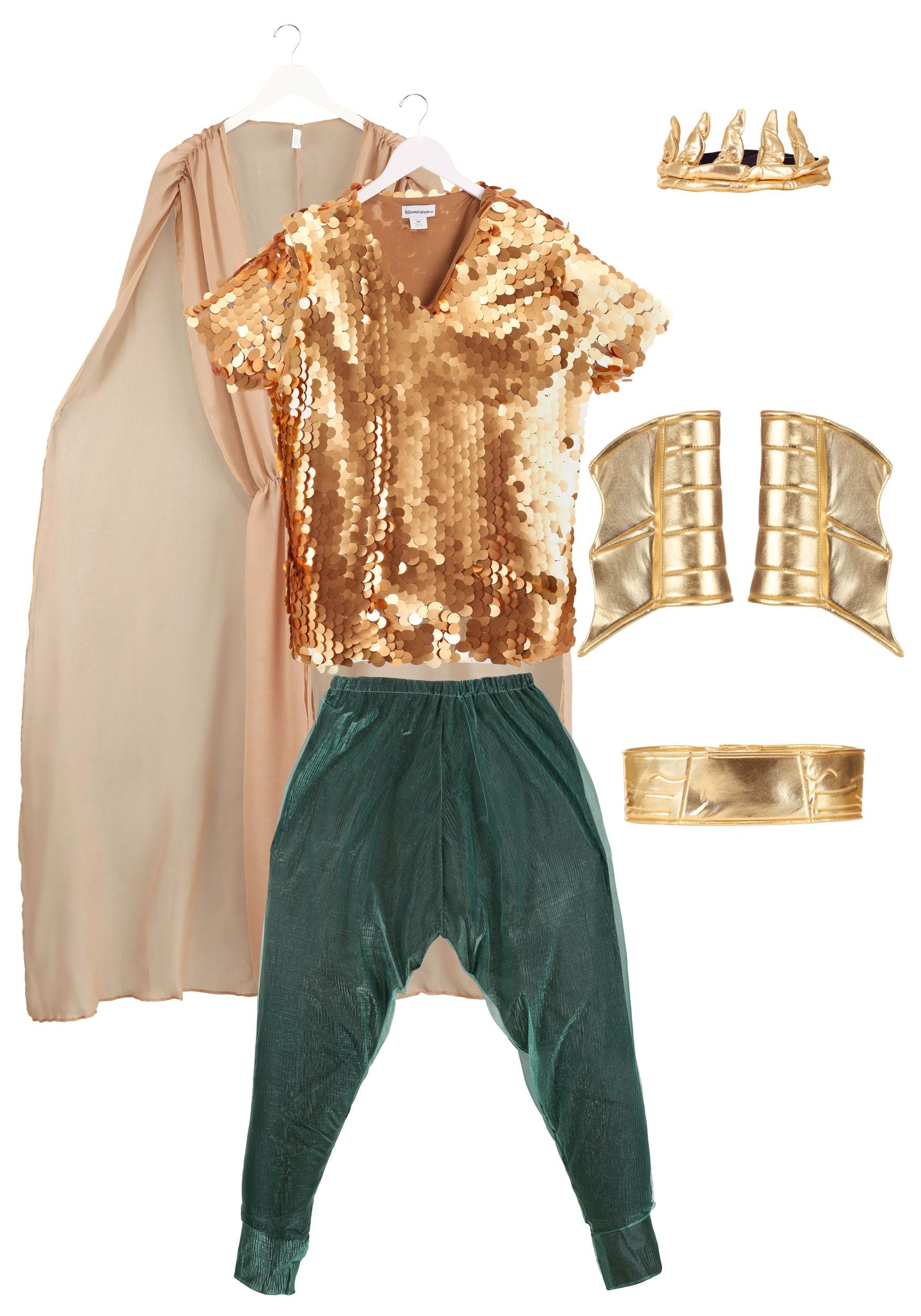 The included faux linen cape drapes effortlessly over the shoulders, catching the breeze like sea foam on a stormy shore. It's secured beneath a wide metallic gold belt that fastens at the back with a hook and loop strip, cinching the look with a structured, godlike silhouette.
