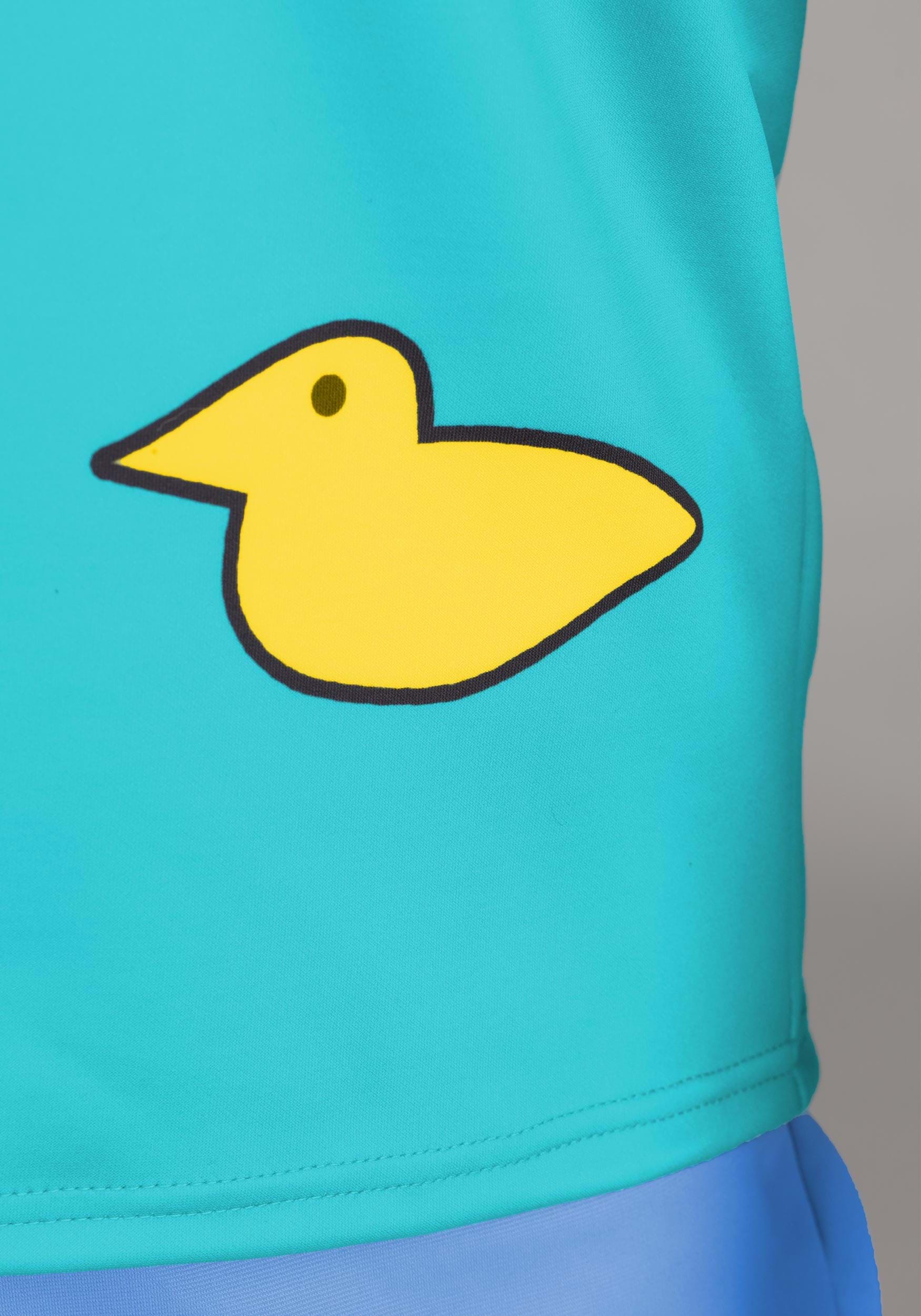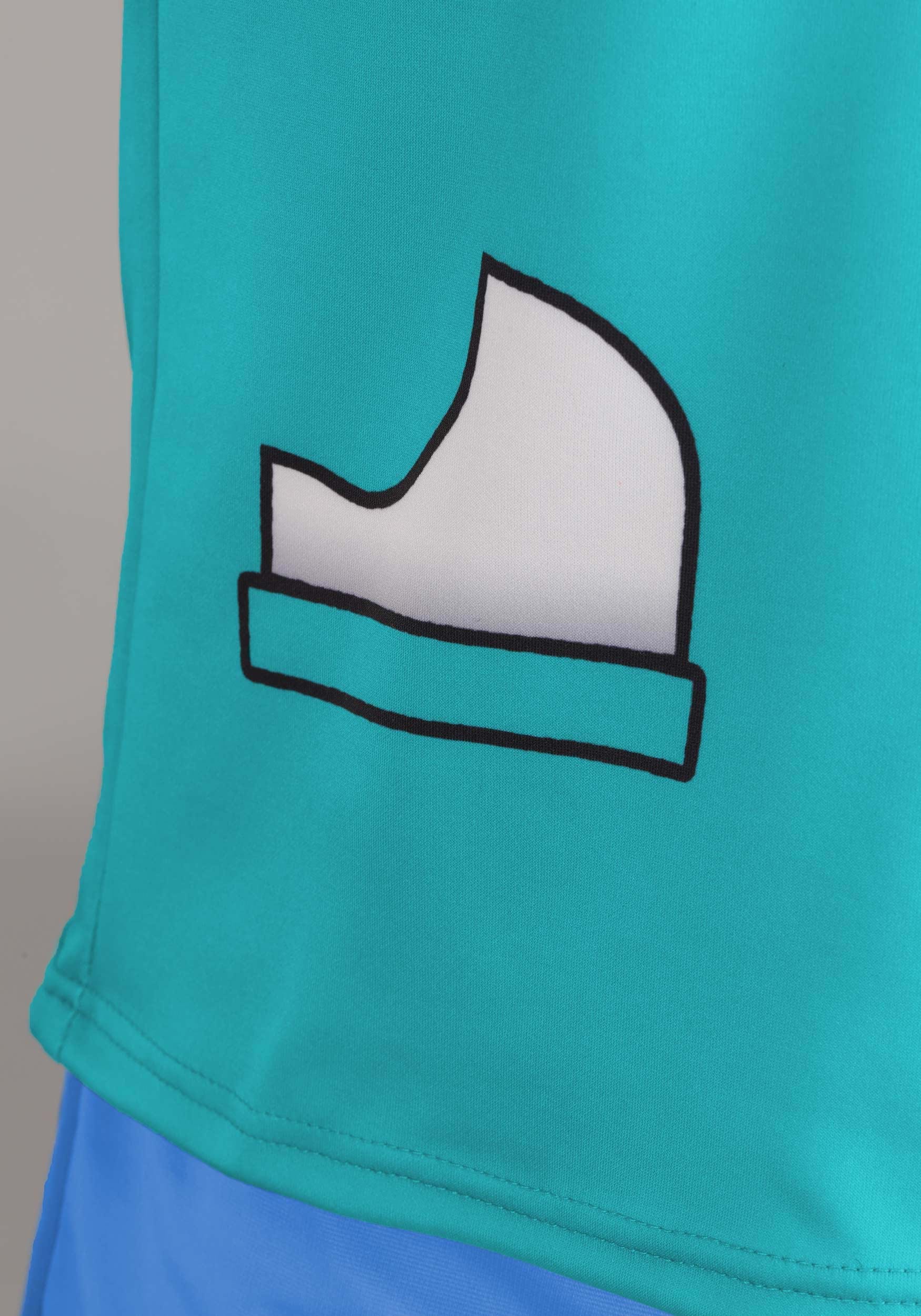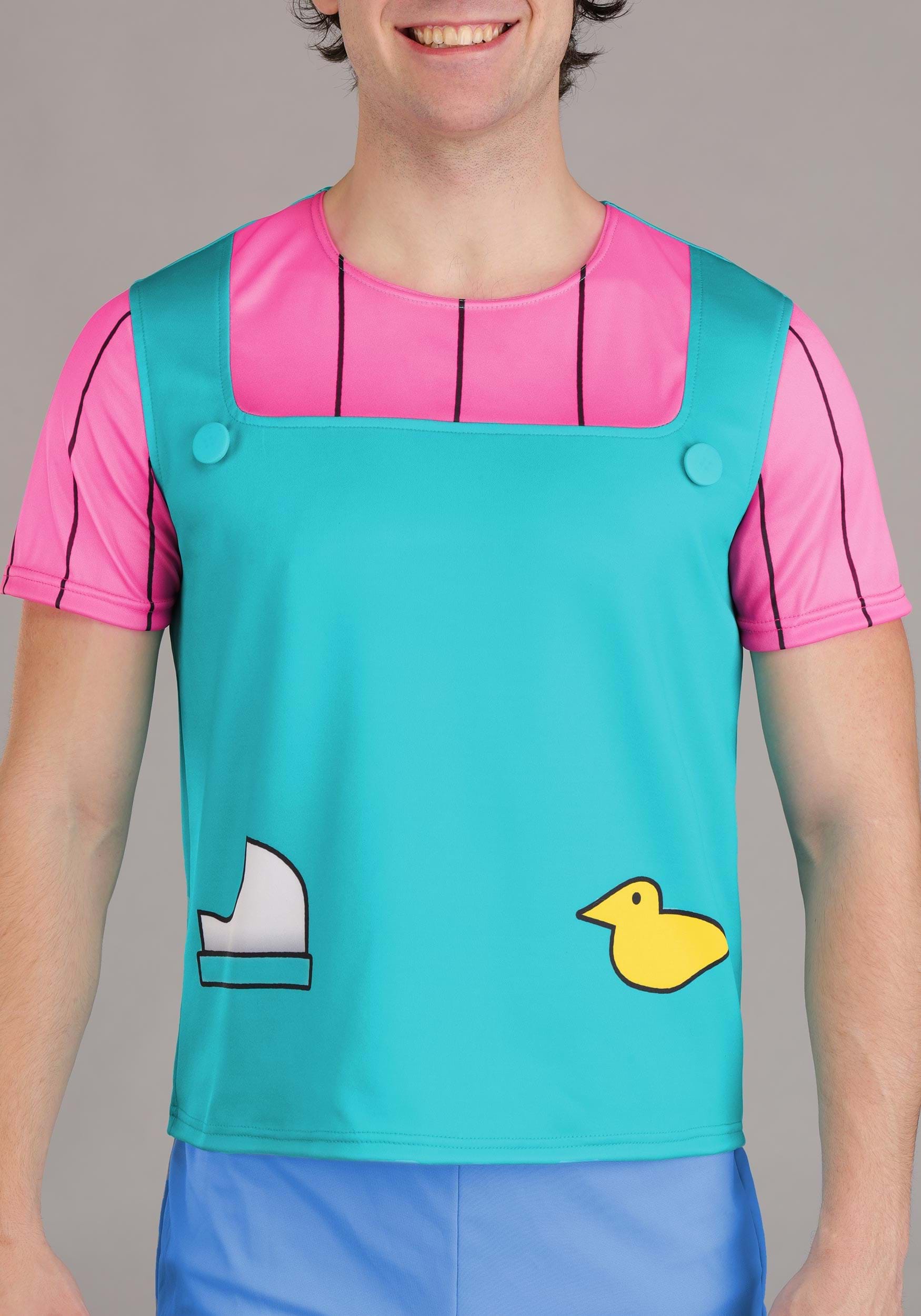 The short-sleeved shirt is sewn together with an attached turquoise tank top, mimicking Phil’s signature layered look straight from the series. The tank top features printed knit graphics, including his iconic yellow duck and faux pocket detail. From the color blocking to the cartoon-styled trim, every element is designed to look like it leapt straight off the TV screen.