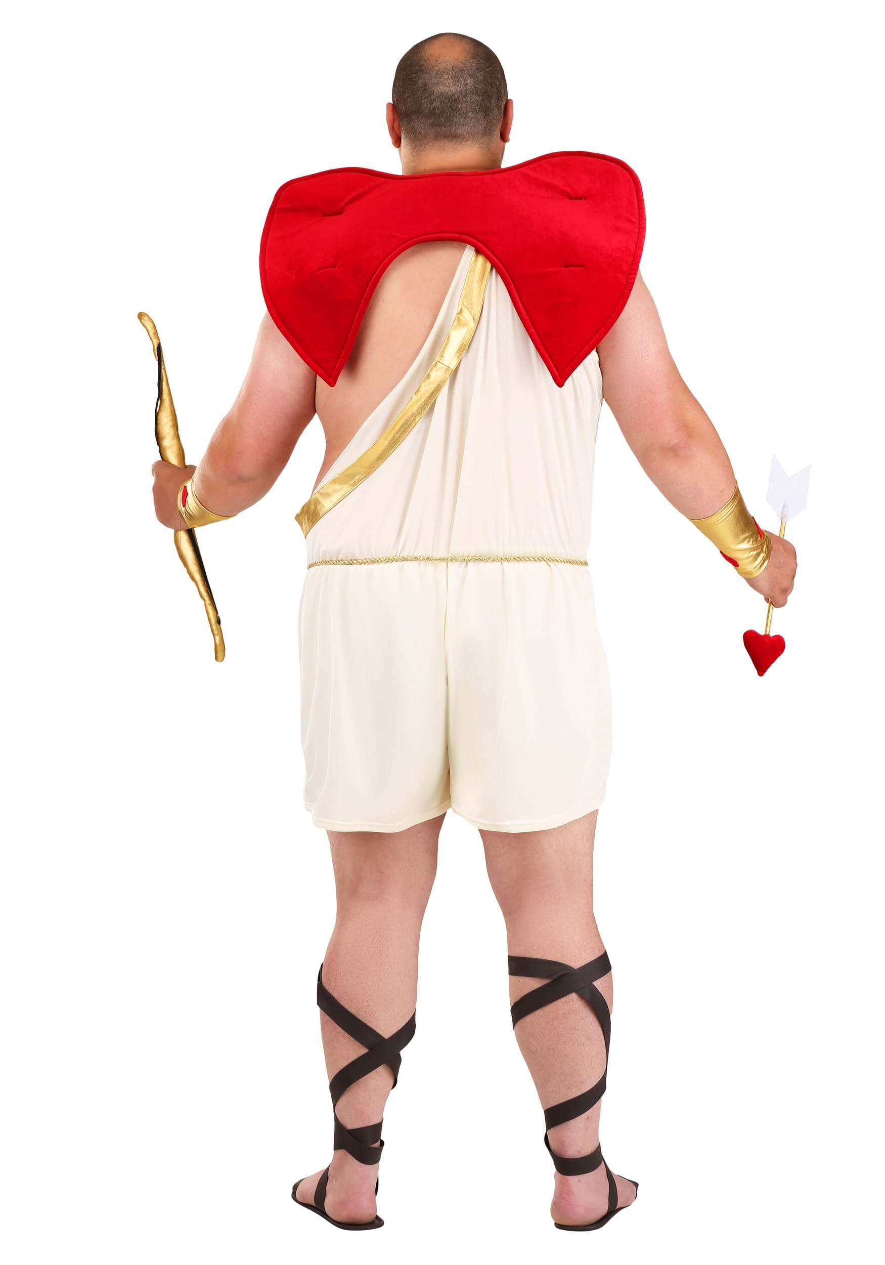 No Cupid costume is complete without the perfect accessories. Our Men's Plus Size Cupid Costume includes a gold rope waist belt with a heart on each end, adding a charming detail to your outfit. The wrist cuffs effortlessly slide on, adding a touch of flair to your ensemble. And of course, we couldn't forget the iconic bow and arrow! The 25" long bow features an elastic band "bowstring" and a stuffed grip with a plastic rod inside. The 15" long arrow is a fabric-covered plastic rod with a stuffed heart as the arrowhead.