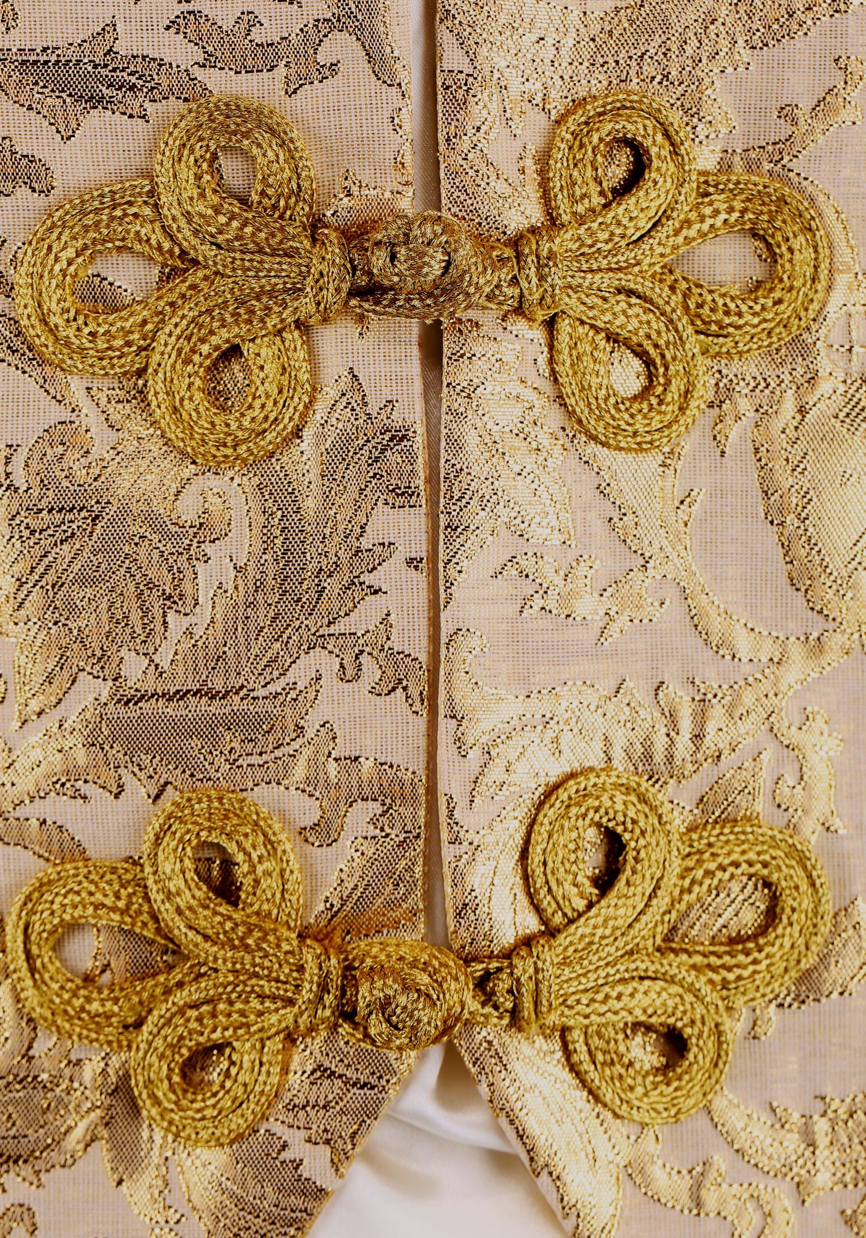 - Vest front attached to jacket has gold cording closure with gold swirl details