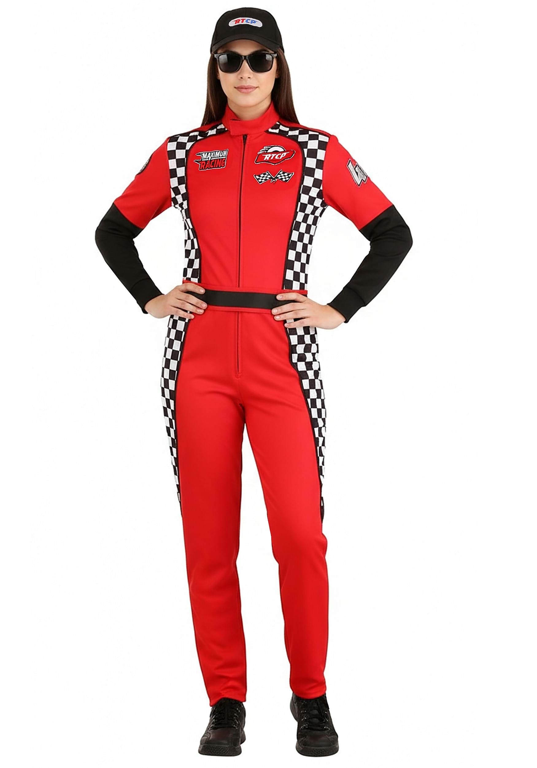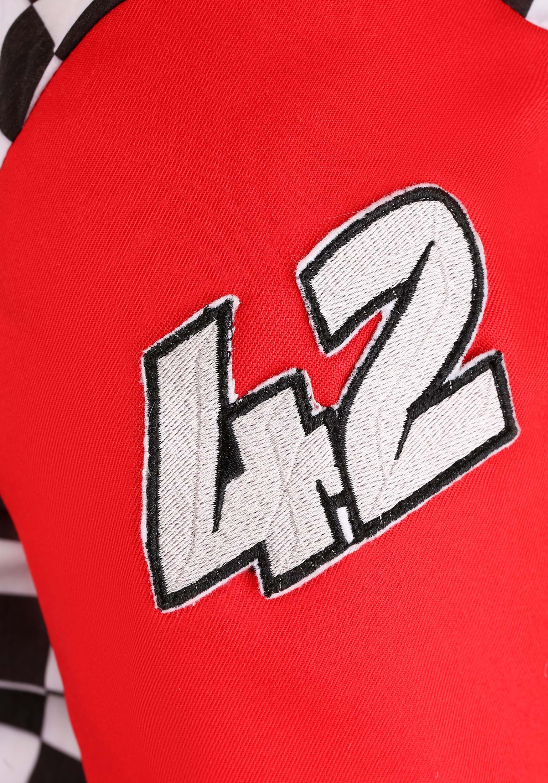 The checkerboard side panels, edged with black piping, give this costume a racing-inspired look that is sure to turn heads. The embroidered patches on the front and sleeves add an extra level of authenticity, making you look like a true speed demon.