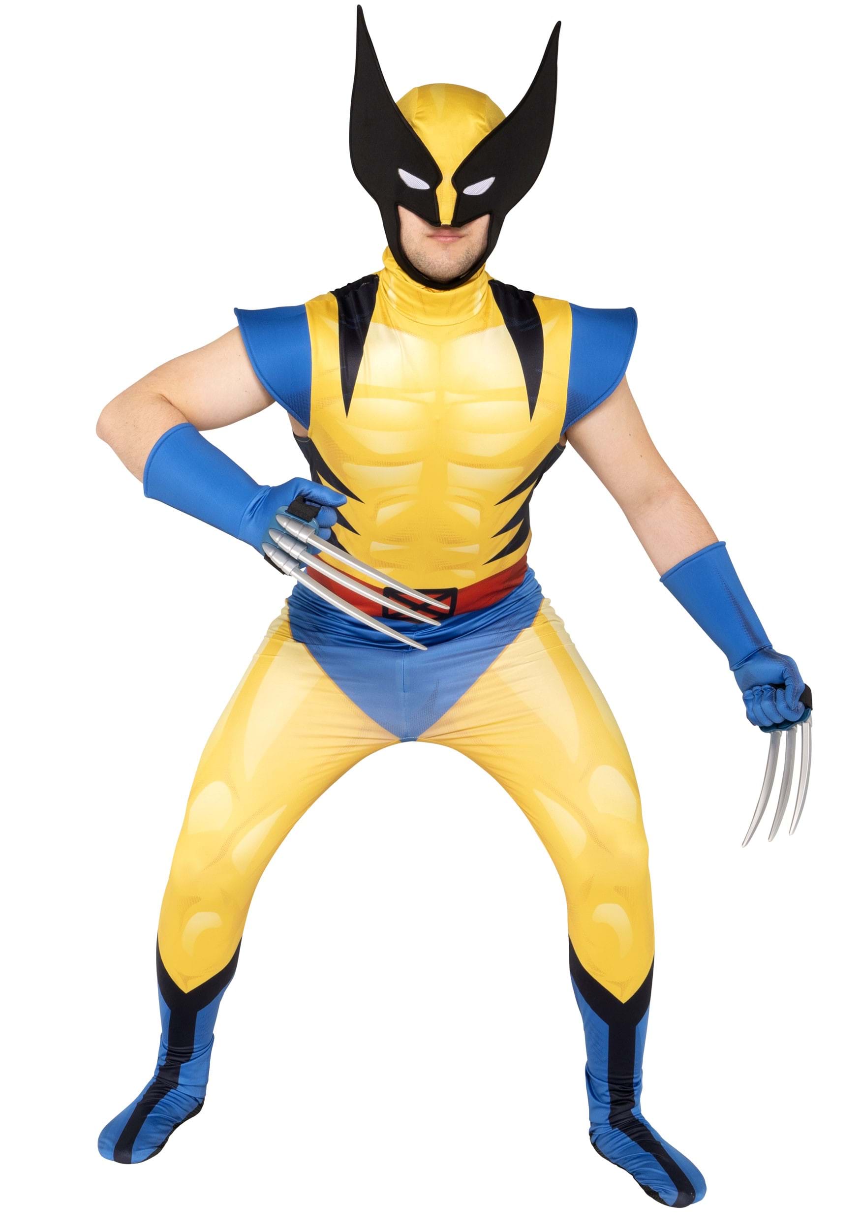 The full-body zentai suit is crafted from a stretchy spandex-blend fabric that hugs your frame for a sleek, muscle-defining fit. Featuring a vivid all-over print of Wolverine’s classic yellow, black, and blue design, this suit brings the comic book pages to life. Bold details like the printed red "X" utility belt and jagged black side stripes give you the unmistakable look of the adamantium-enhanced hero.