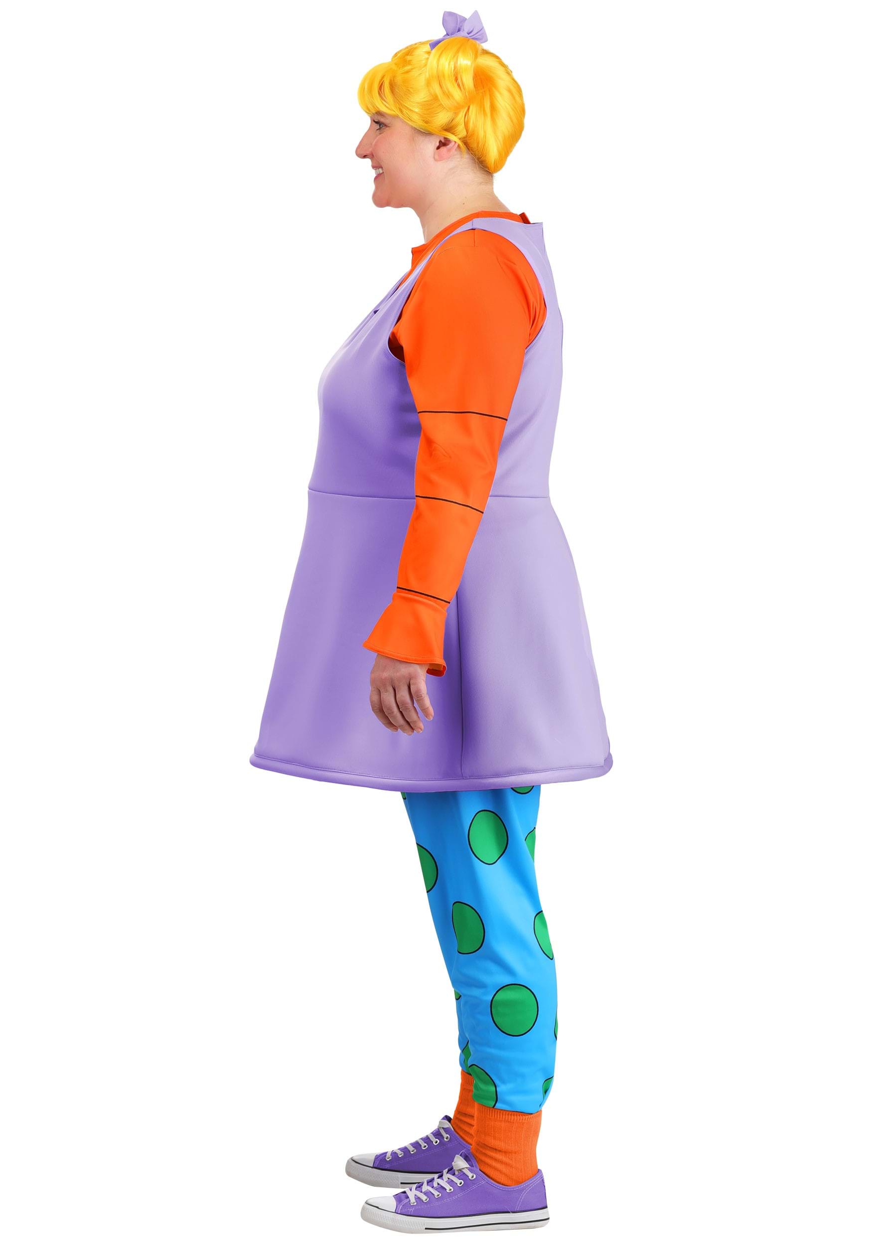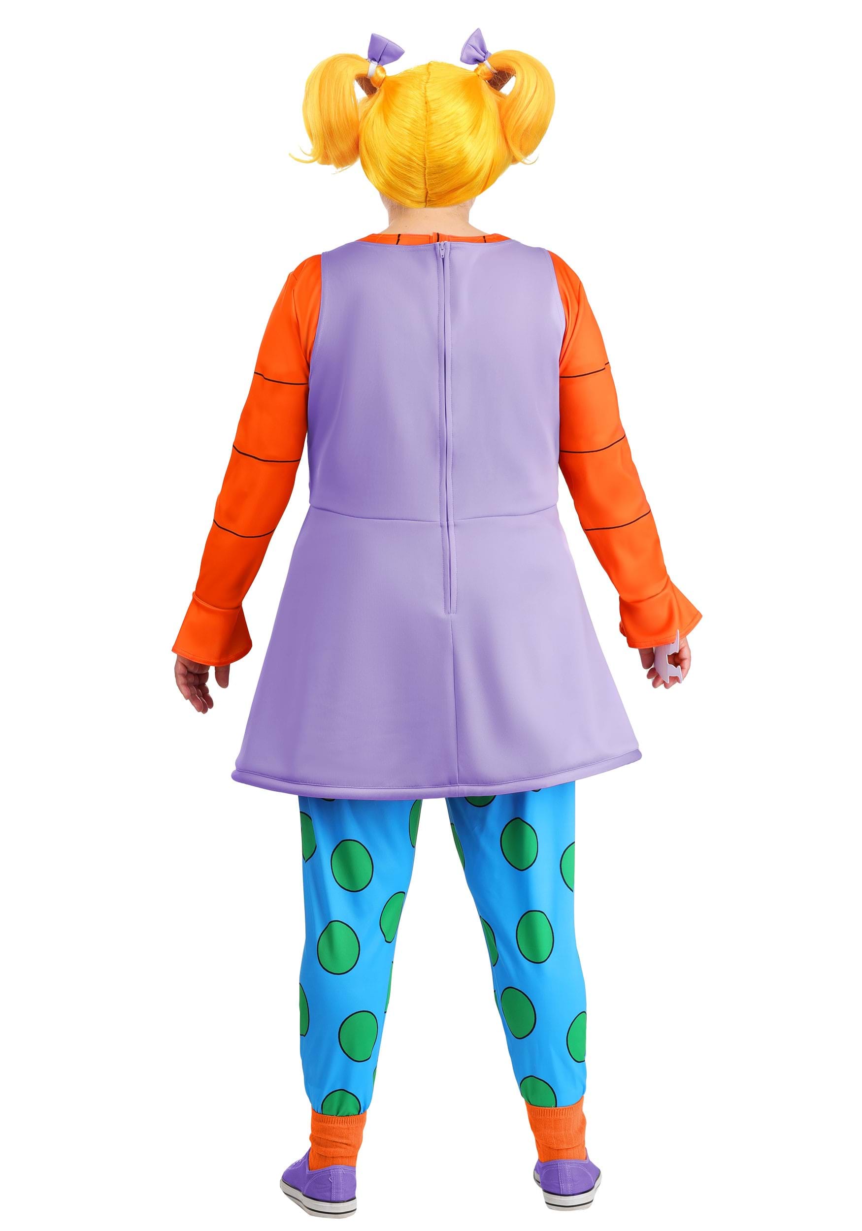 The costume includes Angelica’s signature purple dress and bright orange long-sleeved shirt, both made from soft polyester materials that offer a smooth, breathable fit. The roomy cut and thoughtful design ensure comfort without sacrificing that classic cartoon silhouette. The blue leggings are printed with oversized green polka dots and feature an elastic waistband for a flexible fit that moves easily, from party games to posing for pictures.