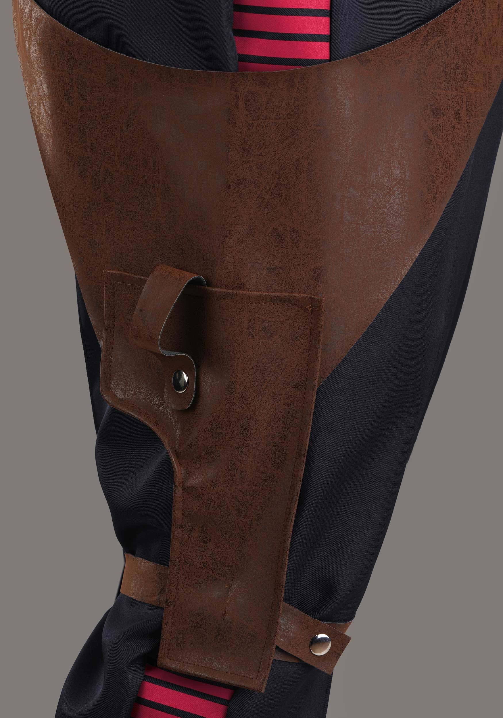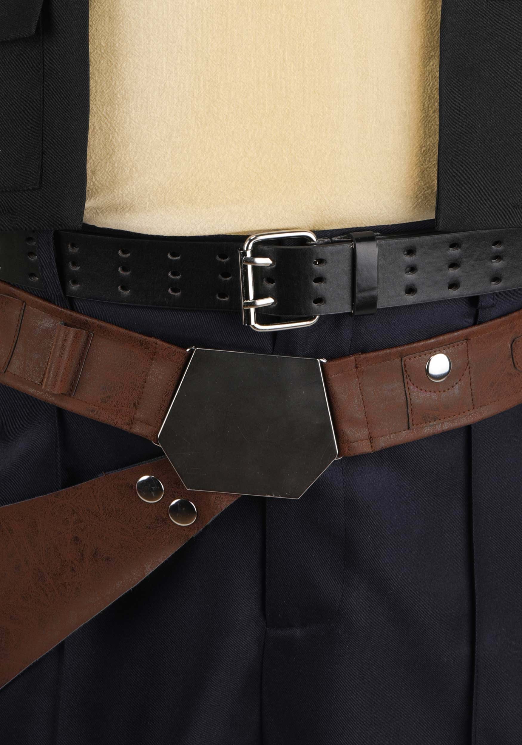 To complete the transformation, the costume includes two faux leather belts: one traditional belt that secures with a metal buckle, and one utility belt that wraps around the waist and thigh to replicate Han's iconic holster rig. Together, they anchor the entire look with structure and screen-style swagger.
