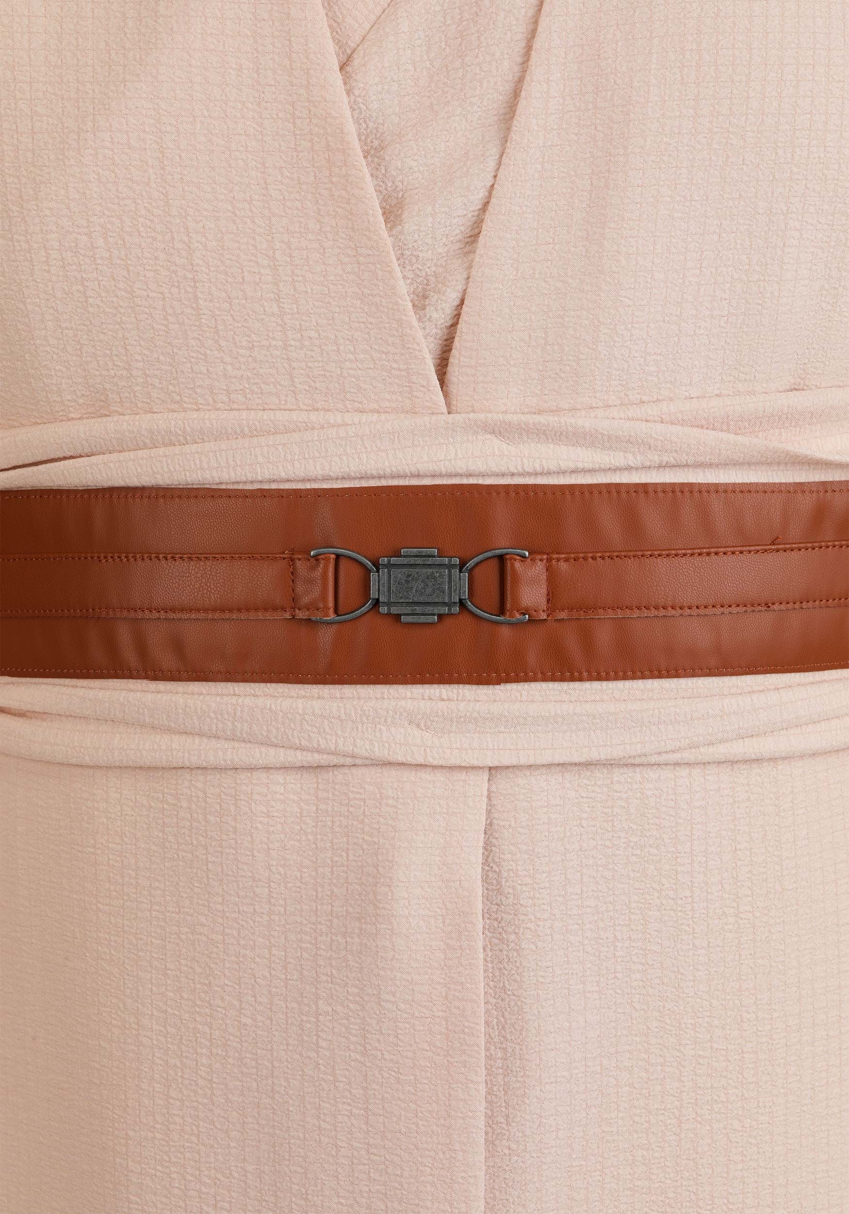 Completing the ensemble is a textured gauze belt that wraps over the tunic, fastening with hook-and-loop strips for easy adjusting. The belt features intricately detailed vinyl layers that simulate the Jedi's utilitarian gear, while a molded steel-toned buckle adds a touch of ceremonial authority, ready for both battle and council.