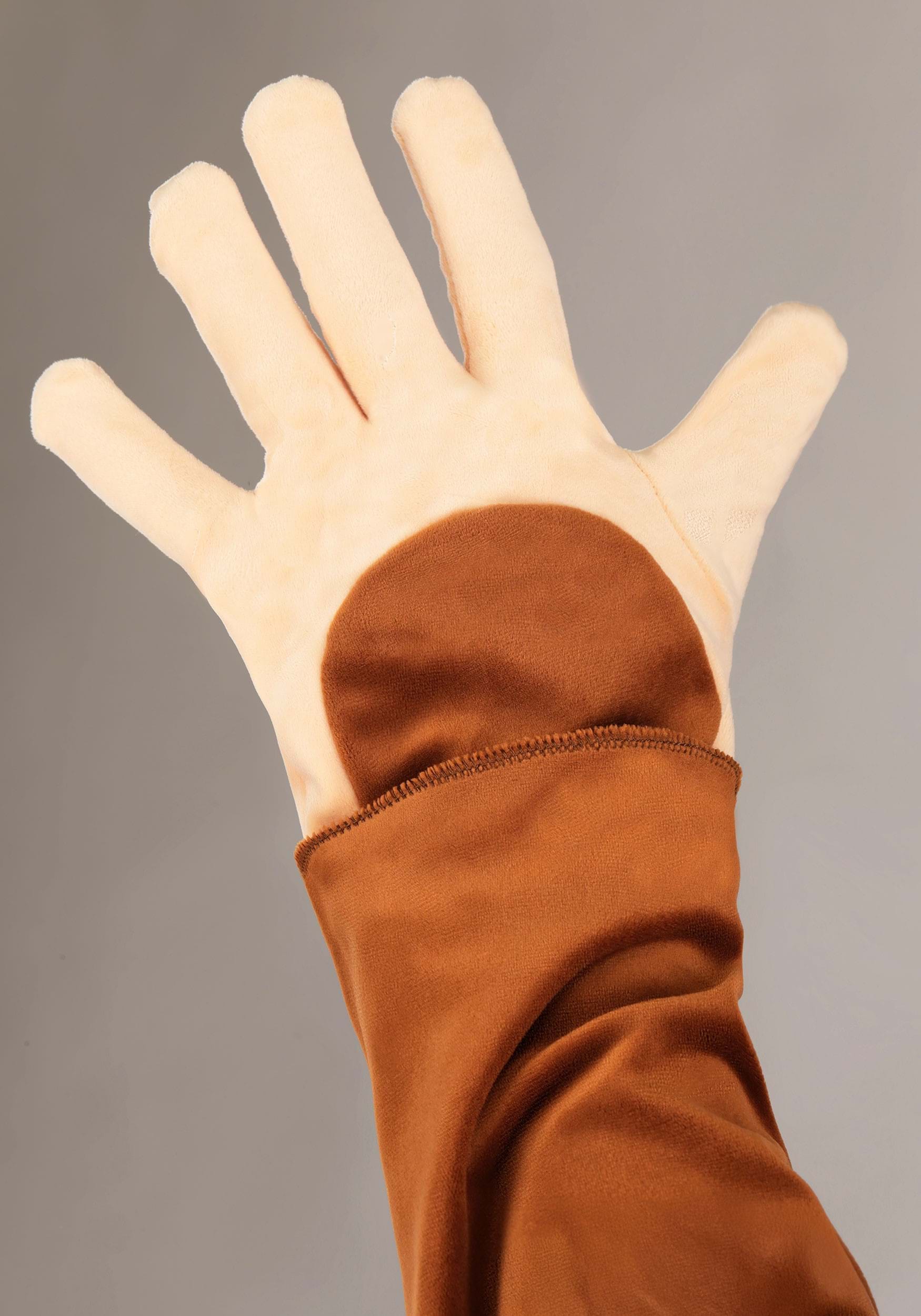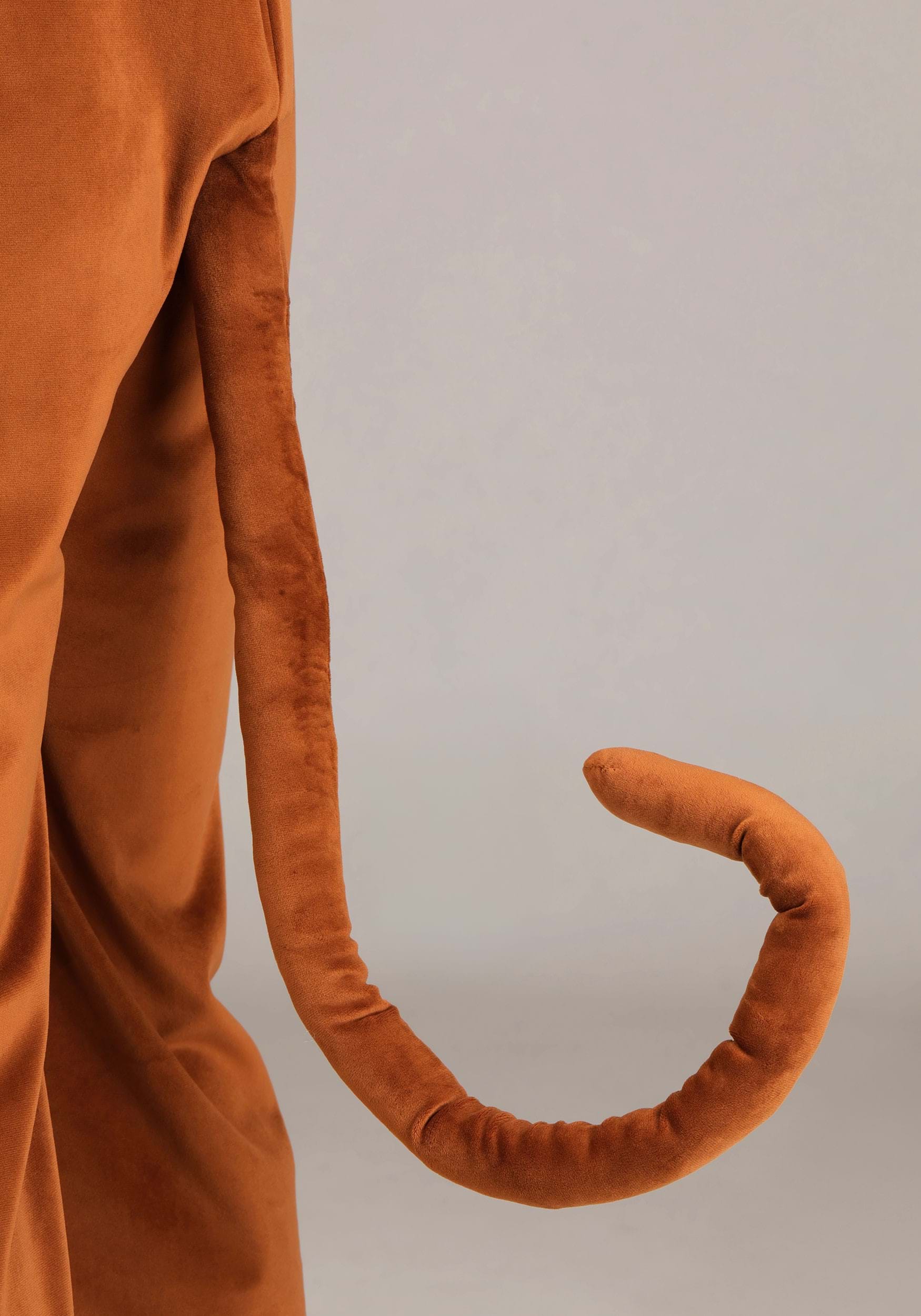 This Made By Us design is a plush jumpsuit that zips up the front and features a soft faux fur chest accent and an attached purple vest. A flexible wire-frame tail is attached in the back and the matching elasticized monkey paw gloves and foot covers add to the fun silhouette. The plush headpiece includes charming, embroidered details, long pile faux fur, and a bright fez for a finishing touch.