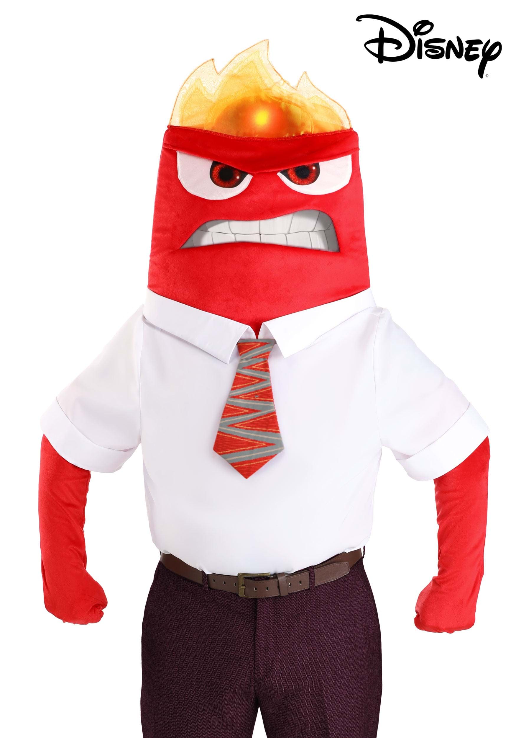 Prevent blending in with our officially licensed Disney Pixar Inside Out Anger Costume! The easy-to-wear costume starts with a pullover shirt featuring a stitched-on tie and rolled-sleeves that perfectly imitates Anger's business casual style. Elbow-length gloves offer a seamless polish (and warmth) when tucked under the shirt sleeves. And the foam-backed mask recreates Anger's scowl and shine with appliqued details and light-up organza flames!