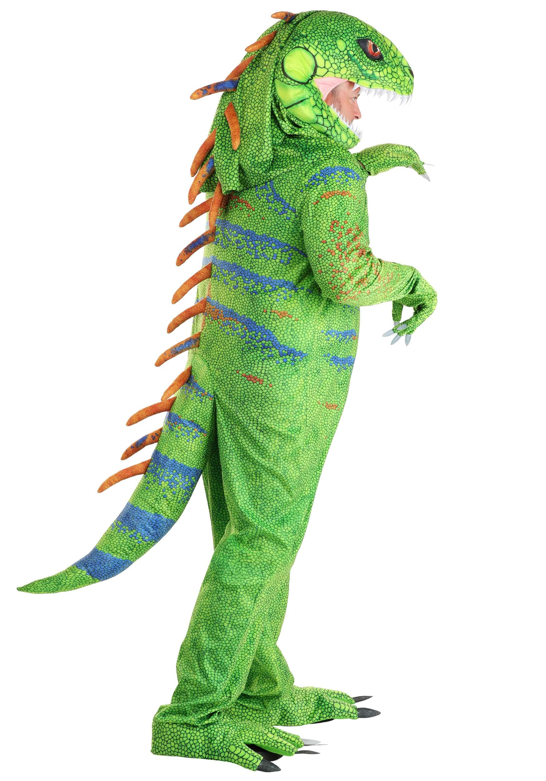 Crafted from 100% polyester with fiberfill stuffing, the costume includes a vivid green jumpsuit with dynamic blue striping and textured scales that shimmer with reptilian realism. The suit zips up the front for easy wear, while a menacing column of stuffed spikes travels from the neck down the middle of the tail—because no proper iguana struts without a little back armor!