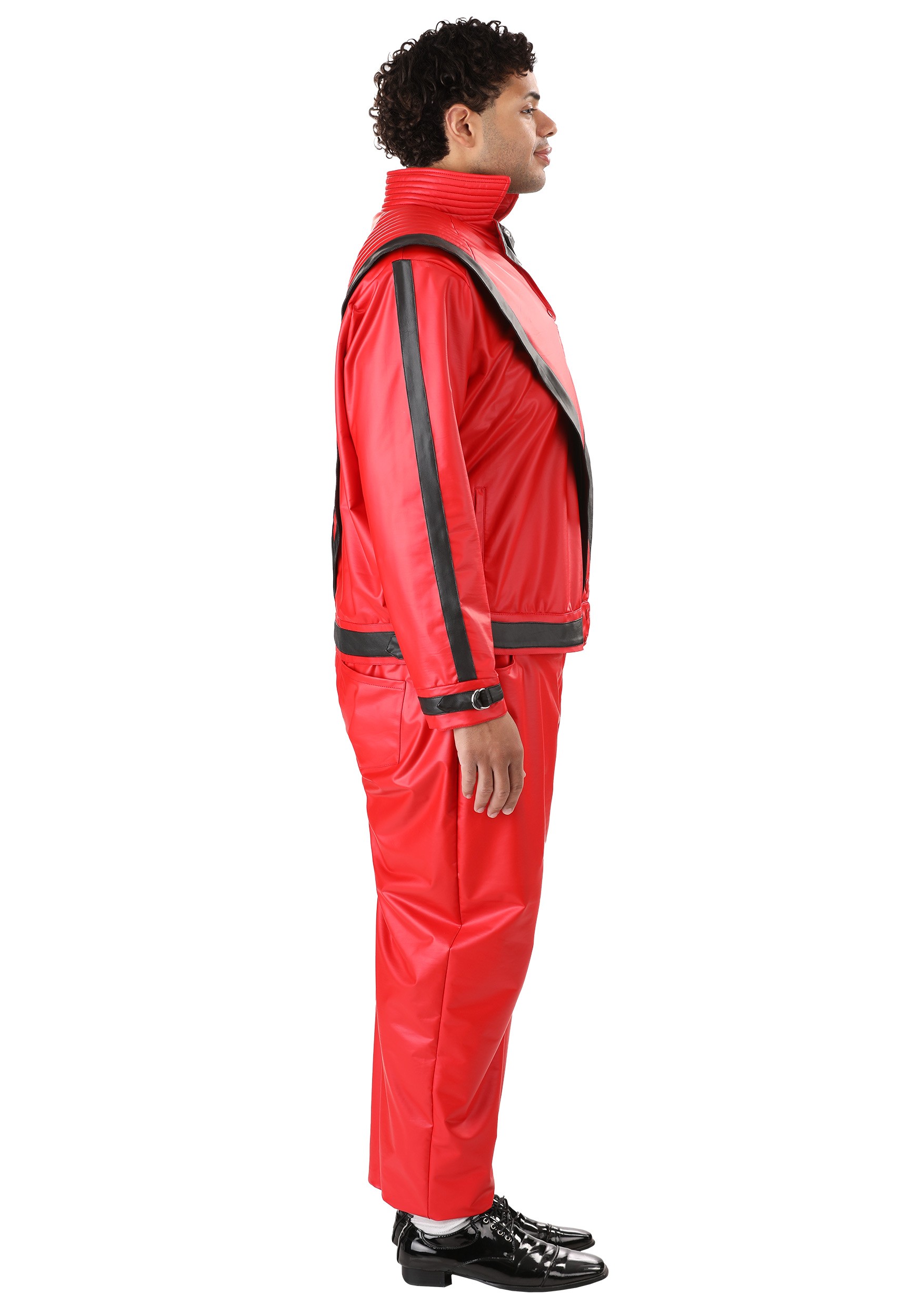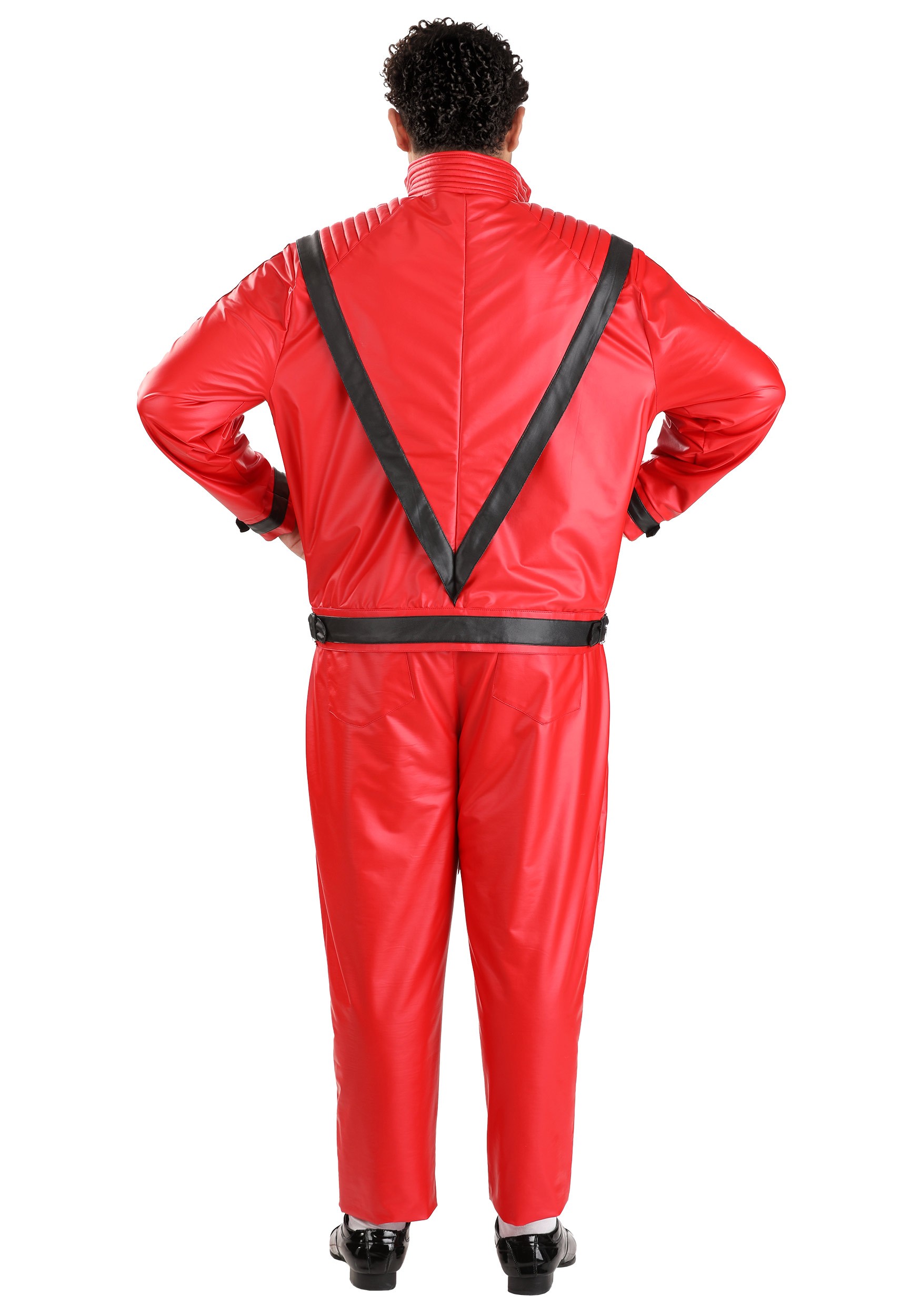 The standout feature of this costume is the eye-catching red jacket, made from stretch faux vinyl with a soft lining to ensure comfort. With its bold red fabric and black faux vinyl accents, this jacket replicates the iconic Thriller look down to the smallest detail. Metal snaps run down the center front for easy closure, while shoulder pads, detailed stitching, and batting fabric in the collar and shoulder tops give the jacket that perfect, structured shape.
