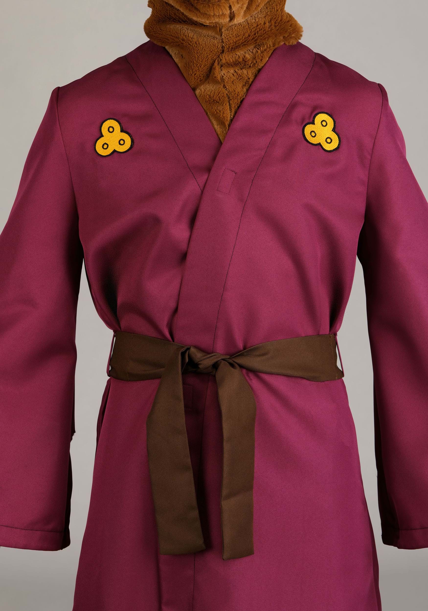 The deep maroon robe is made from durable polyester twill and features gold emblem patches that match the animated design from the series. Lightweight and easy to move in, it drapes over the body with a classic wrap style, secured by a tie-around brown belt for that calm-but-deadly dojo aesthetic.