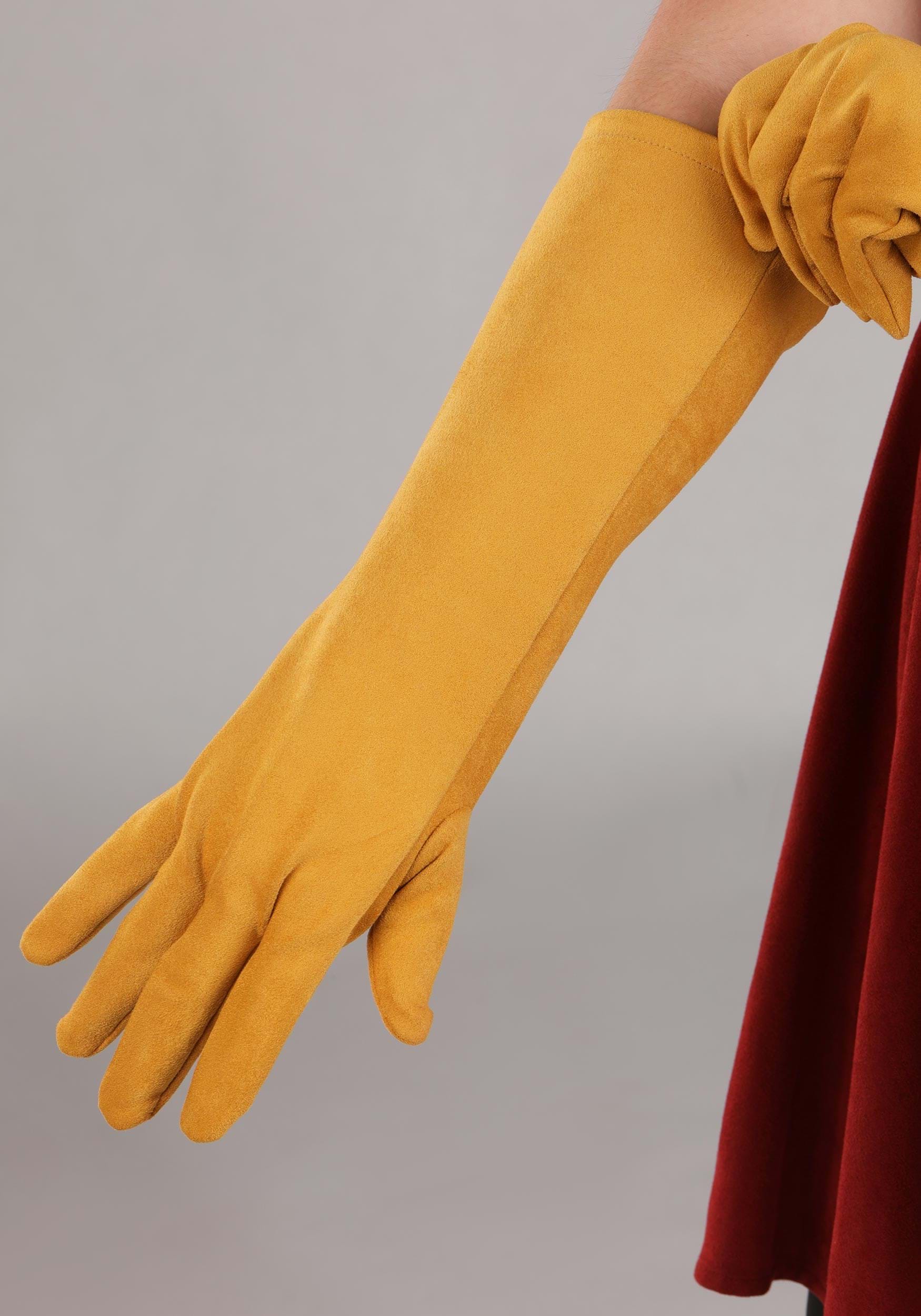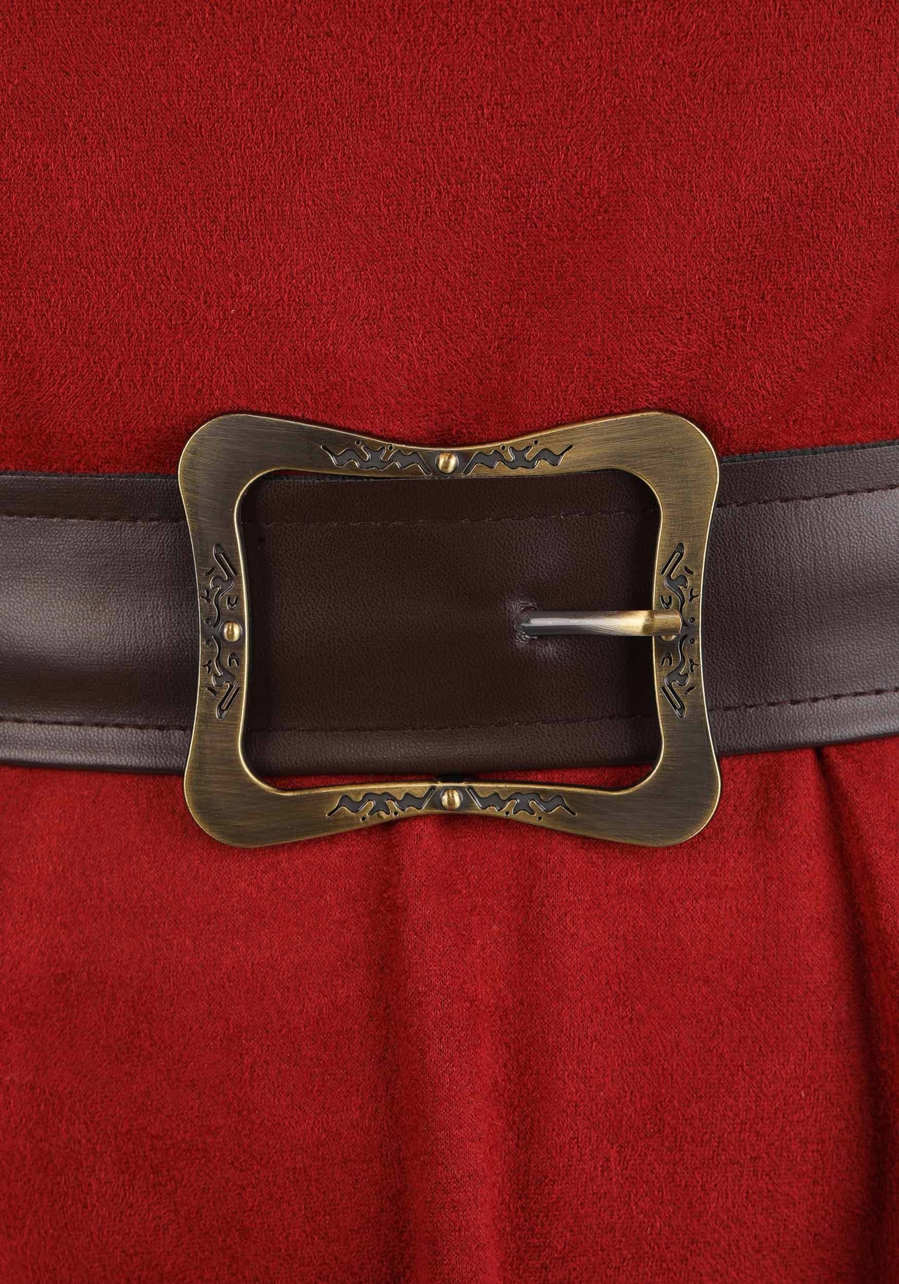The faux suede tunic dress shines in Gaston's signature red, with gold lapels and an elastic back for a flexible fit. The wide matte vinyl belt features a molded brass-tone buckle for structure, while gold gloves match the costume's warm shine. Black jersey knit leggings add comfort, and a matching faux suede hair bow adds a charming final flourish.