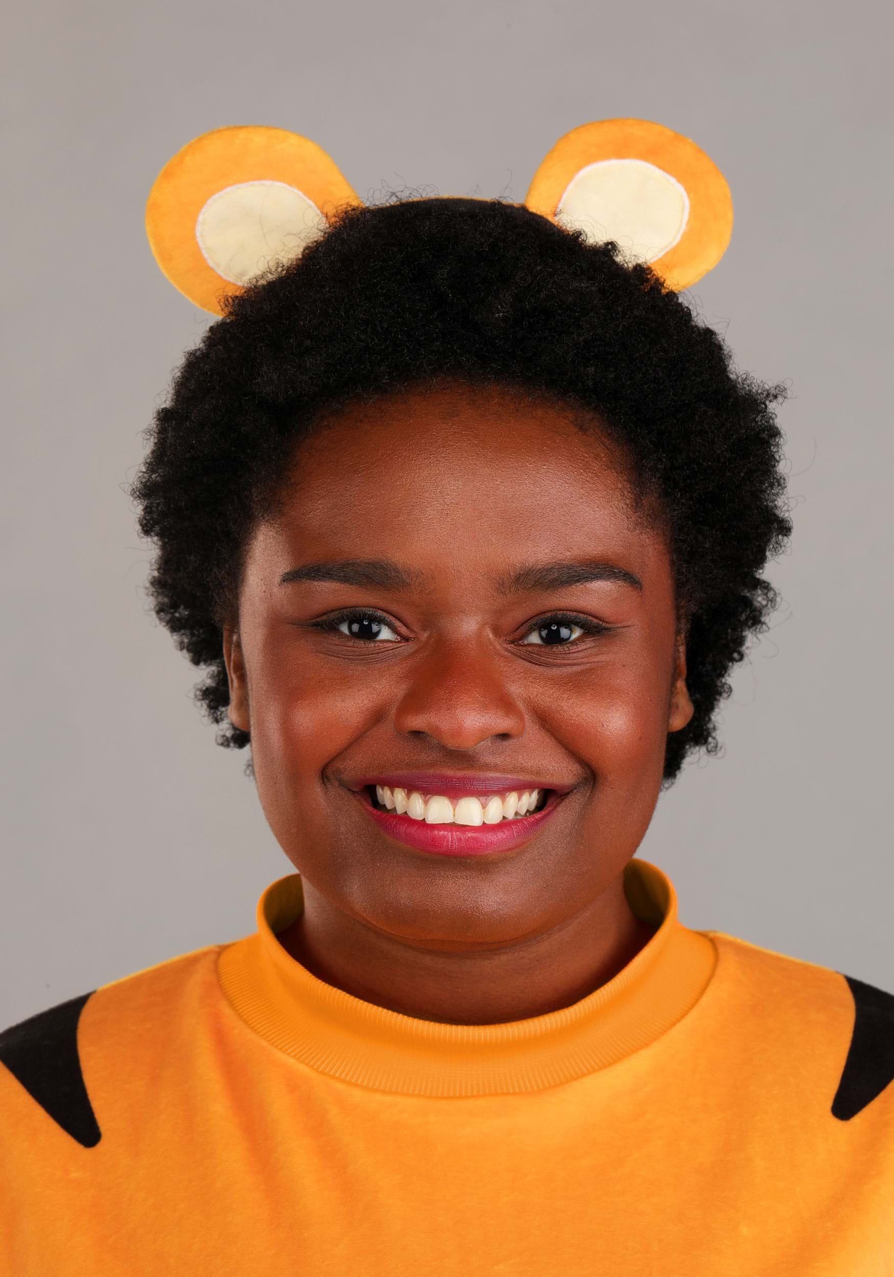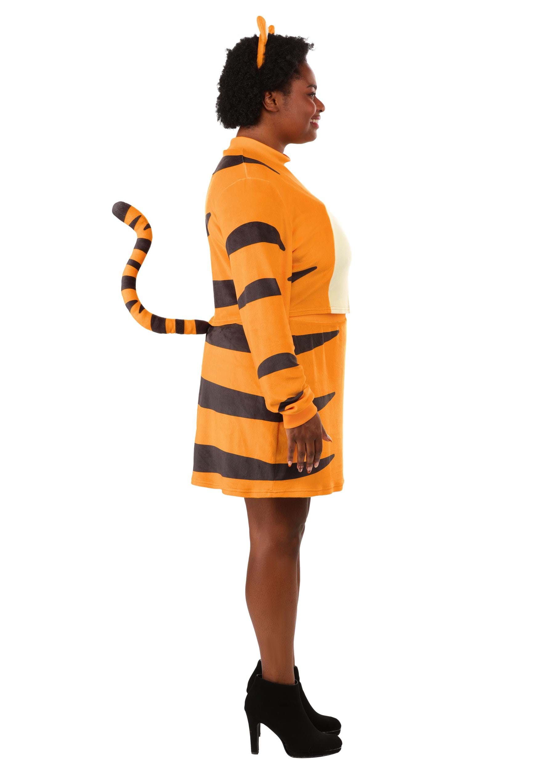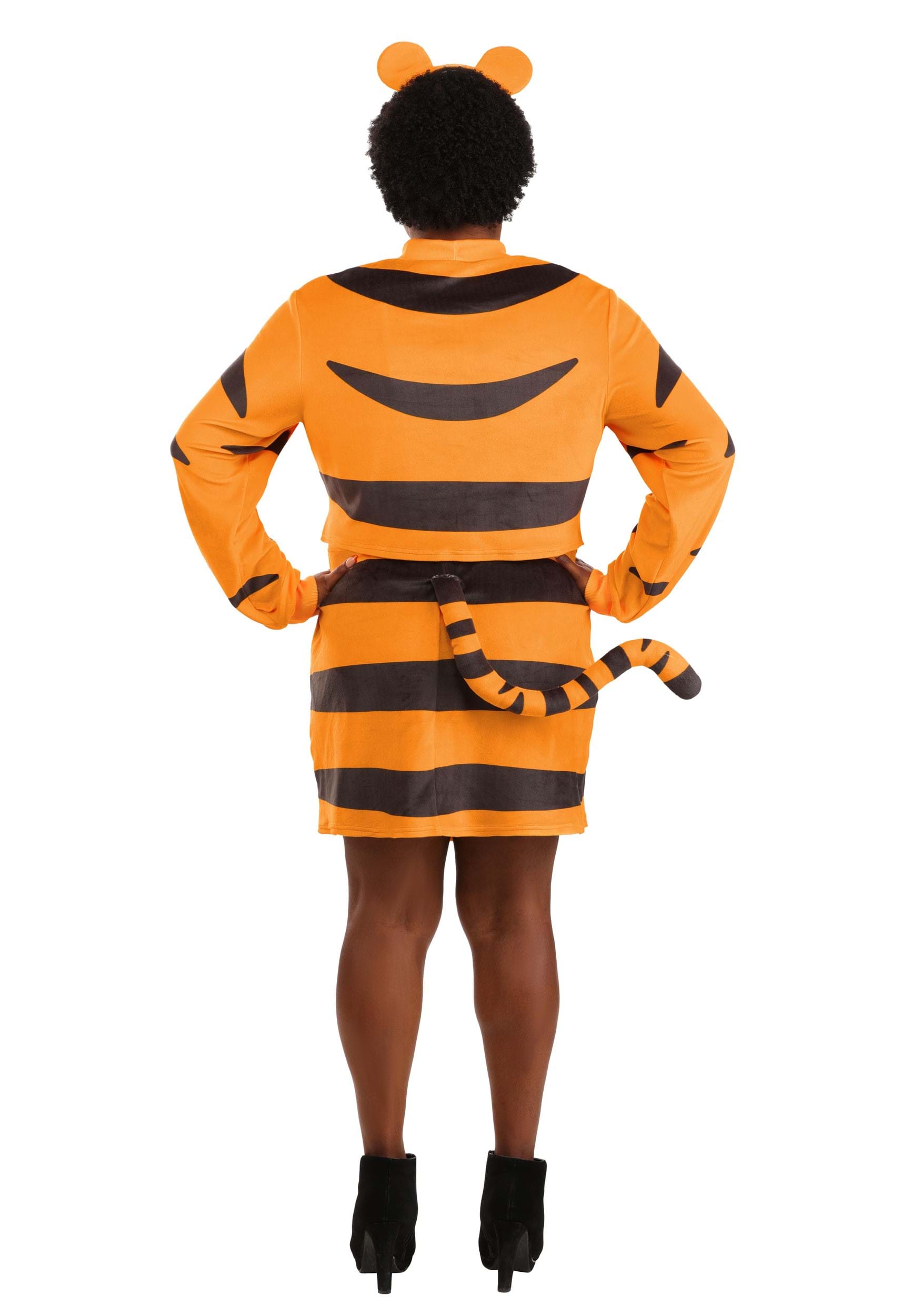 This licensed Tigger women's costume starts with a super-soft mock neck shirt. Its cropped style gives it a trendy look, while its stretchy fabric rib-knit cuffs ensure it has a comfortably snug fit. The coordinating pull-on skirt has an elastic waistband and mid-thigh length. Printed tiger stripes, a fiber-filled tail with poseable interior wires, and a Tigger headband complete the animated outfit.