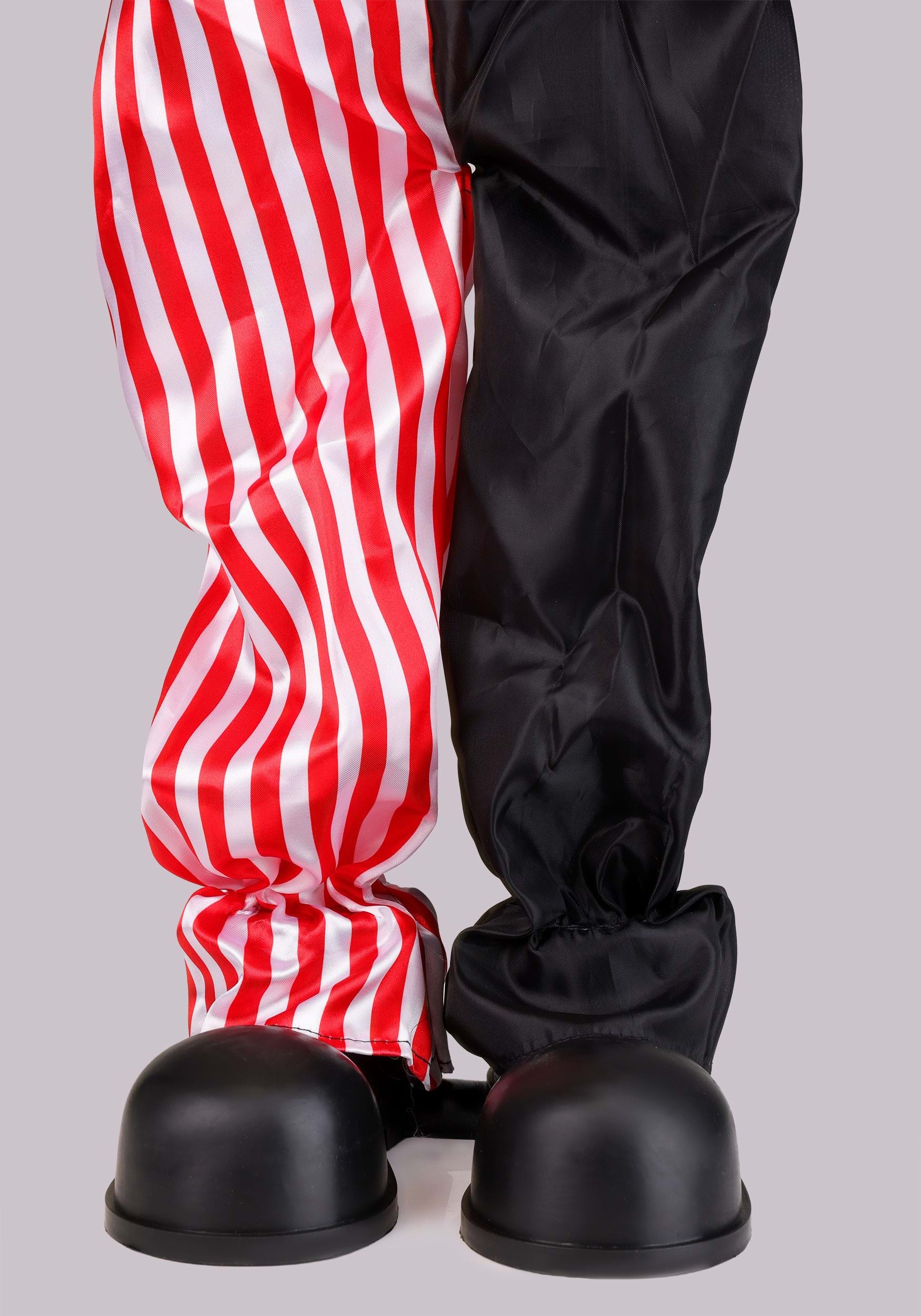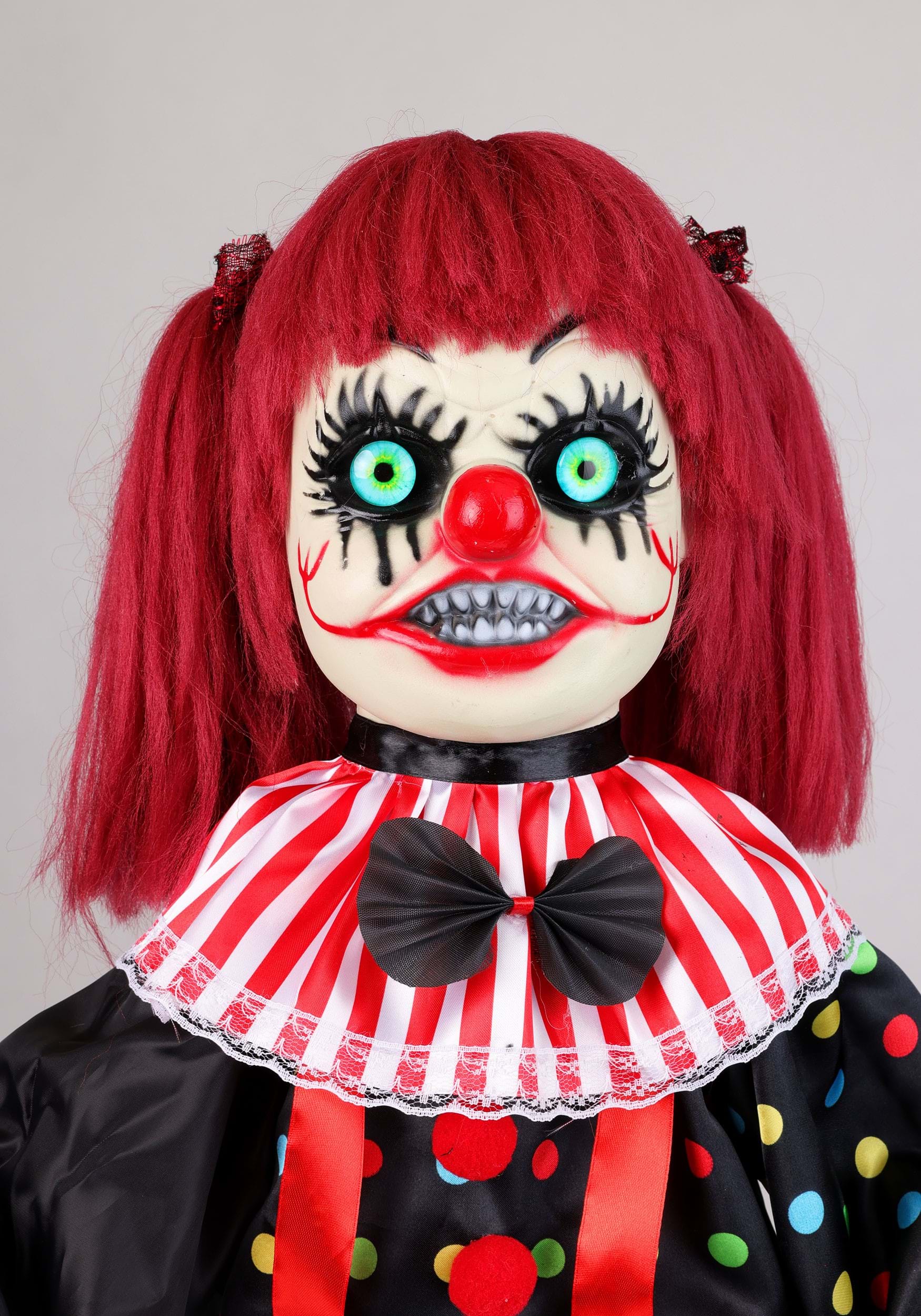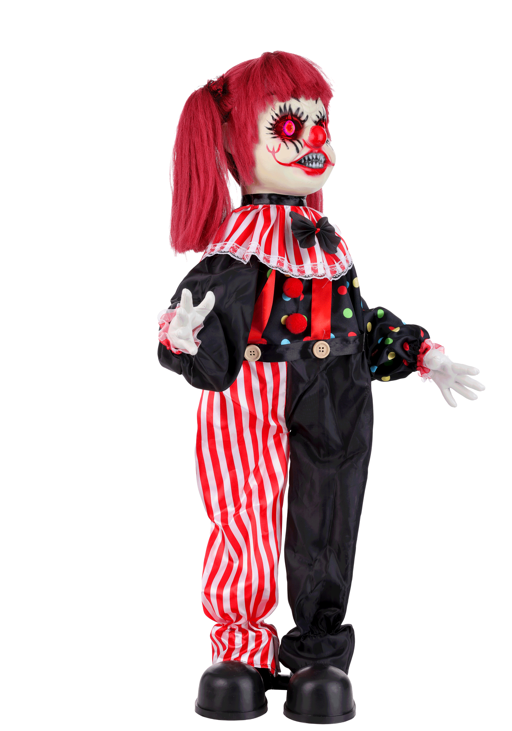Her colorful clown outfit features fabric clothing styled in bold circus patterns, complete with striped pant legs, playful buttons, and a dramatic ruffled collar. Framing her mischievous face is a bright red hairstyle that adds to her theatrical appearance. Supported by a plastic stand, Sarah remains steady while she performs her animated routine, always ready for another round of spooky entertainment.