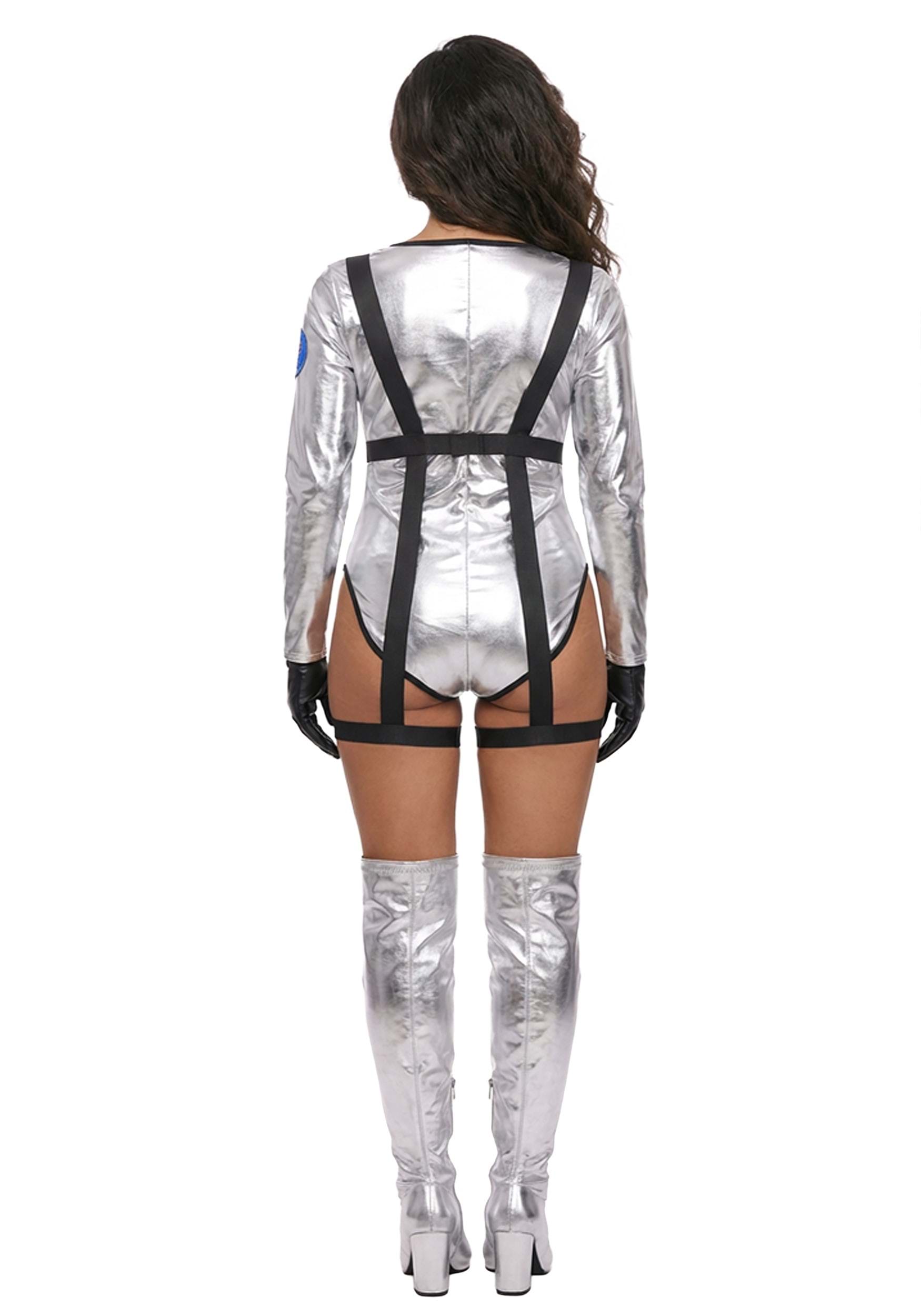 This is an exclusive Women's Sexy Silver Astronaut Costume Romper.