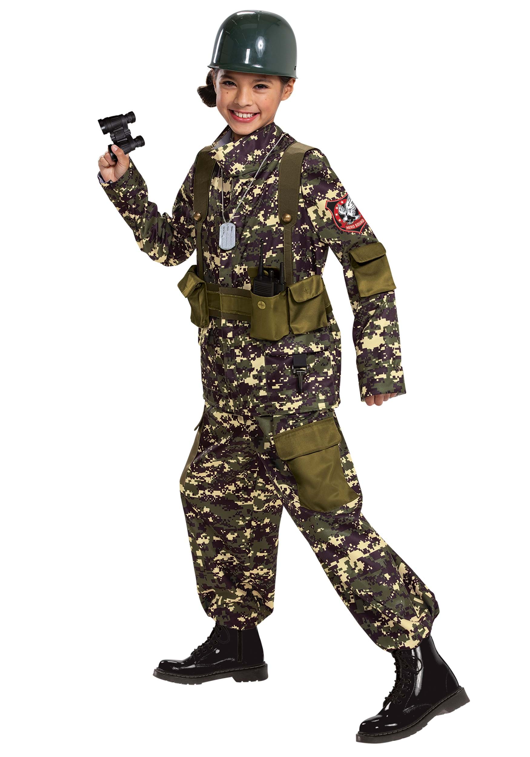 Made from 100% polyester gabardine fabric, this costume is built to withstand the toughest Halloween missions. The jacket features a convenient hook & loop fastener at the center front, making it easy to suit up and get ready for action. With functional pockets on the jacket front and left sleeve, your little soldier will have plenty of space to store their Halloween loot. Plus, a printed patch adds an authentic touch of military style.