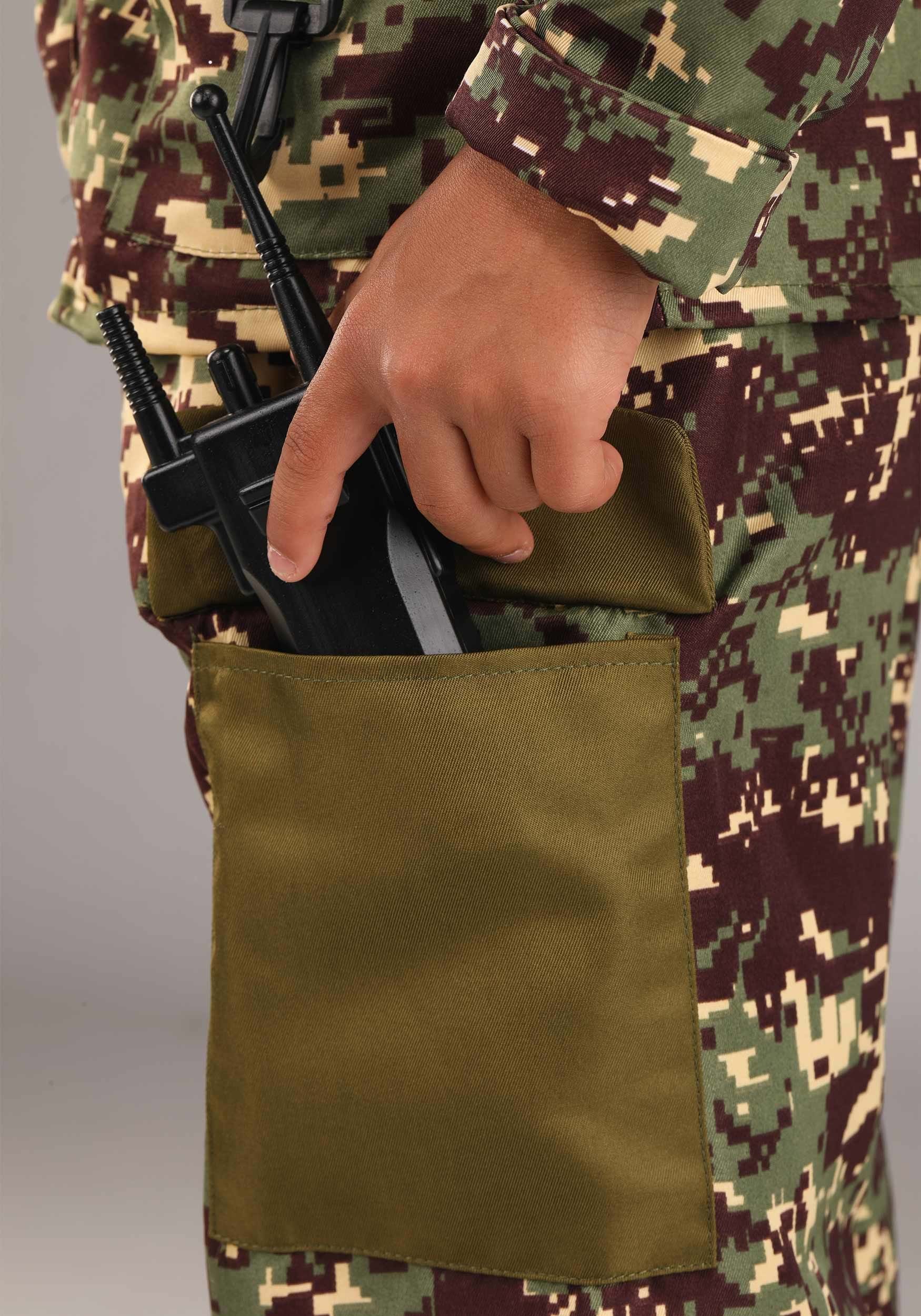 The costume also includes pants with an elastic waistband for a comfortable fit that allows for maximum mobility. Each leg features a functional pocket, perfect for storing any secret Halloween mission essentials. Whether your little soldier needs to carry extra candy or a secret decoder, these pants have got them covered.