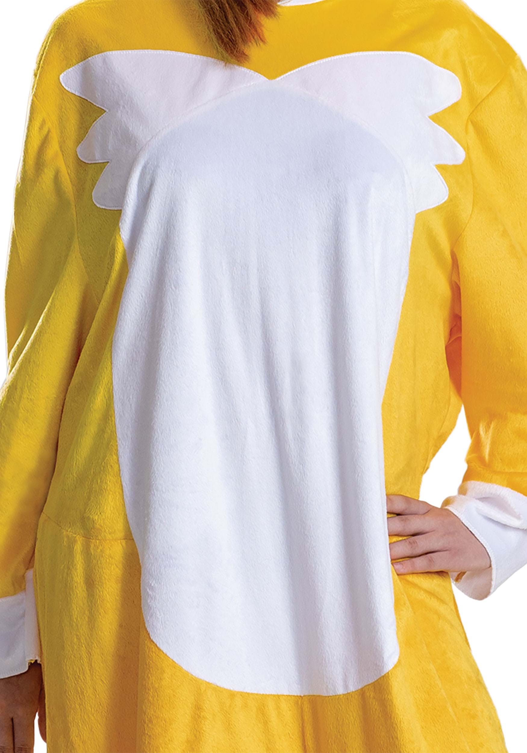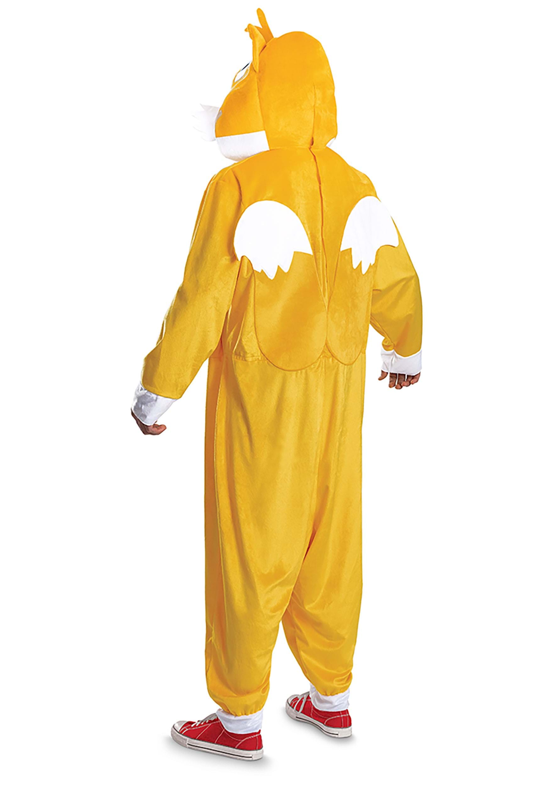 The costume includes a golden-orange hooded jumpsuit that zips you straight into character. With its oversized hood boasting Tails' signature wide blue eyes, pointy ears, and snow-white muzzle, it's a true tribute to the tech-savvy fox himself. A pair of stiffened, double tails extends playfully from the back, giving a dynamic flair with every swish and spin. Plush white tufts at the cheeks and chest complete the unmistakable Tails silhouette, while hook-and-loop fasteners in the back make suiting up a breeze.