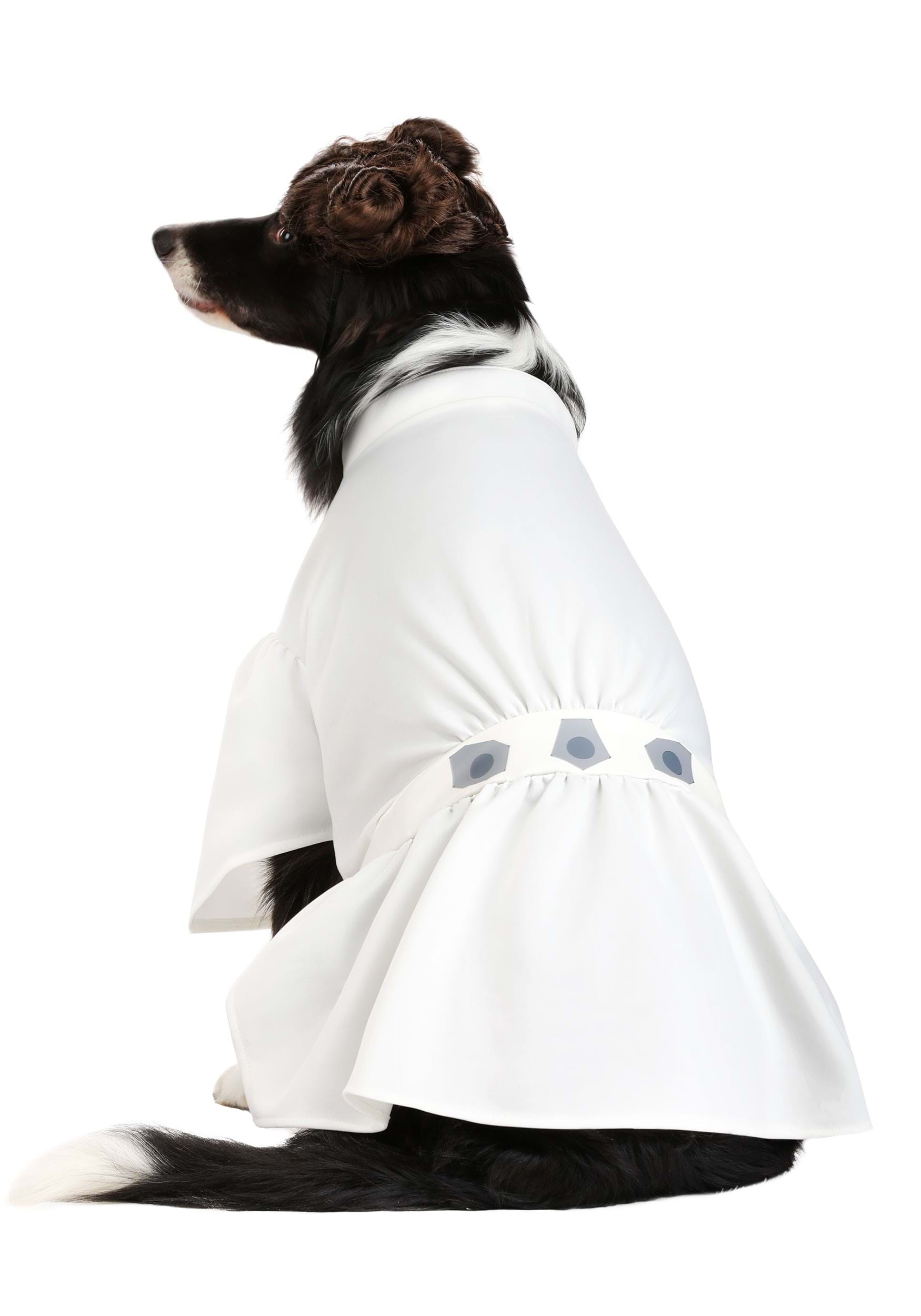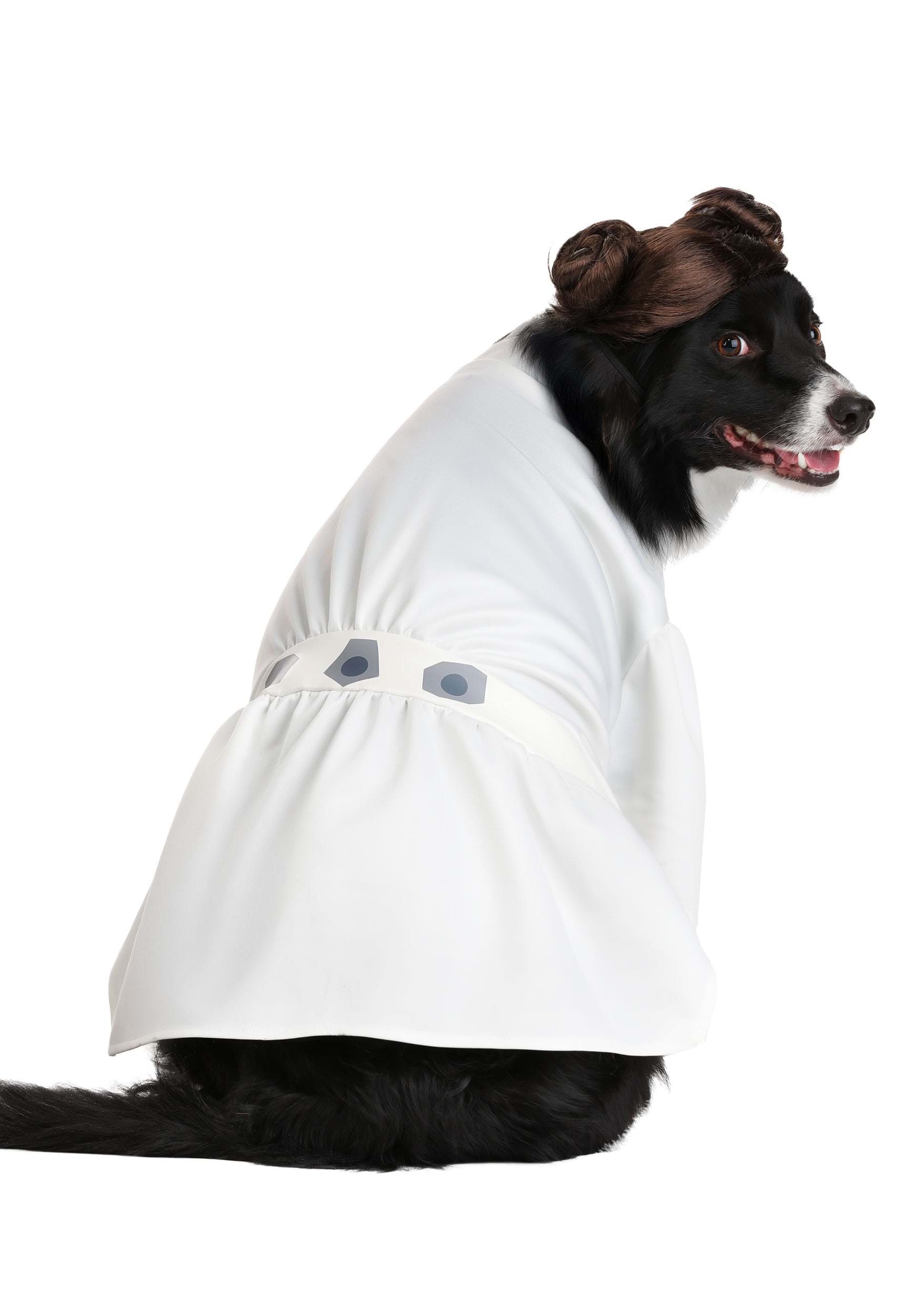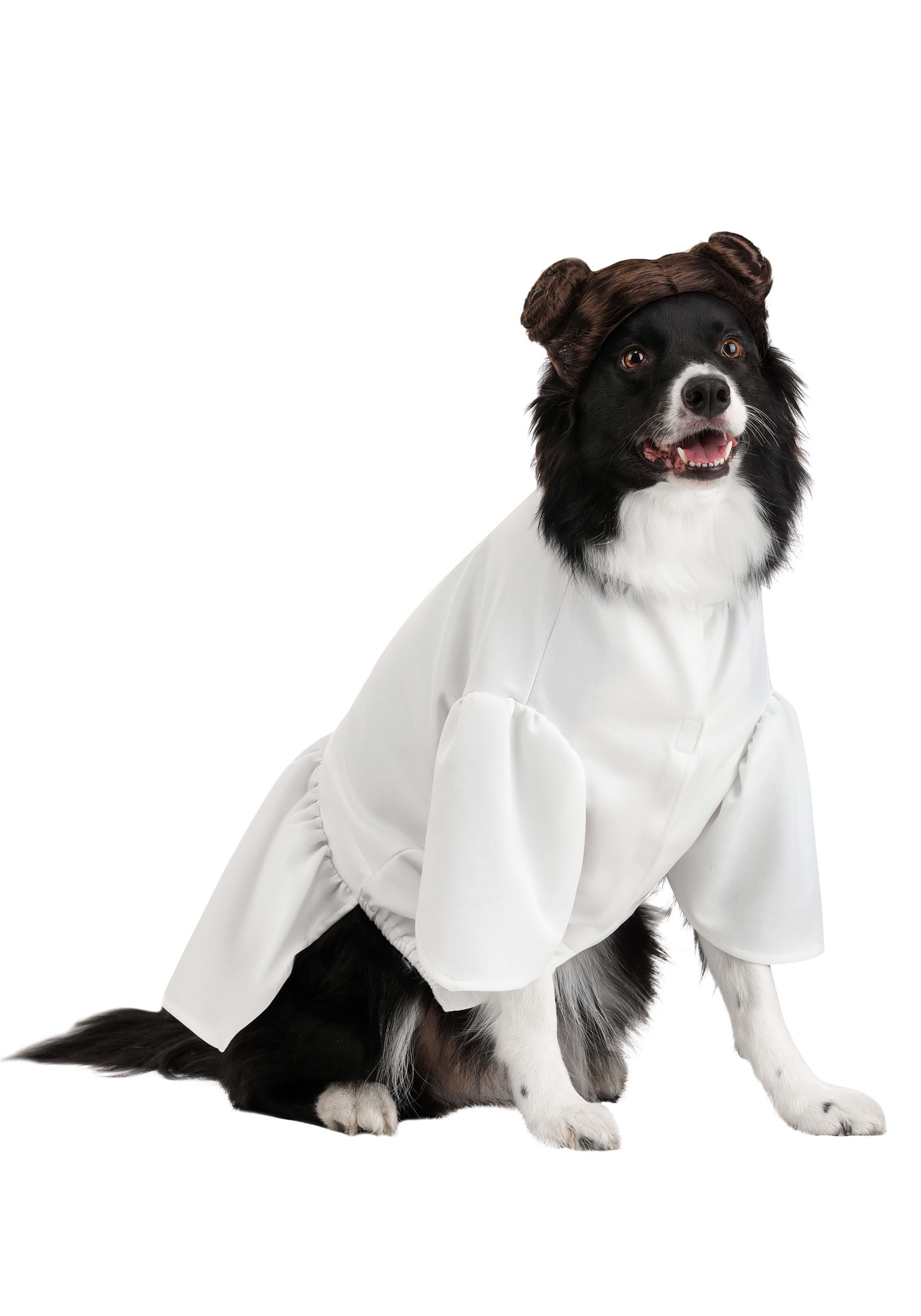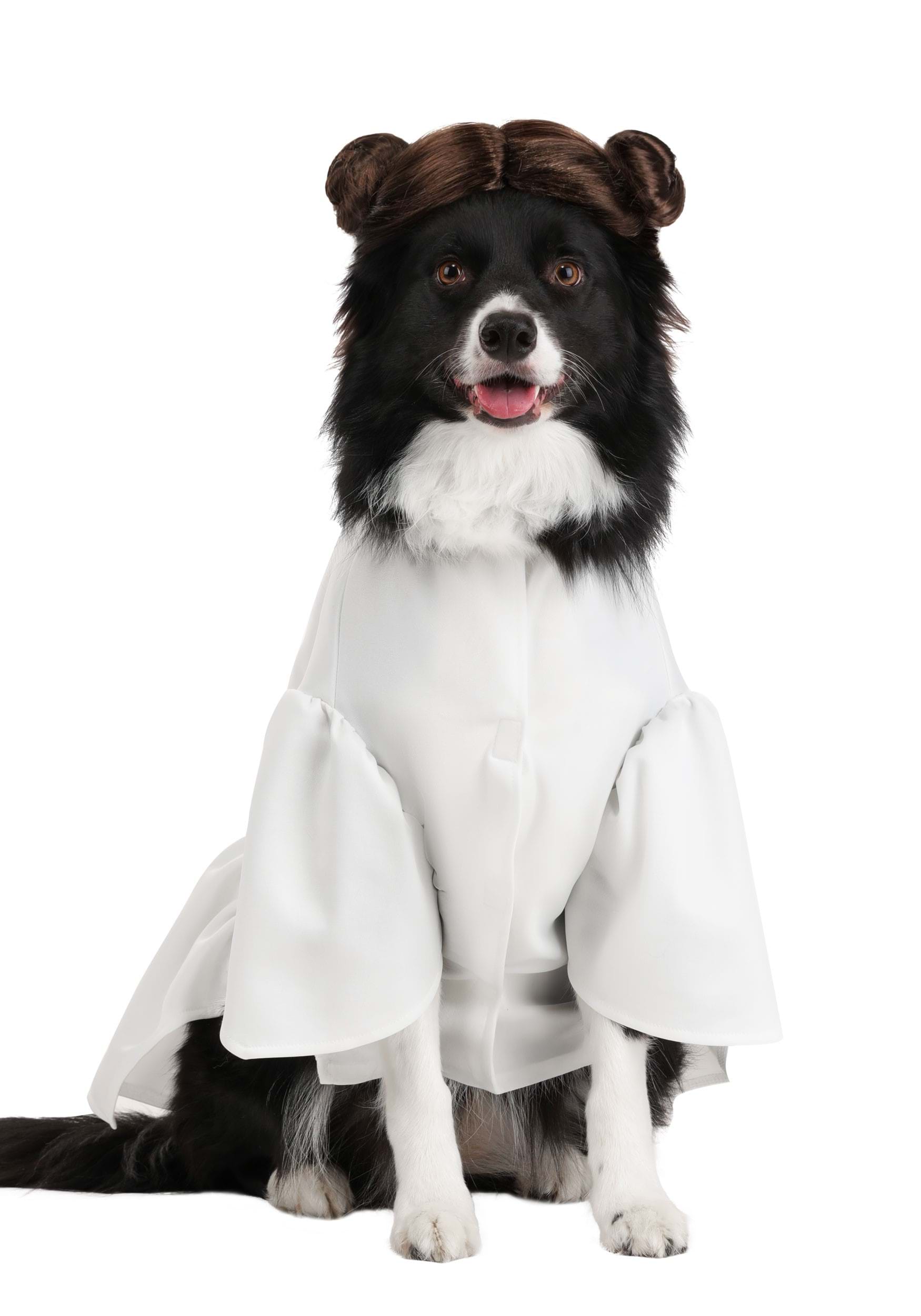 Your furry friend is ready to join the Rebel Alliance! With this Princess Leia Dog Costume, your pup can dress like the bold character from Star Wars: A New Hope™. Designed after Leia's unforgettable look from the 1977 film, this officially licensed outfit captures all the elegant charm and fearless spirit of the galaxy's favorite princess, right down to the hair buns.