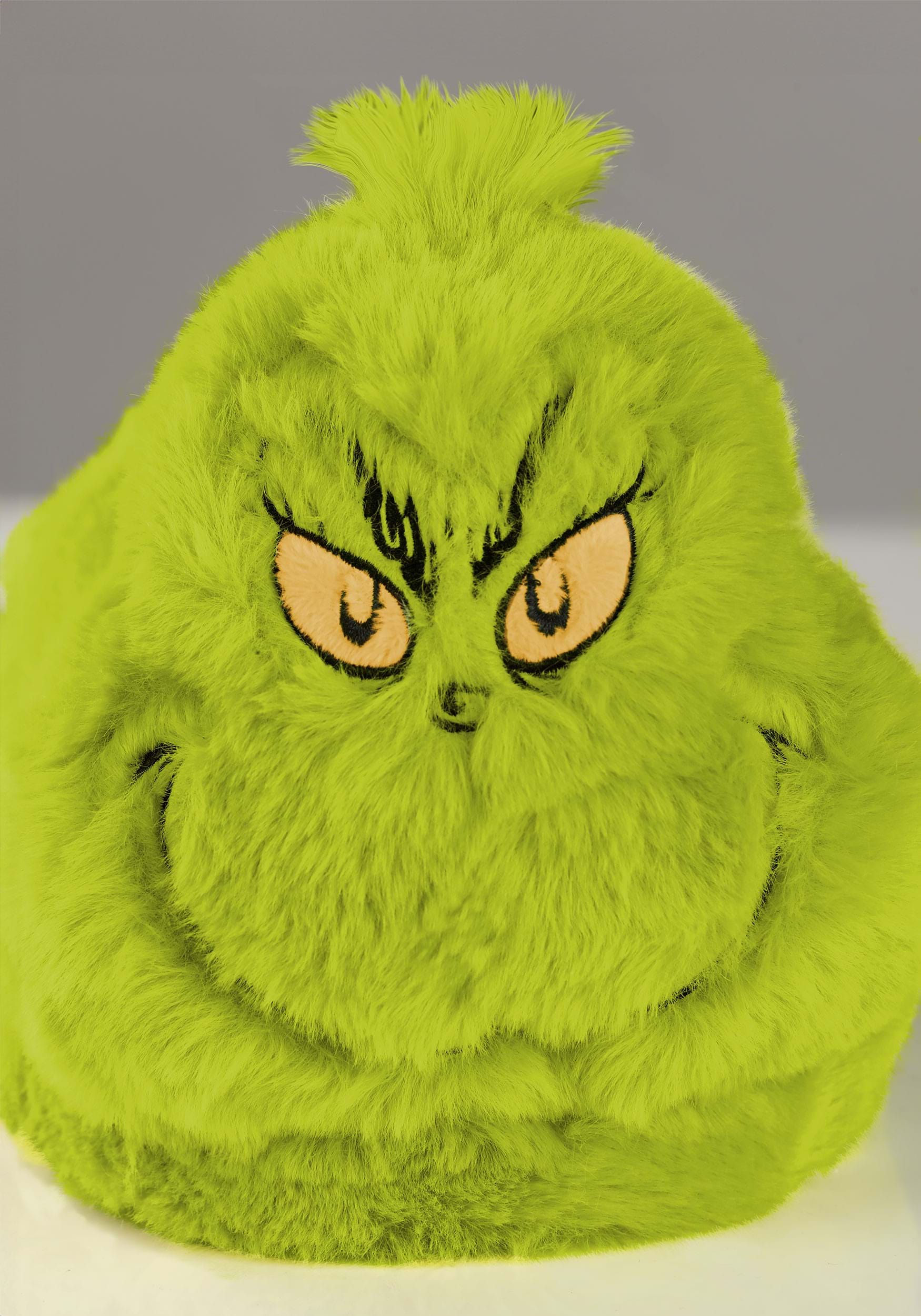 - Embroidered facial features, tuft of faux hair on top of Grinch's head