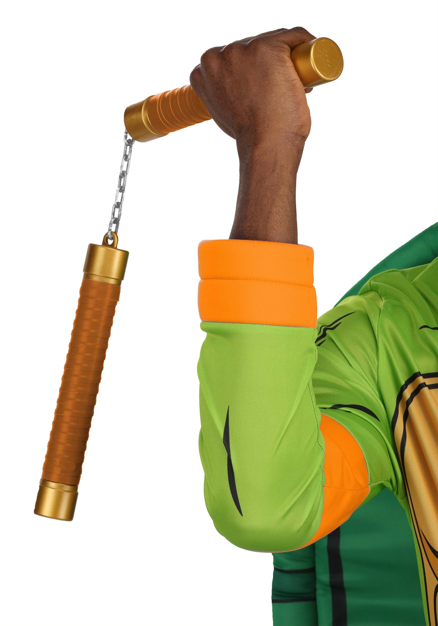 Each pair of nunchucks is crafted from molded plastic, capturing the playful but formidable look of Mikey’s signature weapons. The handles feature a sculpted grip texture and a bright orange finish—just like the orange-masked party turtle himself. The silver-colored chain links connect the two pieces with the perfect illusion of action-ready motion, while keeping things safe and lightweight for Halloween parties, conventions, or sewer-side showdowns.
