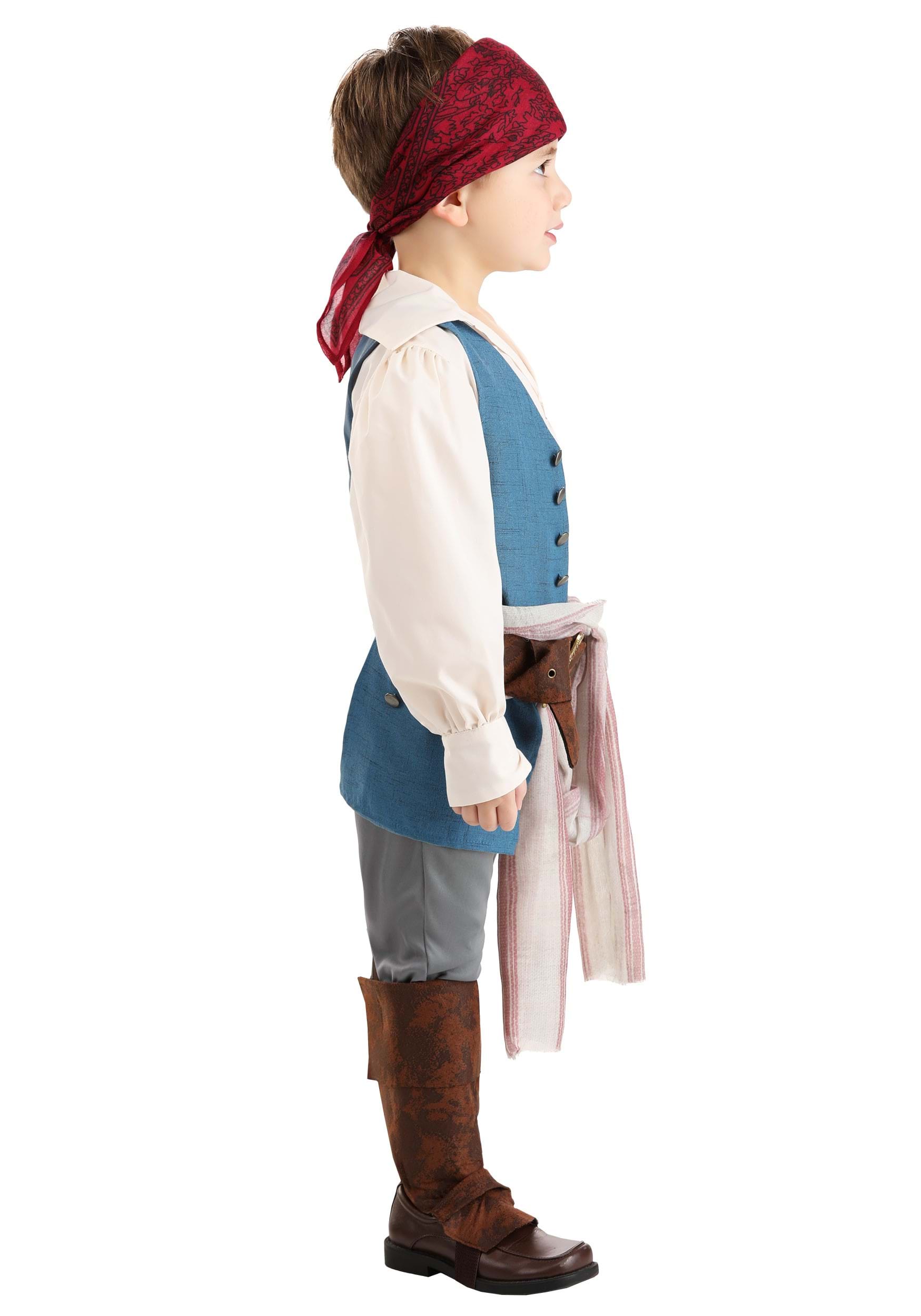 The fun begins with a billowing white broadcloth shirt and a layered blue vest featuring metallic buttons. Rugged brown pants pair with a bold red bandana, detailed fabric sash, and a faux leather belt. Faux leather boot tops are also included to ensure your child looks the part from head to toe.