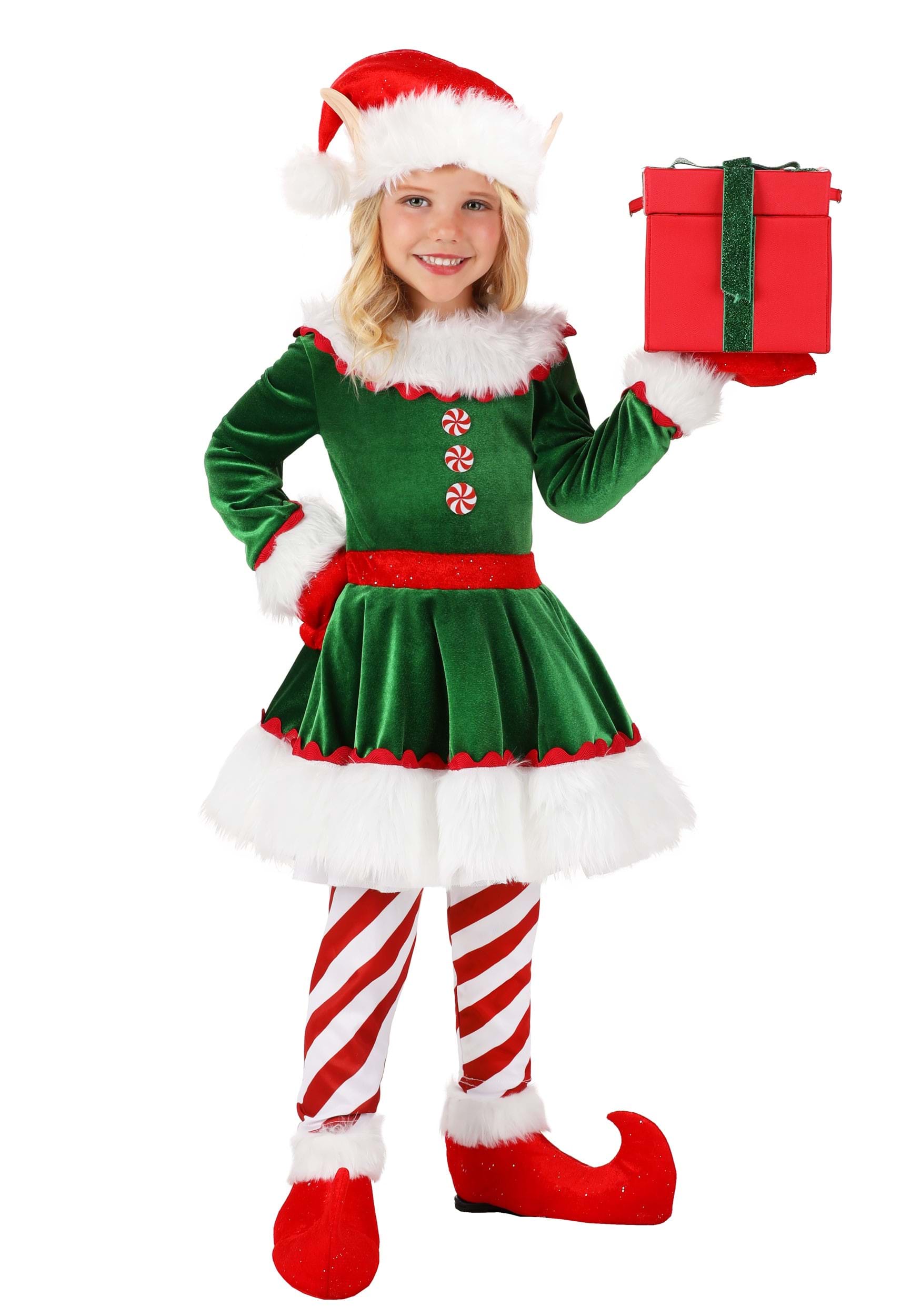 The centerpiece of the ensemble is a rich green velour dress, trimmed with fluffy faux fur along the hem, cuffs, and neckline. Decorative peppermint buttons down the front add a sweet twist, while red ricrac trim ties it all together in true North Pole fashion. An elastic waistband makes dressing easy, and a tulle underskirt adds bounce and twirl appeal for active little elves.