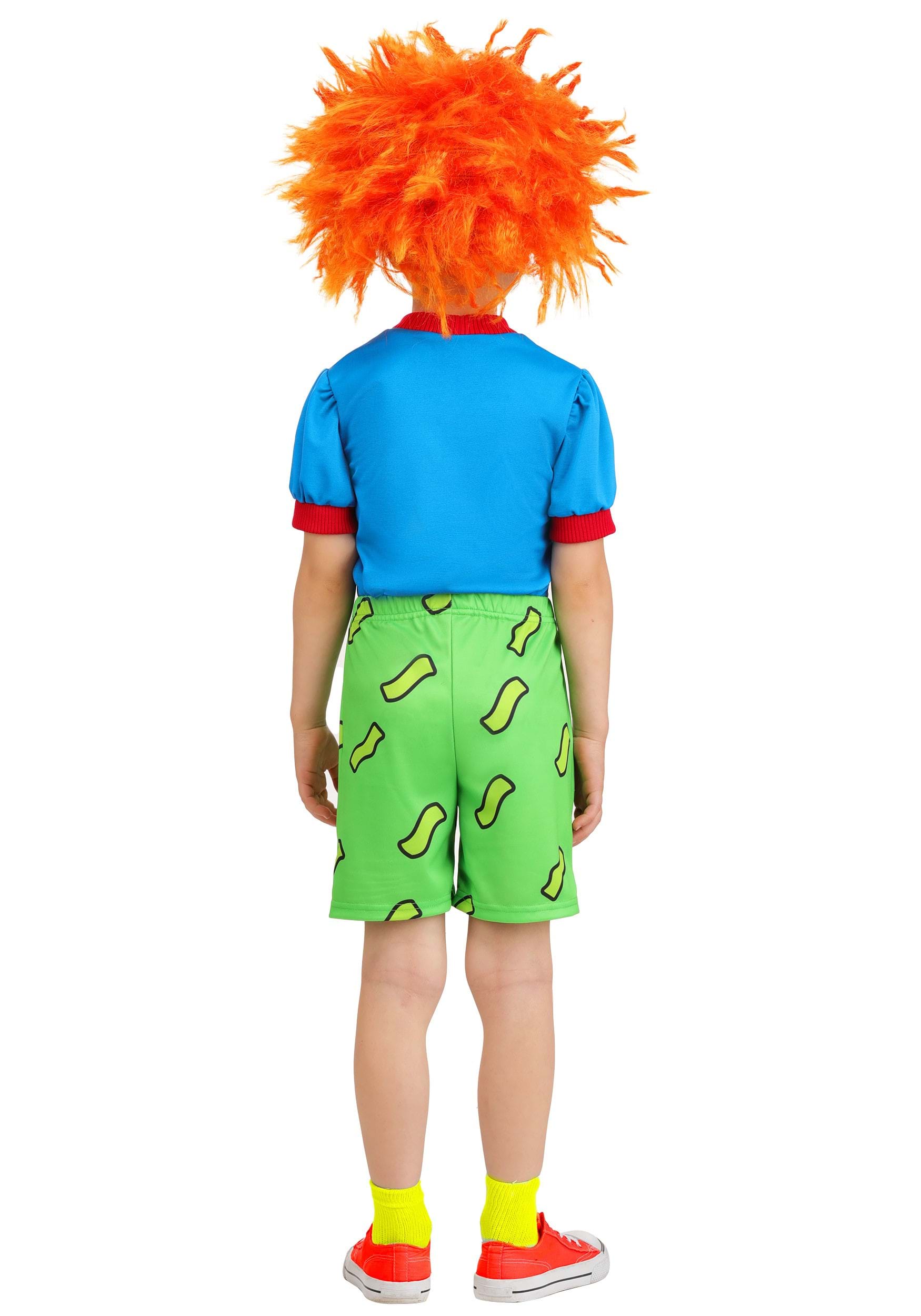 The short-sleeved blue shirt features Chuckie’s signature red rib-knit collar and sleeve cuffs, along with the iconic yellow-and-red planet printed right on the chest. The green shorts are patterned with abstract squiggles just like in the original cartoon and have an elastic waistband for a snug, comfortable fit during playtime or trick-or-treating.