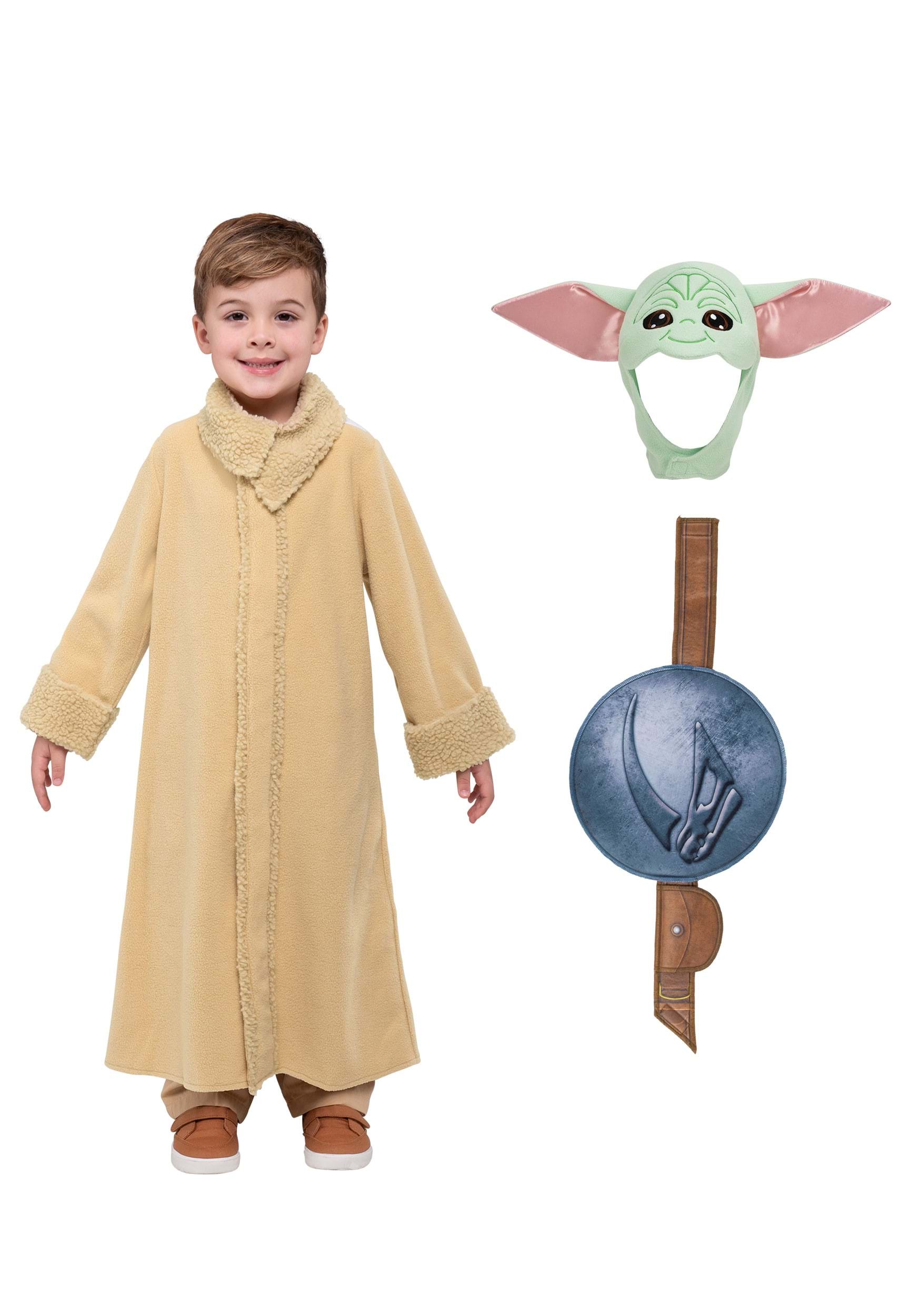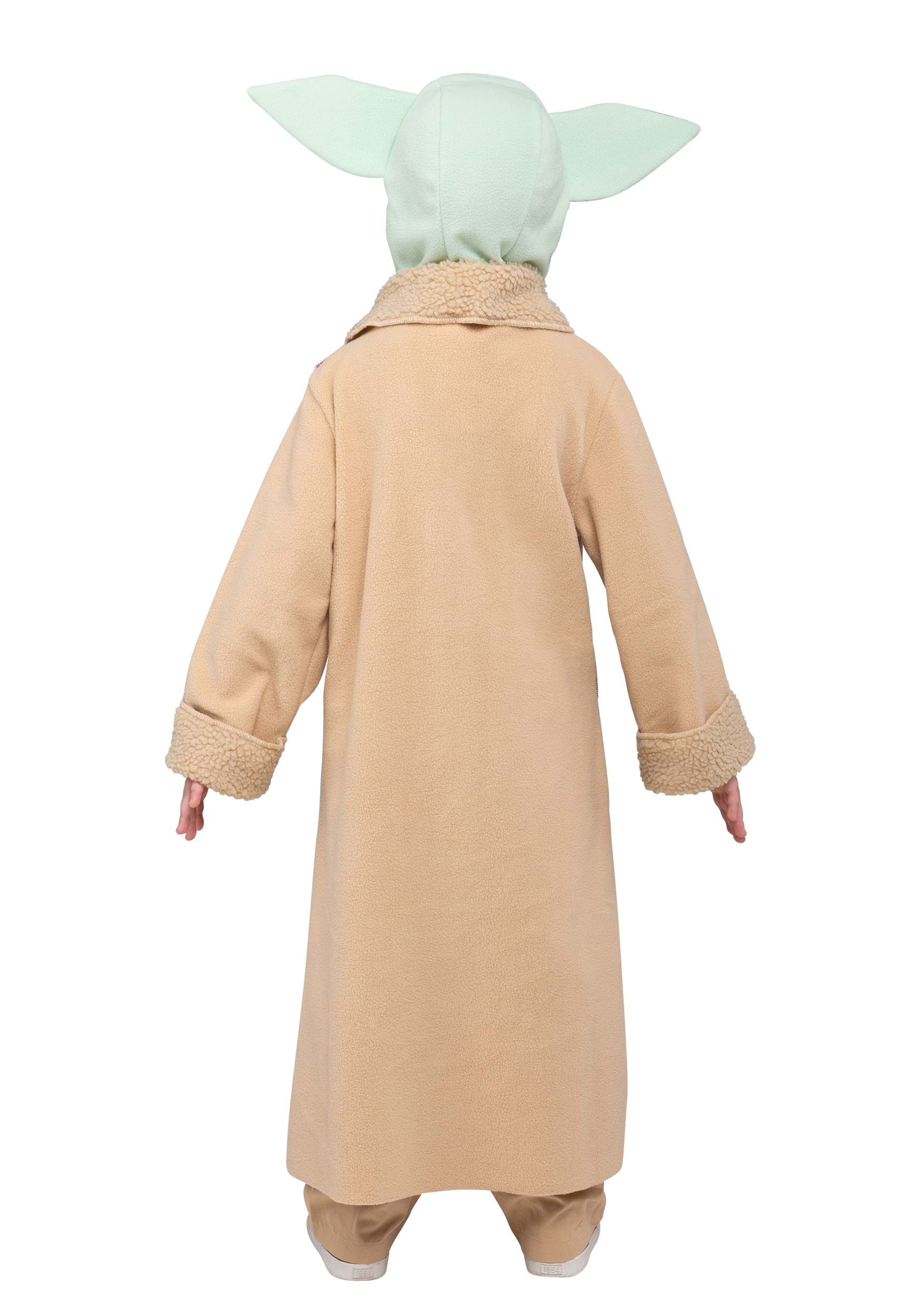 The centerpiece of this look is a full-length fleece robe in that signature warm tan hue, falling gracefully to the ankles just like the one Grogu wears on screen. Soft faux sherpa trim lines the collar and cuffs, giving the costume a cozy, high-quality feel that parents will appreciate as much as the kids wearing it. The earthy, worn-in color palette perfectly captures Grogu's humble yet mysterious wanderer aesthetic.