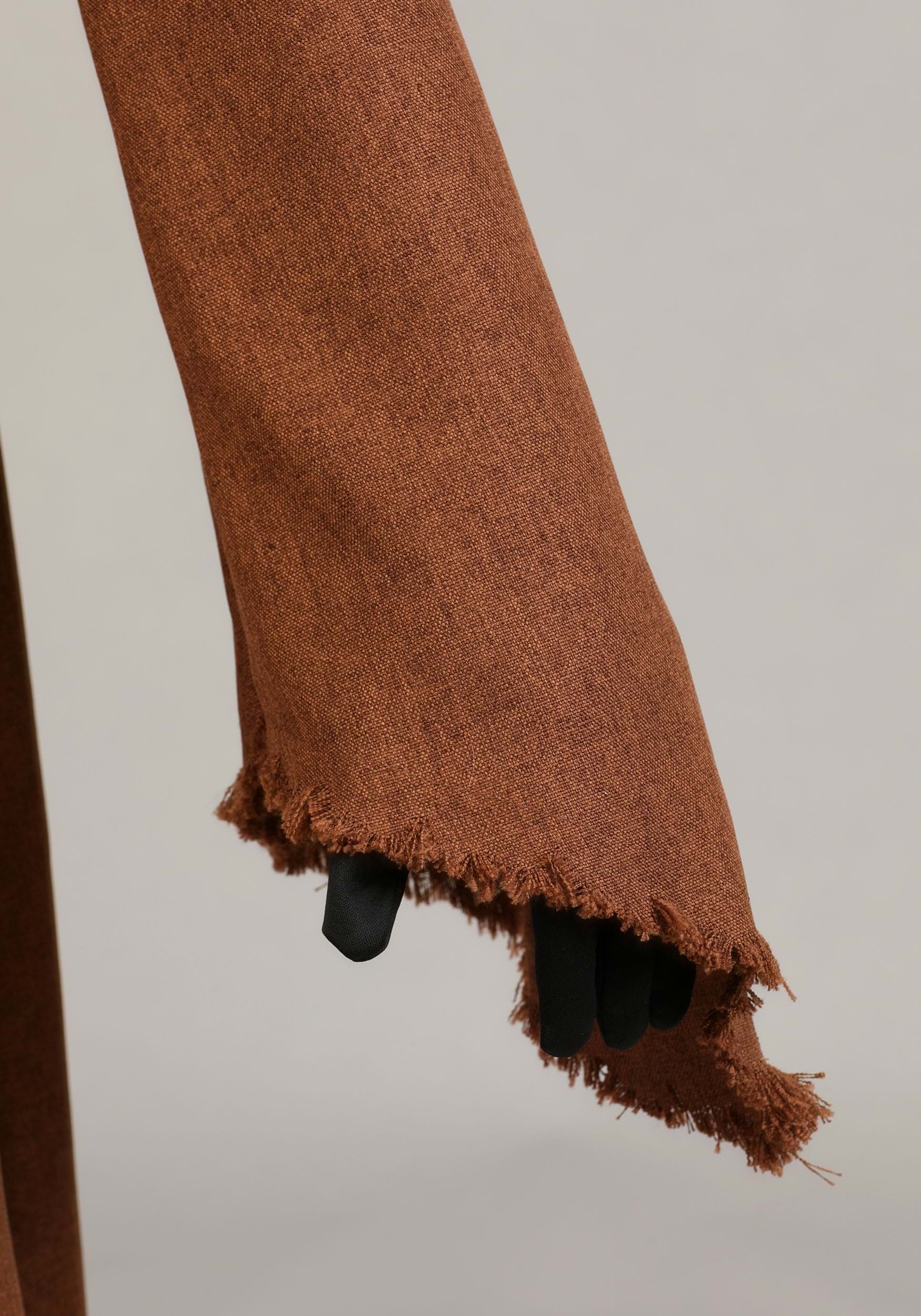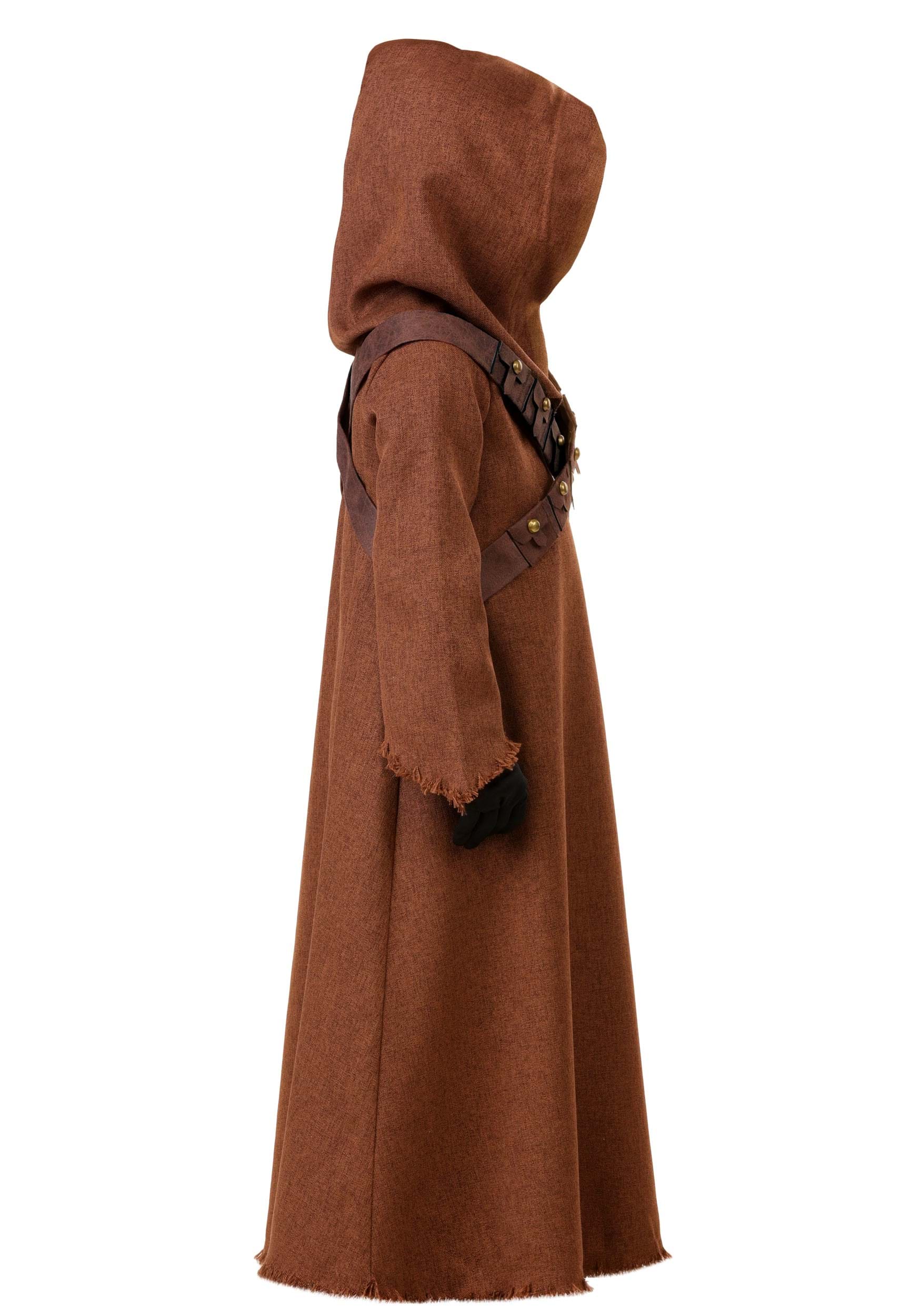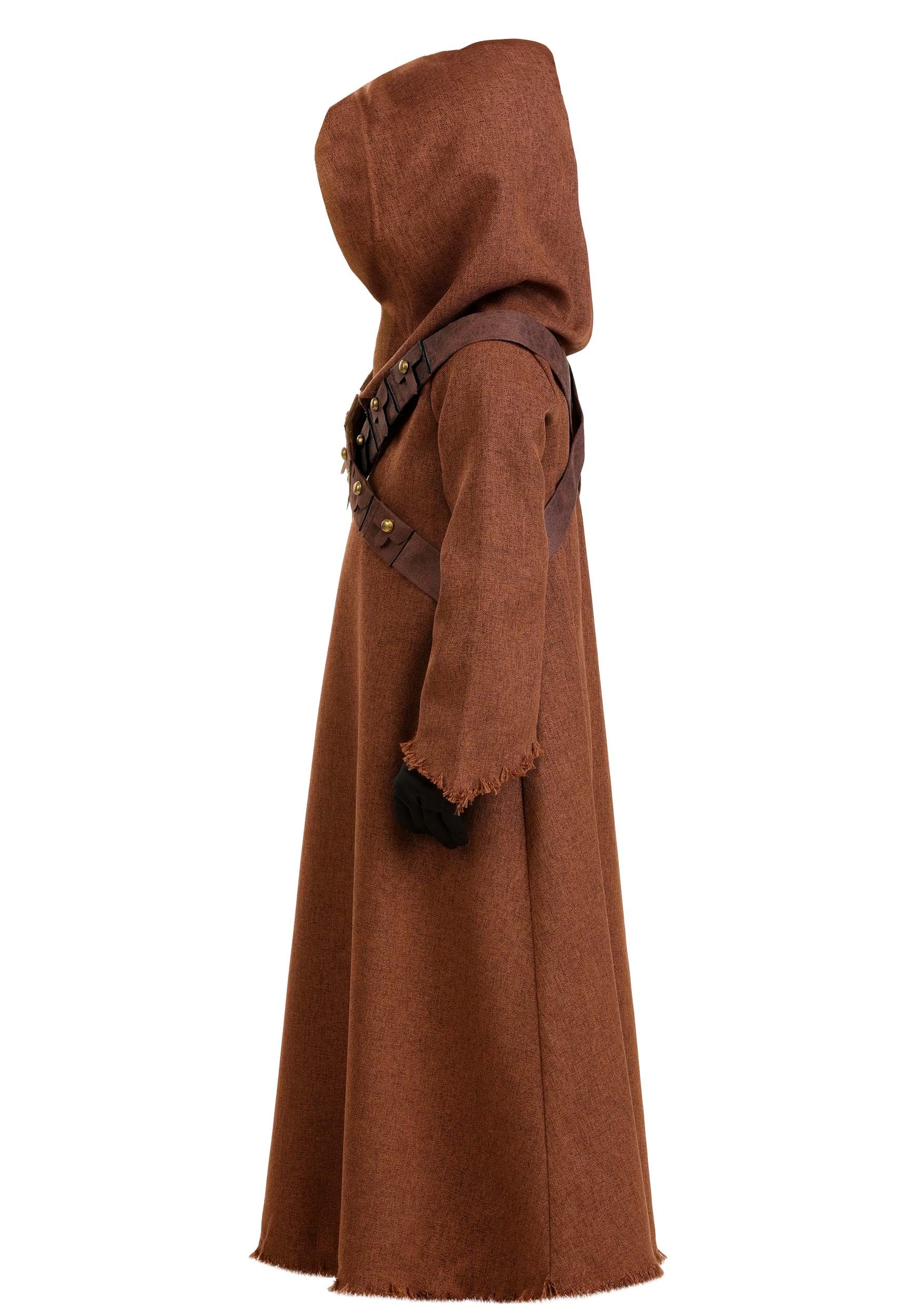 The costume begins with a soft, brown tunic that's both comfortable and durable for tiny adventurers. Designed to mimic the worn look of a seasoned Jawa, the tunic features distressed edges at the cuffs and hem, adding a touch of realism. Hook-and-loop fasteners at the back of the neck make dressing quick and easy, so your little one is ready for their next collection in no time.